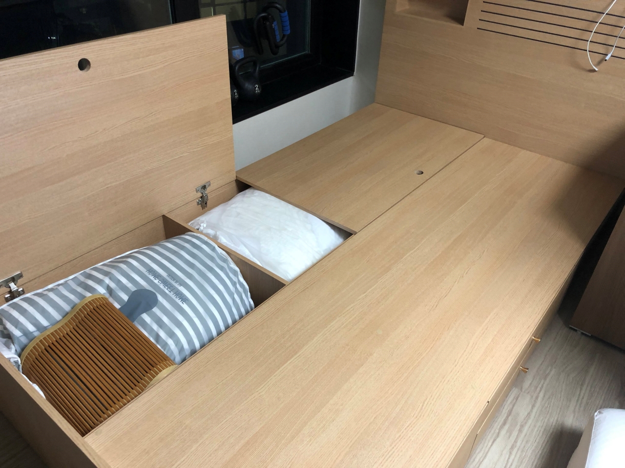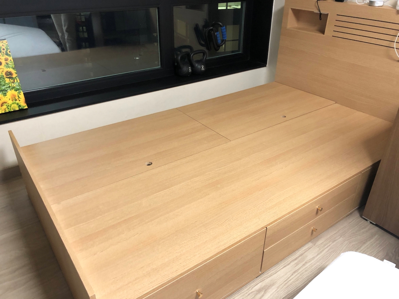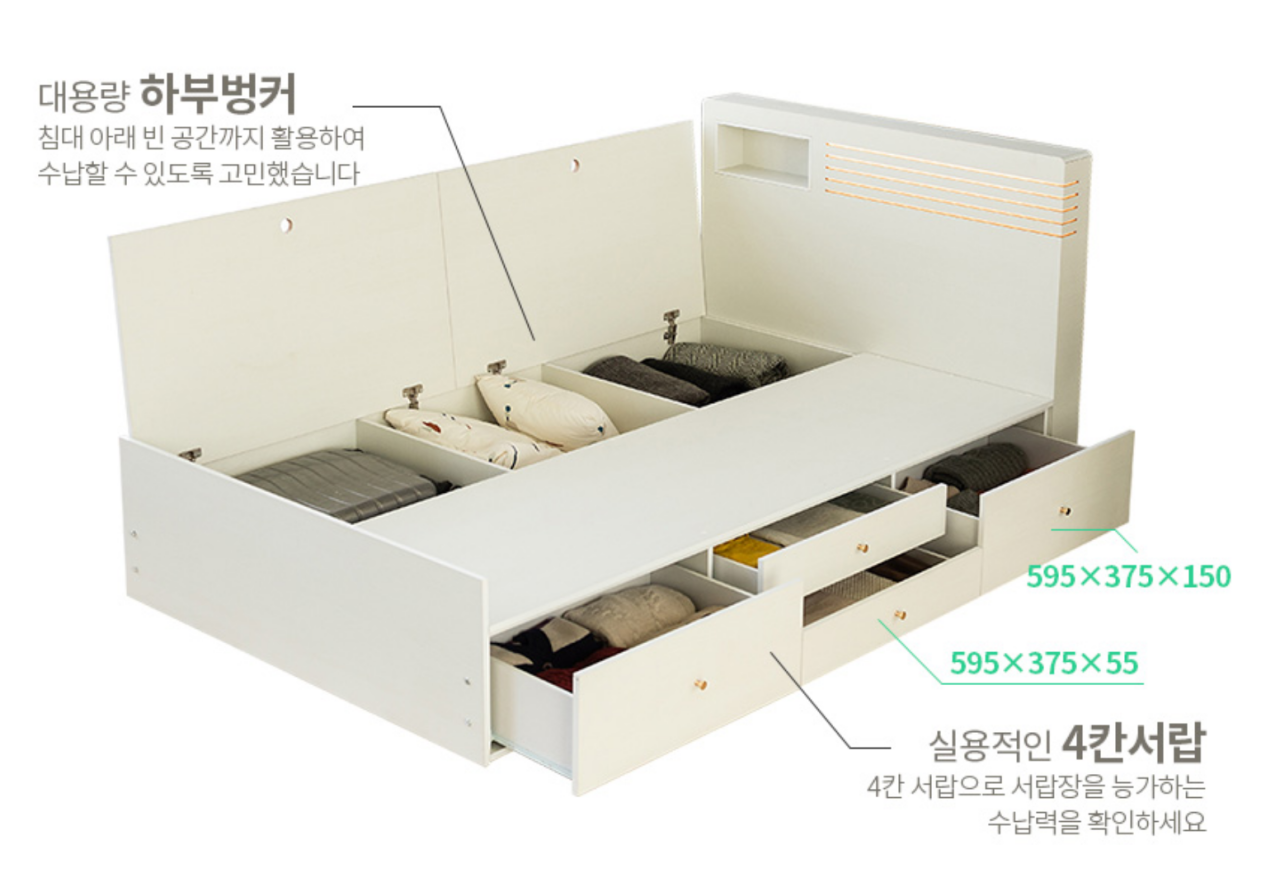 대용량 하부벙커와 실용적인 4칸 서랍이 있어 잡다한 물품들이나 제철이 지난 옷 등을 보관하기 아주 좋다. 수납 침대의 장점이라 할 수 있을 듯하다. 생각보다 공간이 넓어 잘 쓰고 있다.