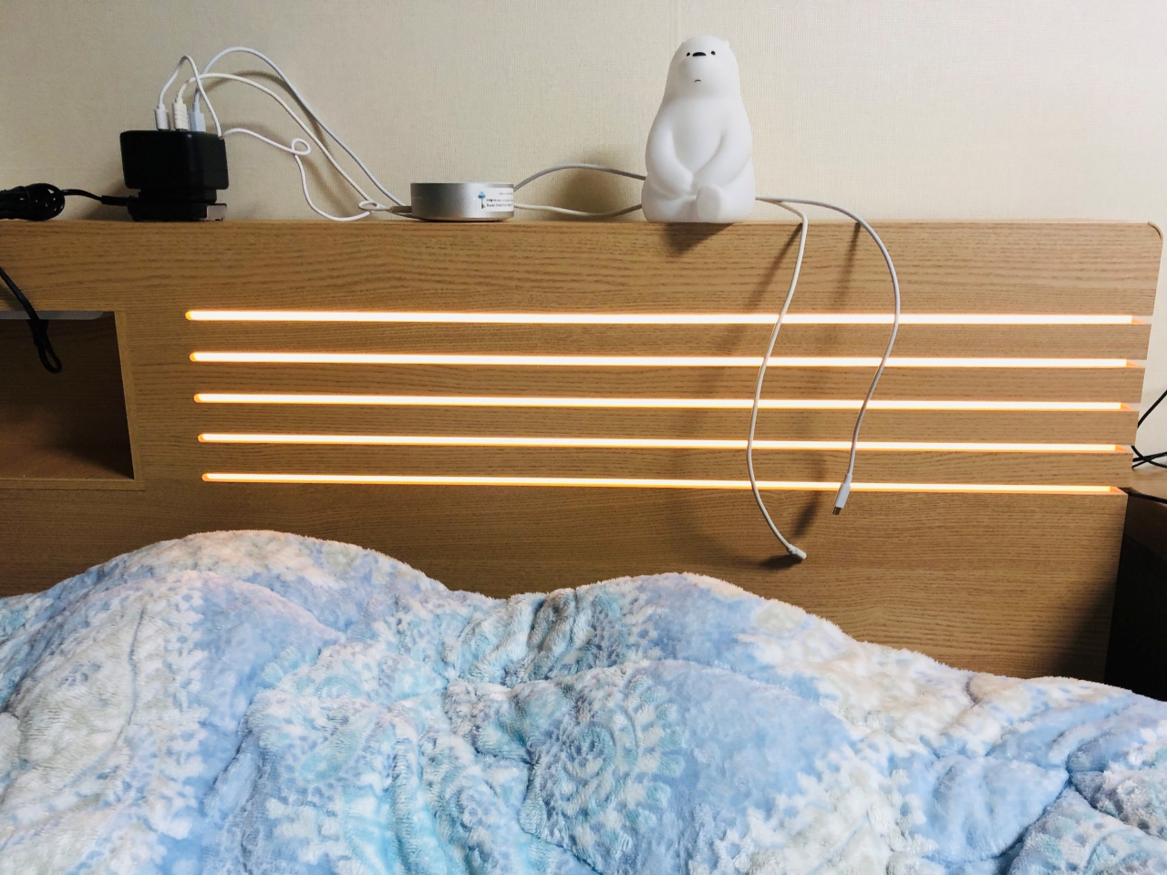 전기콘센트가 침대 헤드 왼쪽에 있고 아래로 보고 있어 전기플러그를 꼽으면 아래사진 처럼 선이 지저분하게 보인다. 상단에 전기 콘센트가 있고 홈이 있으면 좀 더 선정리가 예쁘게 될 수 있을 것 같다.