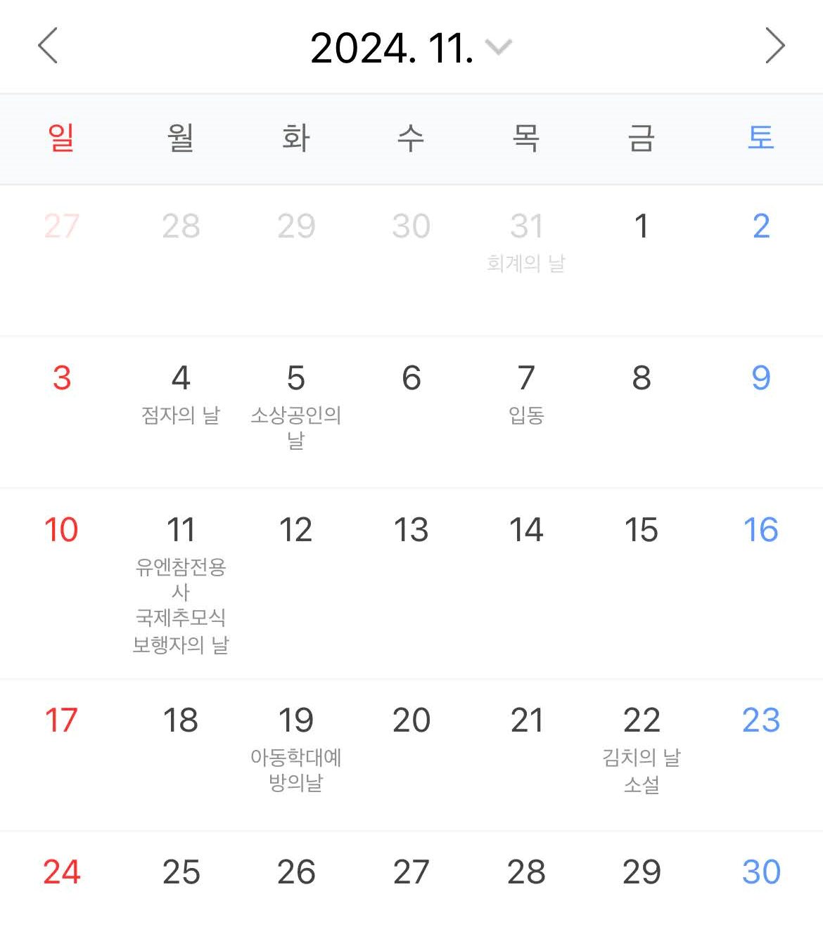 10월에는 개천절(10/3), 한글날(10/9)이 공휴일인데 이번에 국군의 날(10/1)이 임시공휴일로 지정되면서 9/30, 10/2, 10,4, 10/7~10/8 5일 연차를 쓸 경우 9월 28일부터 10월 9일까지 장장 총 12일간의 황금 연휴를 즐길 수 있다. 11월에는 공휴일이 없다. 12월에는 크리스마스(12/25)이 수요일이라 연휴가 없다.