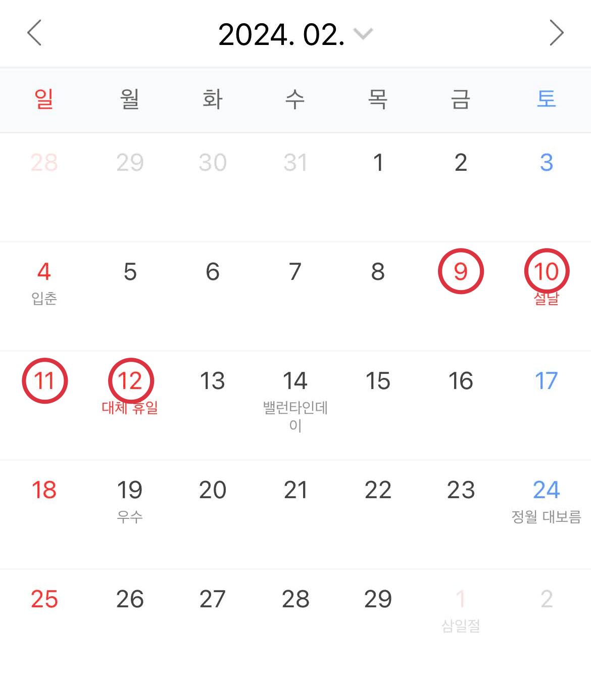 주5일 근무를 기준으로 하면 신정(1/1)이 월요일이라 12/30~1/1 3일간 연휴이다. 2월에는 설날이 있는데 설날 다음날이 일요일인 관계로 월요일이 대체휴일이 돼 2/9~2/12 총 4일간 설날 연휴가 된다. 3월1일 삼일절은 금요일이라 3/1~3/3 삼일간 연휴이다.