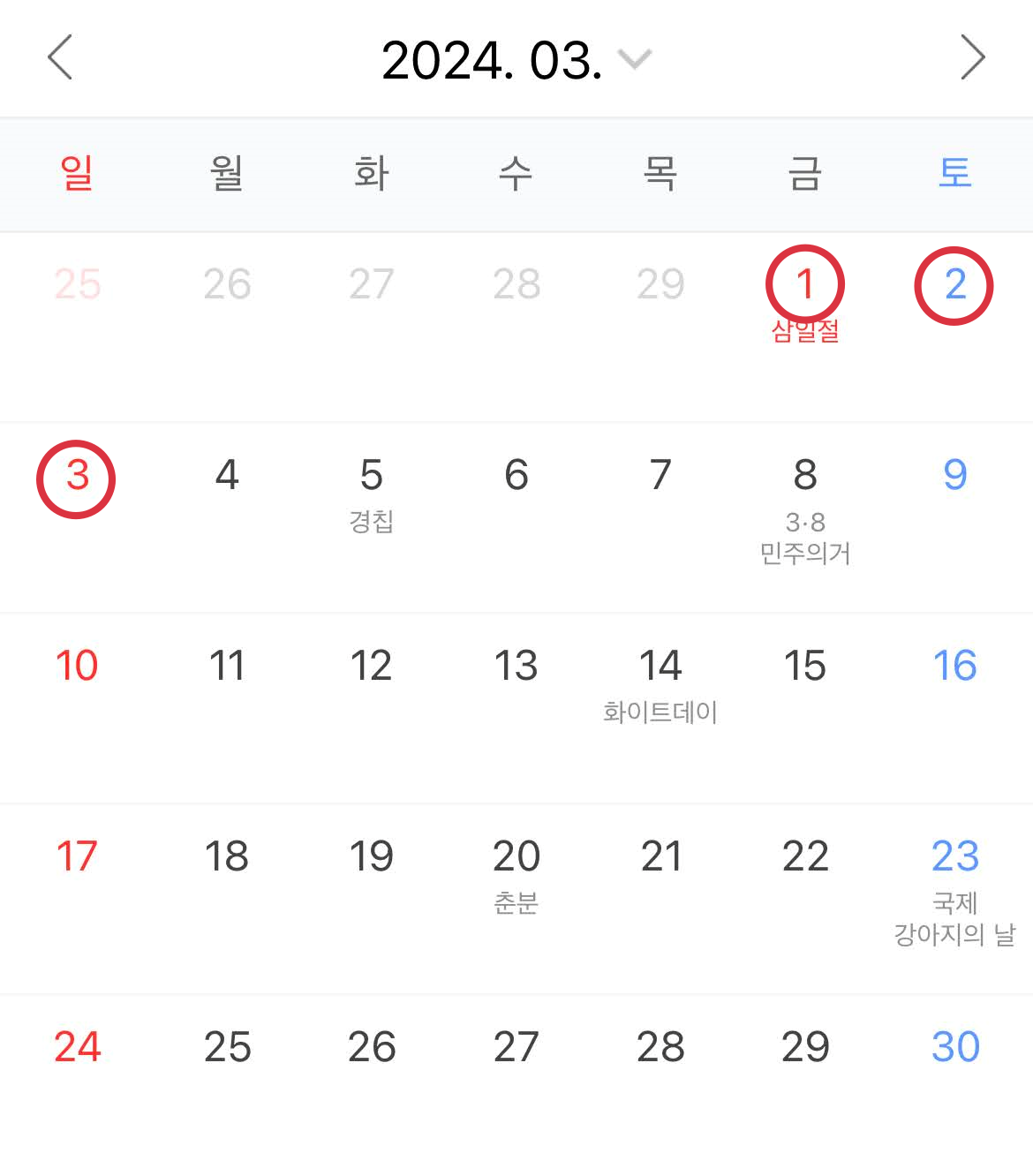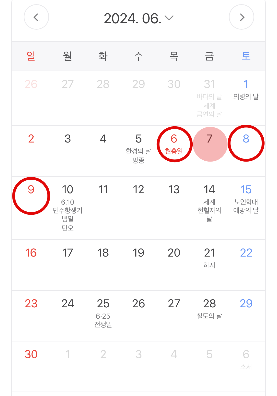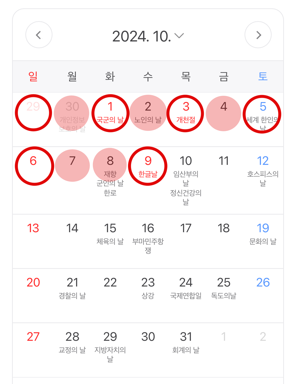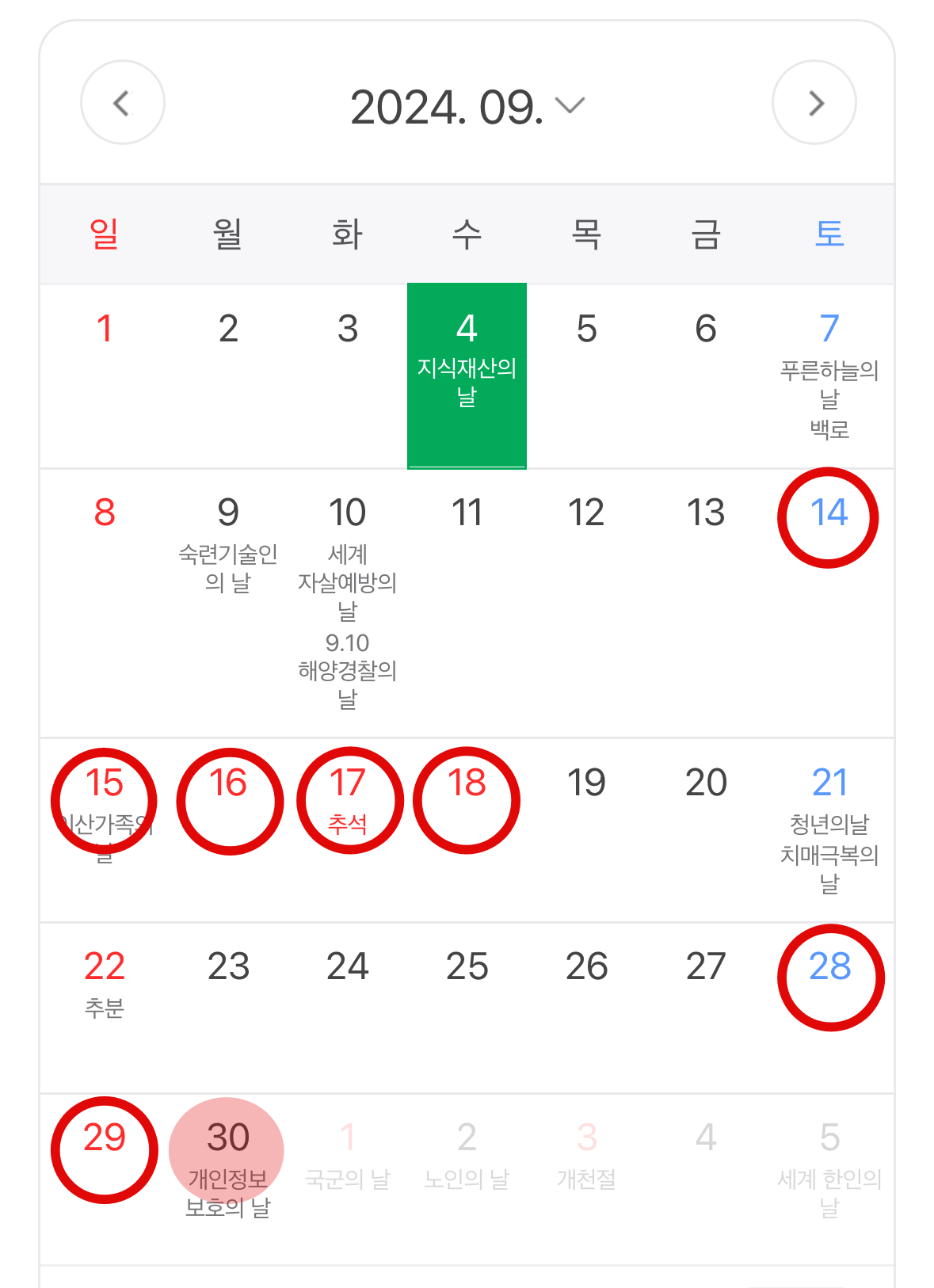 특이한 점은 현충일(6/6일), 광복절(8/15일), 개천절(10/3일)이 목요일이라 금요일 하루 연차를 쓸 경우 4일 연휴로 쉴 수 있다는 것