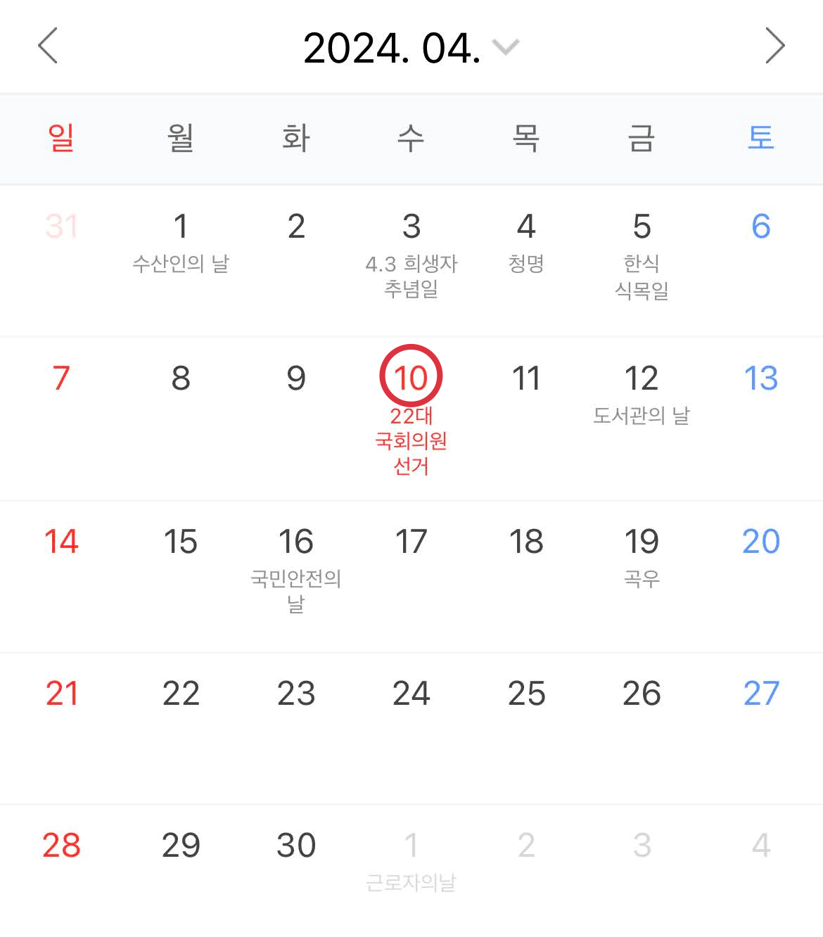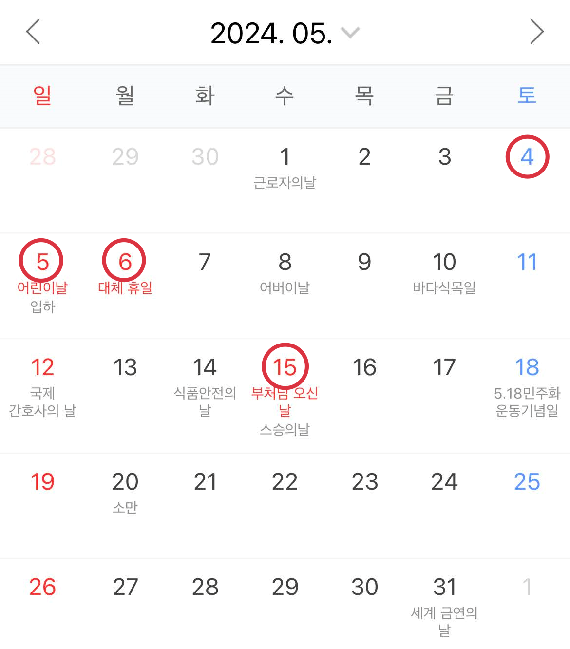 4월은 원래 공휴일이 없지만 2024년에는 4월10일이 국회의원 선거일이라 쉬게 된다. 5월달에는 어린이날(5/5)이 일요일이라 6일 월요일이 대체휴일이 되며 5/4~5/6 3일간 연휴가 된다. 부처님 오신날(5/15)은 수요일이라 하루만 쉬게 된다. 6월달에는 현충일(6/5)이 목요일이라 금요일 하루 연차를 쓰게 되면 6/6~6/9 4일간 연휴를 즐길 수 있다.