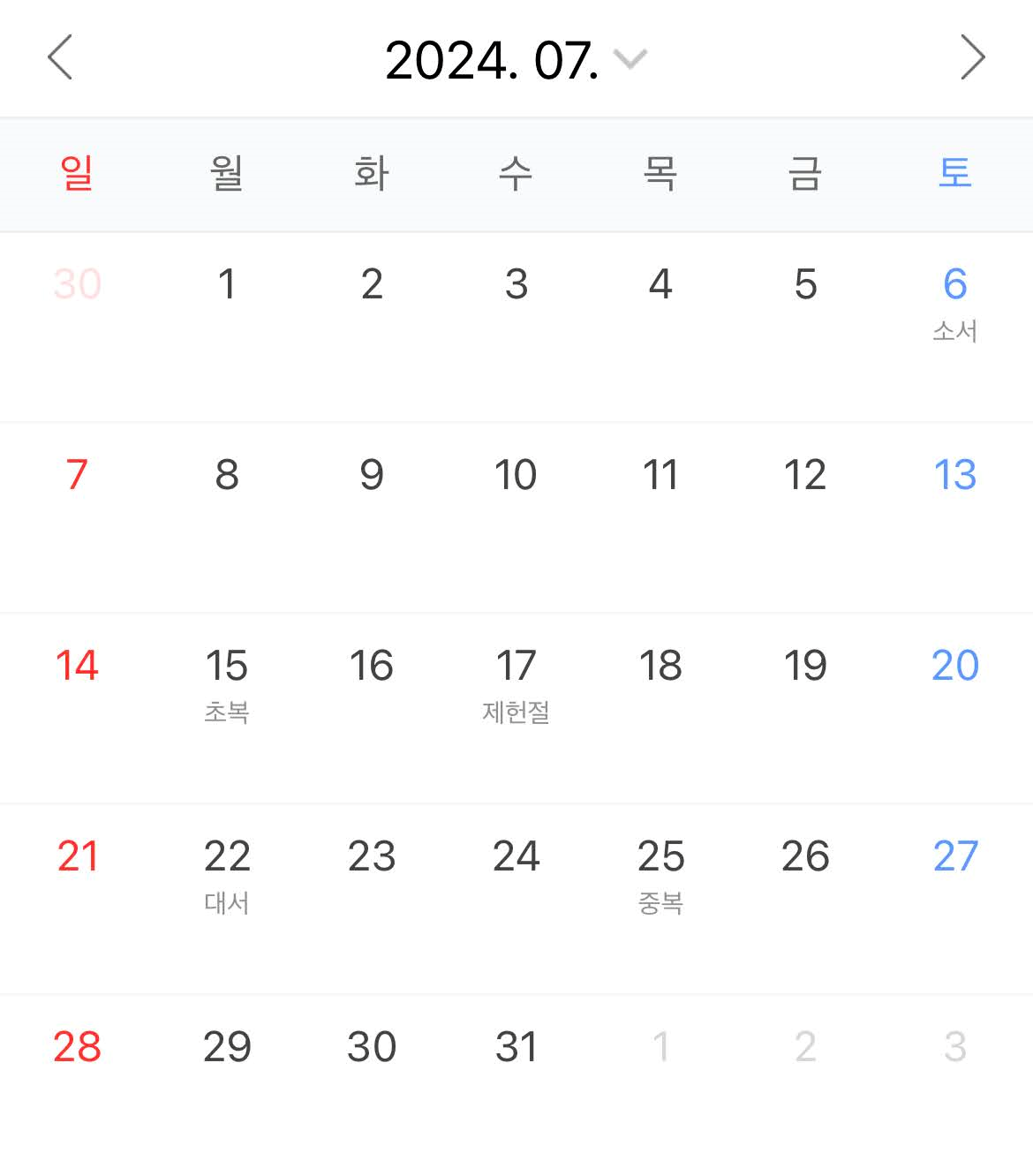 7월은 공휴일이 없다. 8월에는 광복절(8/15)이 목요일이라 금요일 하루 연차를 쓰면 8/15~8/18 4일간 연휴를 즐길수 있다. 9월에는 추석연휴가 있는데 9/14일 부터 9/18일까지 5일간 연휴이다.