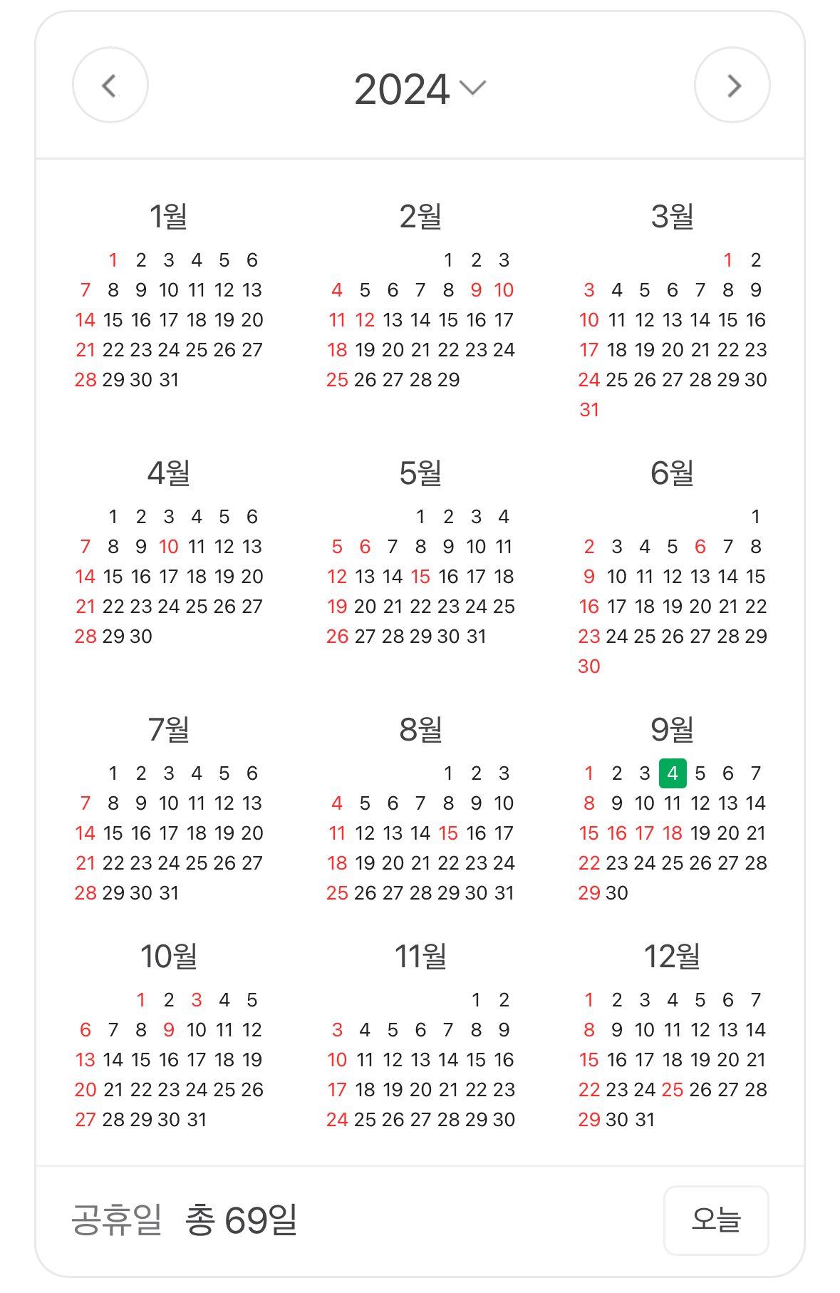 2024년은 용의 해로 공휴일(빨간 날)은 국회의원선거일, 대체휴일 2일을 포함해 총 68일이다. 4월 10일은 국회의원선거일이라 공휴일로 쉬게 되며 설날 다음날과 어린이날이 일요일이라 월요일이 대체휴일로 쉬게된다. 주 5일제를 실시하는 기관의 경우에는 토요일 포함 총 휴일수는 119일며, 5월 1일 근로자의 날에 쉴 경우 총 휴일수는 120일이다