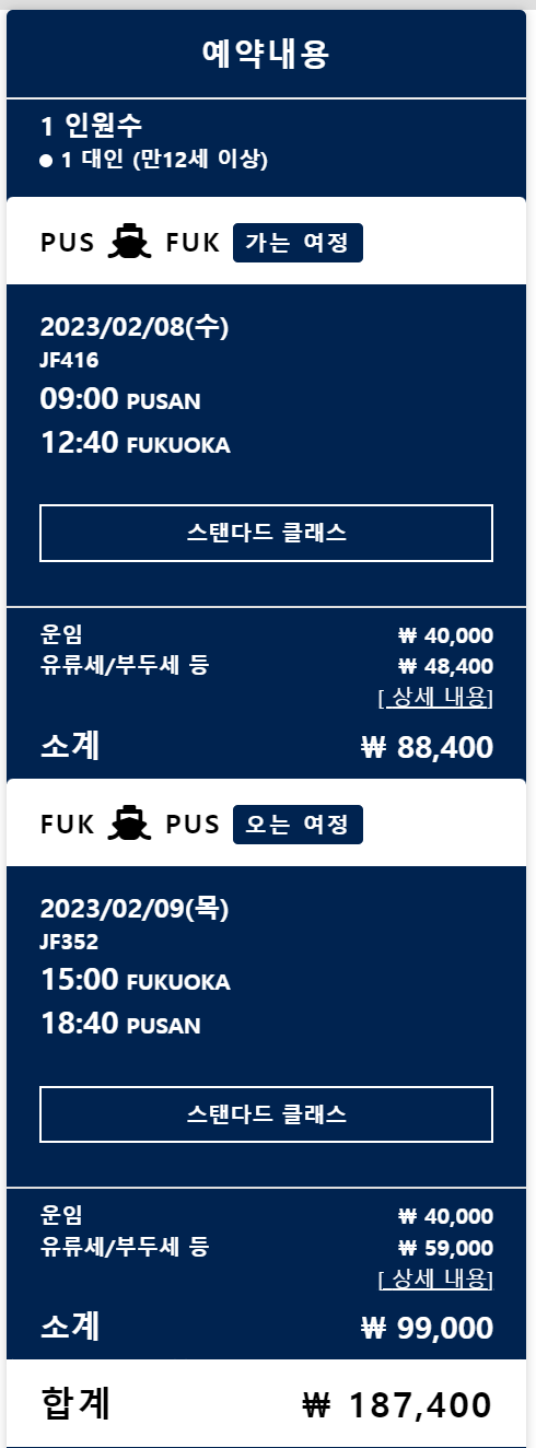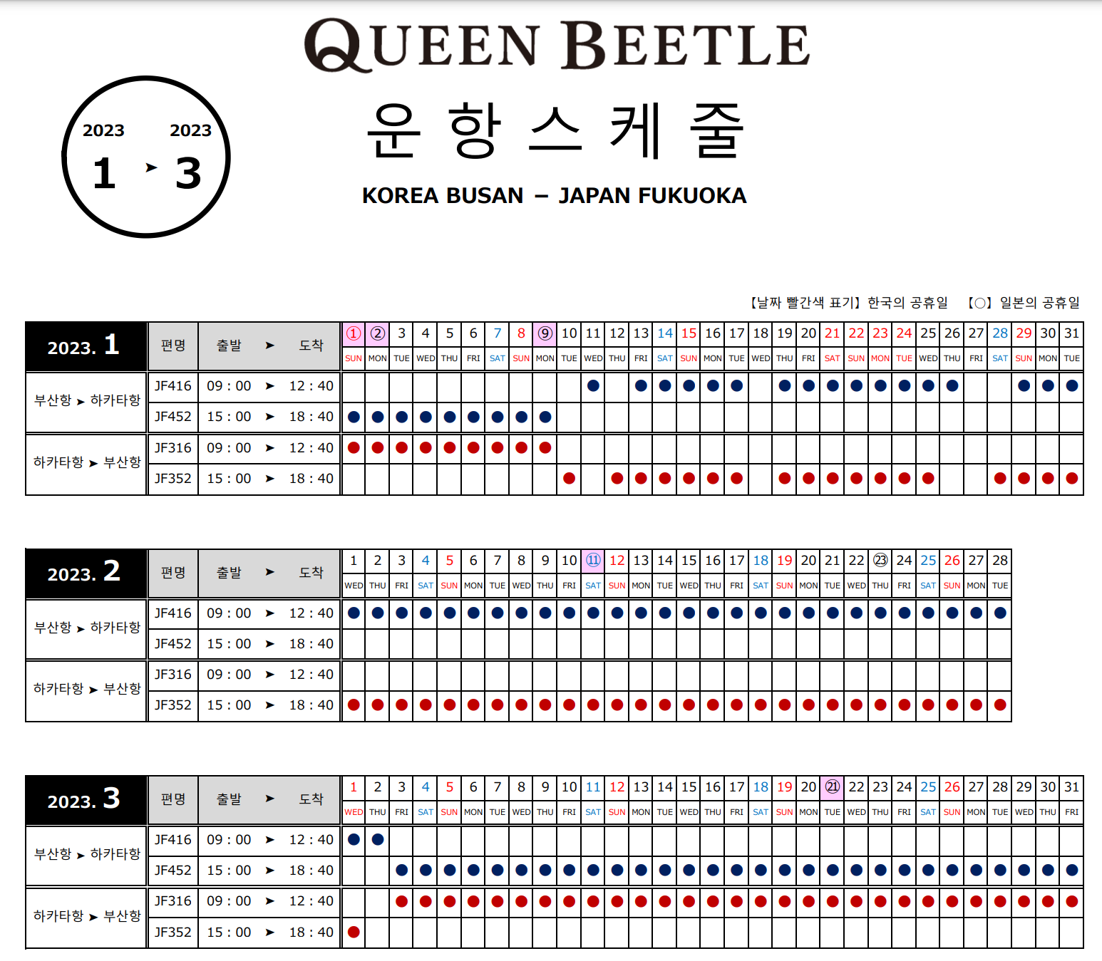 현재는 매일 부산→후쿠오카 한편, 후쿠오카→부산한편씩이 운항중입니다. 아래 운항 스케쥴을 참조하시면 됩니다. 2월에는 부산→후쿠오카는 오전 09:00 후쿠오카→부산는 오후 15:00 출발이라 여행일정 짜기 좋습니다만 3월에는 부산→후쿠오카는 오후 15:00 후쿠오카→부산는 오전 09:00로 여행일정상 1-2일이 추가될 수 밖에 없을 것 같습니다
