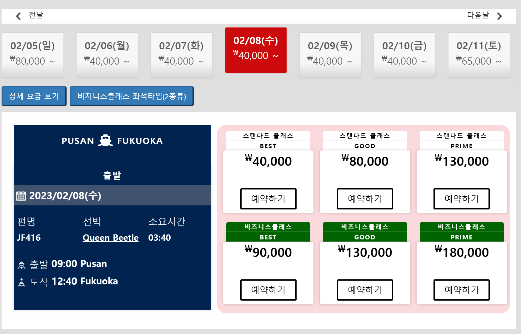 소요시간은 부산→후쿠오카 3시간 40분, 후쿠오카→부산 3시간 40분으로 동일합니다.