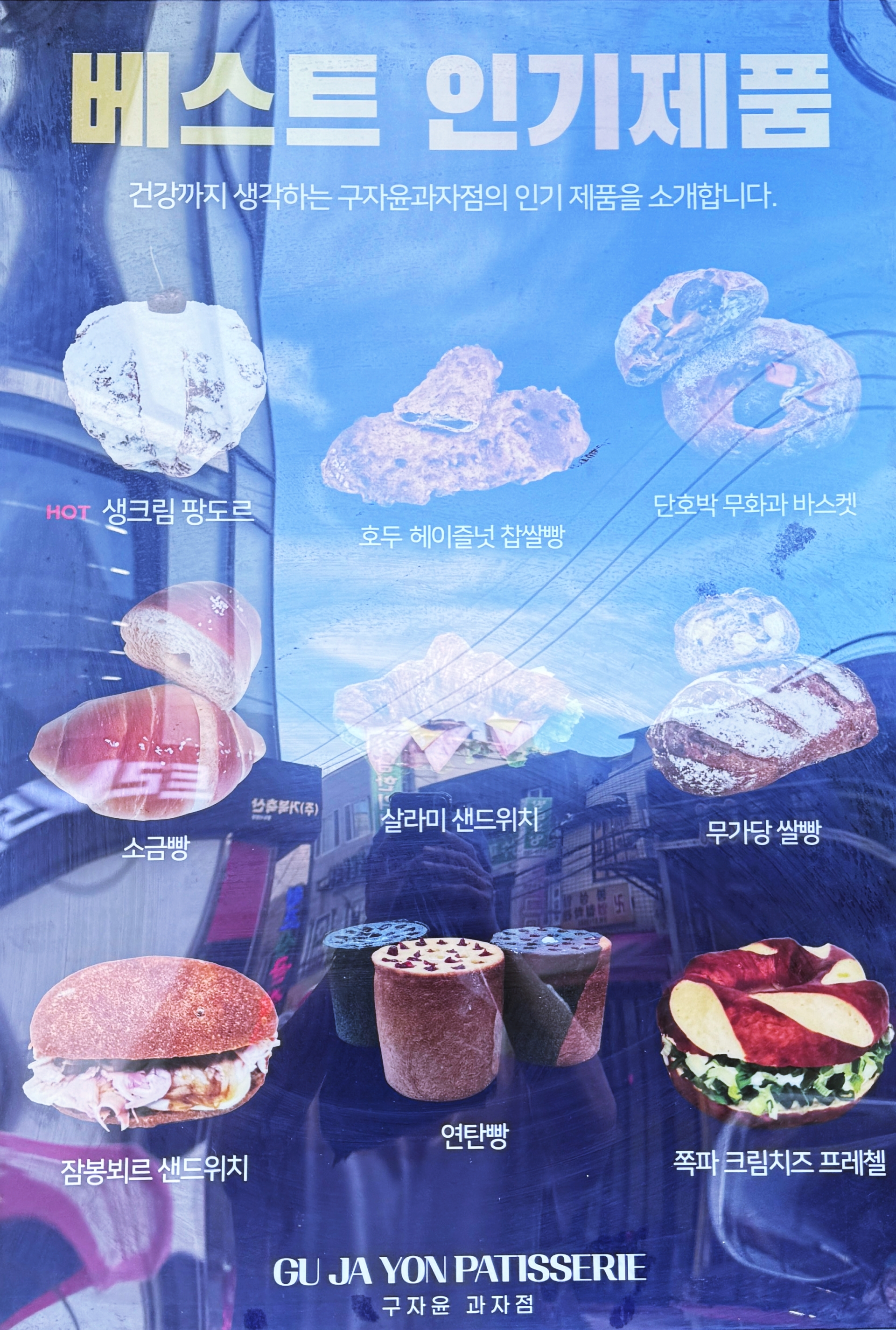 구자윤과자점 수영점의 베스트 인기제품. 생크림 팡도르, 소금빵, 호두 헤이즐넛 찹쌀빵, 단호박 무화과 비스켓, 살라미 샌드위치, 무가당 쌀빵, 잠봉뵈르 샌드위치, 연탄빵, 쪽파 크림치즈 프레첼 등. 특색있는 빵들이 많다.