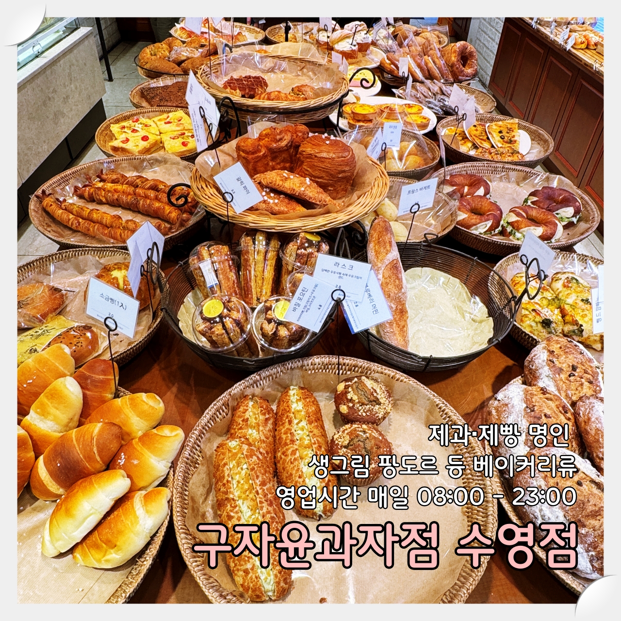 구자윤과자점 수영점. 규모는 그리 크지 않다. 그러나 정말 다양한 종류의 베이커리들이 있다.