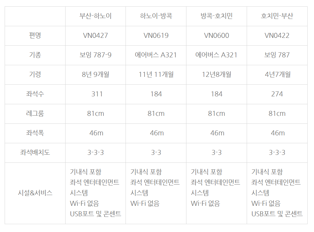 이번 여행에 탑승한 부산-하노이, 호치민-부산 구간은 승객들이 많아서 그런지 보잉기종이며 기령도 최신 기종이었다. 오히려 하노이-방콕, 방콕-호치민 노선은 승객이 적어서 그런지 에어버스A321기종이었으며 기령도 조금 오래된 편이었다.
