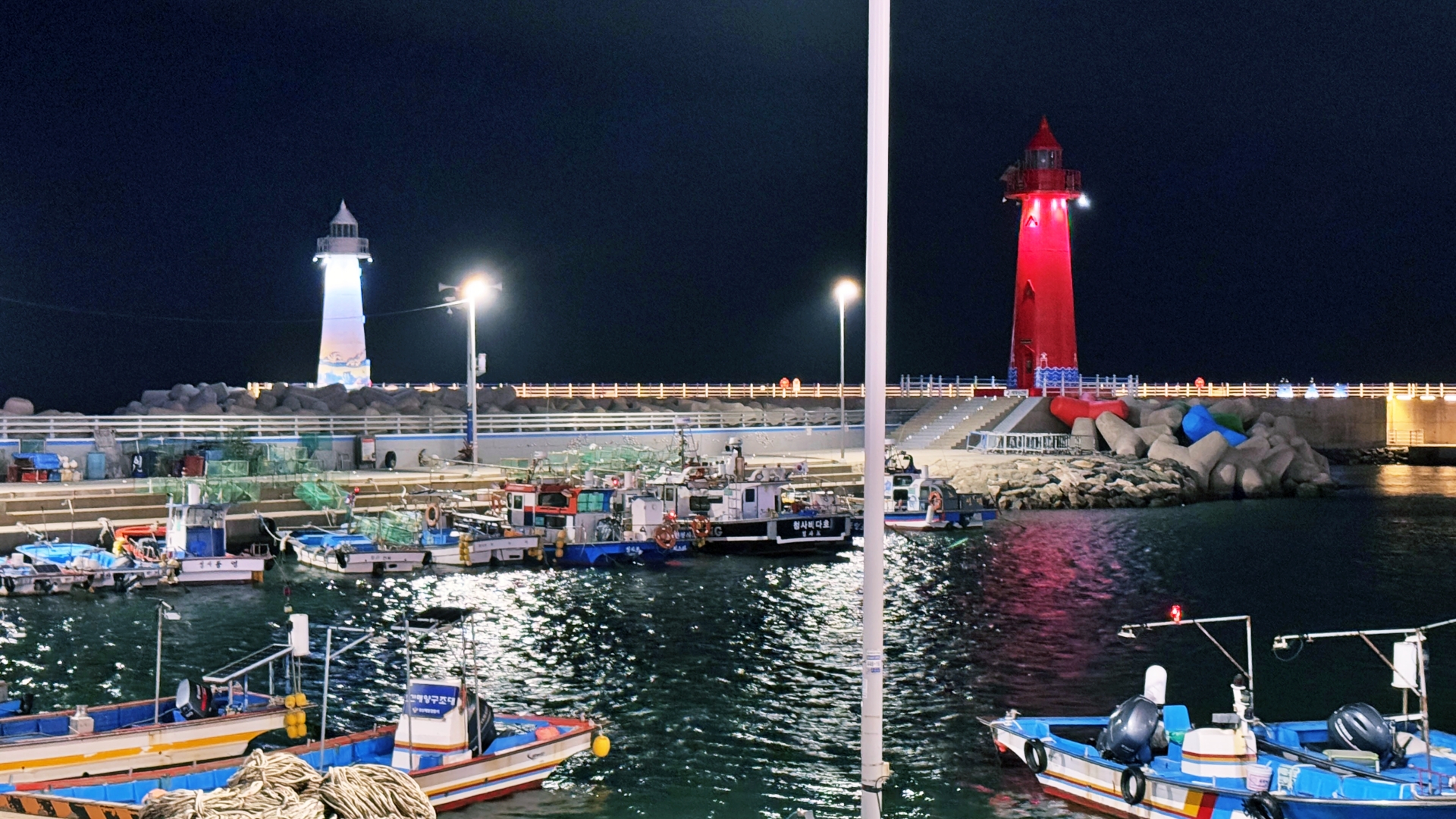 '디아트커피'는 아름다운 청사포 포구 바로 앞에 위치해 있다. 청사포를 상징하는 쌍둥이 등대도 바로 앞에 보인다.