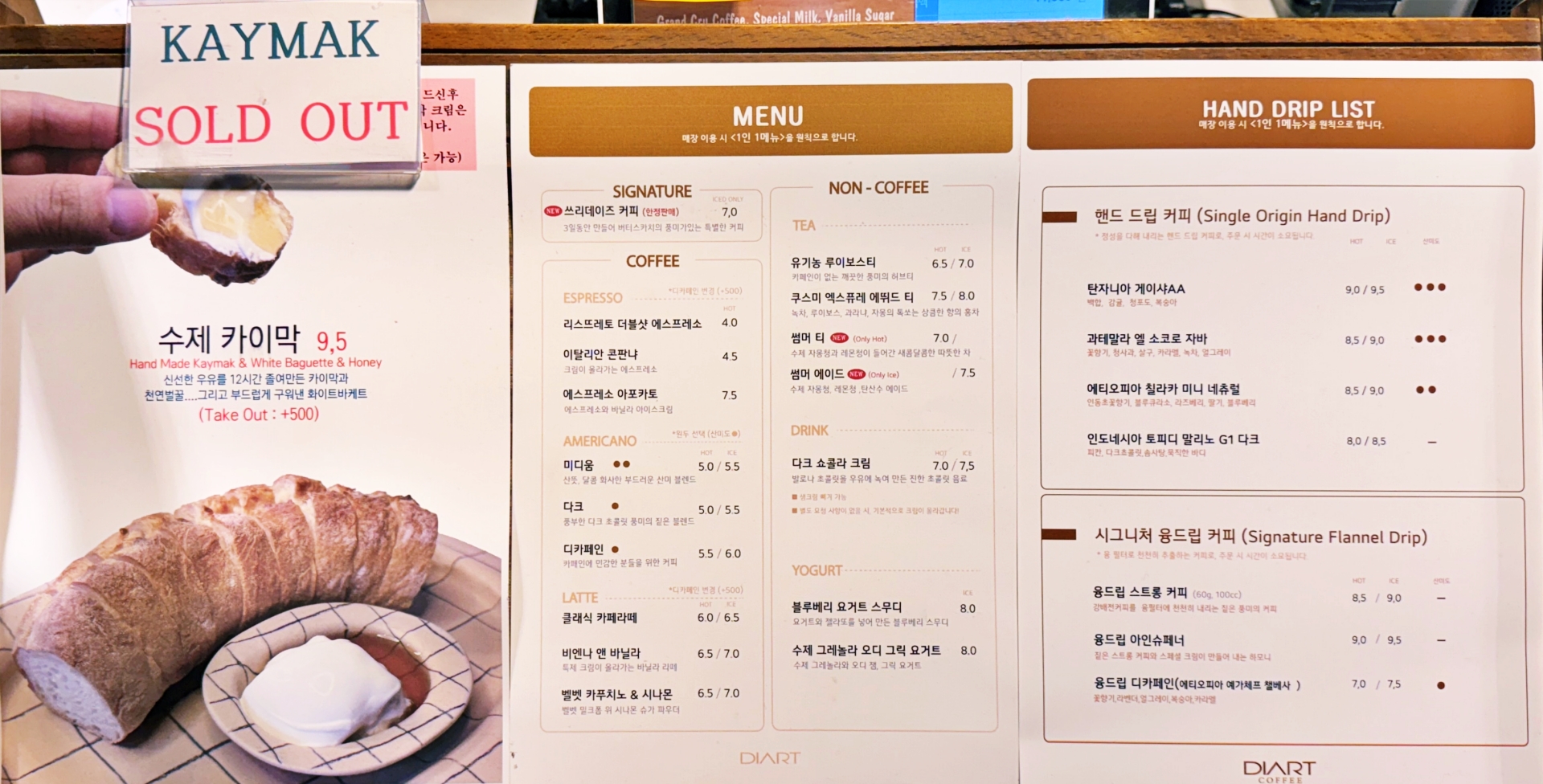 예전에 이 집의 '더치커피'를 먹기 위해 엄청 자주갔는데 지금은 '더치커피'를 팔지 않고 일반 커피 및 드립커피만을 판매하고 있어 다소 아쉽다. 최근에는 수제 카이막이 엄청 인기가 많다고 하는데 품절이라 먹어 보지 못해 아쉬웠다.