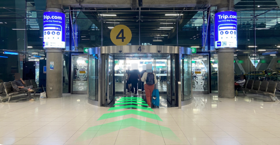 1. 도착장 출구 게이트 (2층)에서 출구 4 방향으로 우회전하여 에스컬레이터 또는 엘리베이터를 이용해 1층으로 내려갑니다.