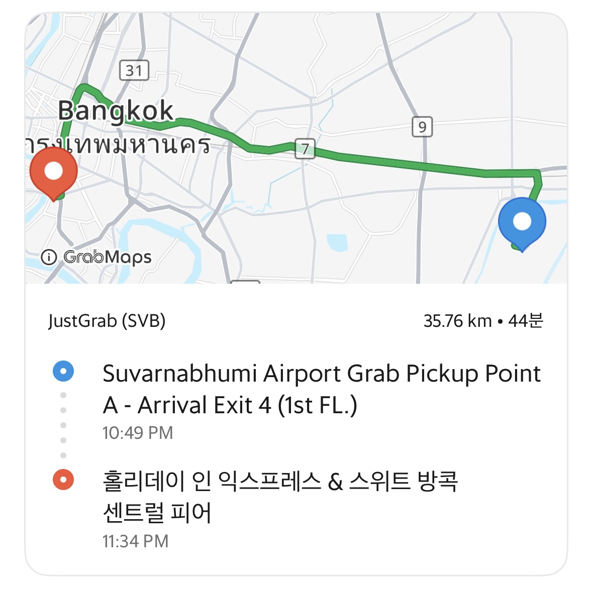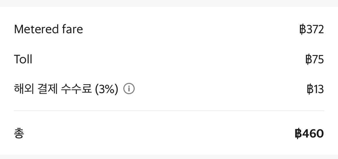 늦은 밤시간이라 호텔까지 고고씽. 36km 거리였는데 약 45분 걸렸다. 비용은 톨게이트 비용 포함 460바트 약 20,000원 정도 나왔다.