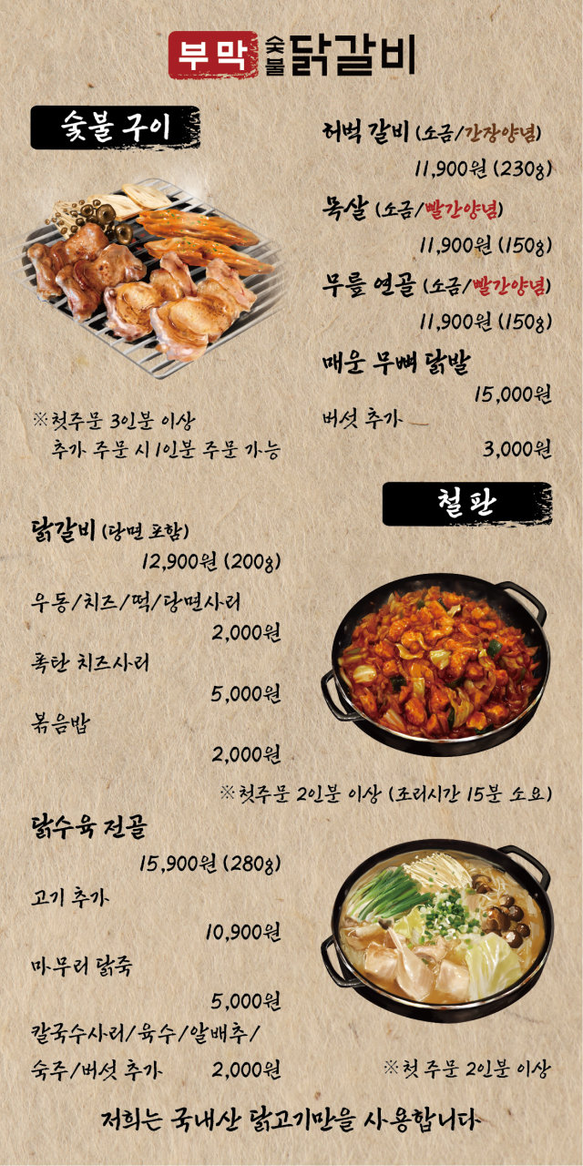 부막숯불닭갈비는 옛 시골 부뚜막을 연상하는 인테리어를 도입해 모든 세대를 아우르는 고즈넉한 여유를 제공하는 것을 컨셉으로 운영하고 있다. 메인 메뉴는 국내산 닭을 재료로 부드럽고 촉촉함이 특징인 철판 닭갈비와 참숯을 사용하여 육줍이 가득한 숯불 닭구이, 사골 육수와 부드러운 닭다리로 만든 철판 닭수육 등.