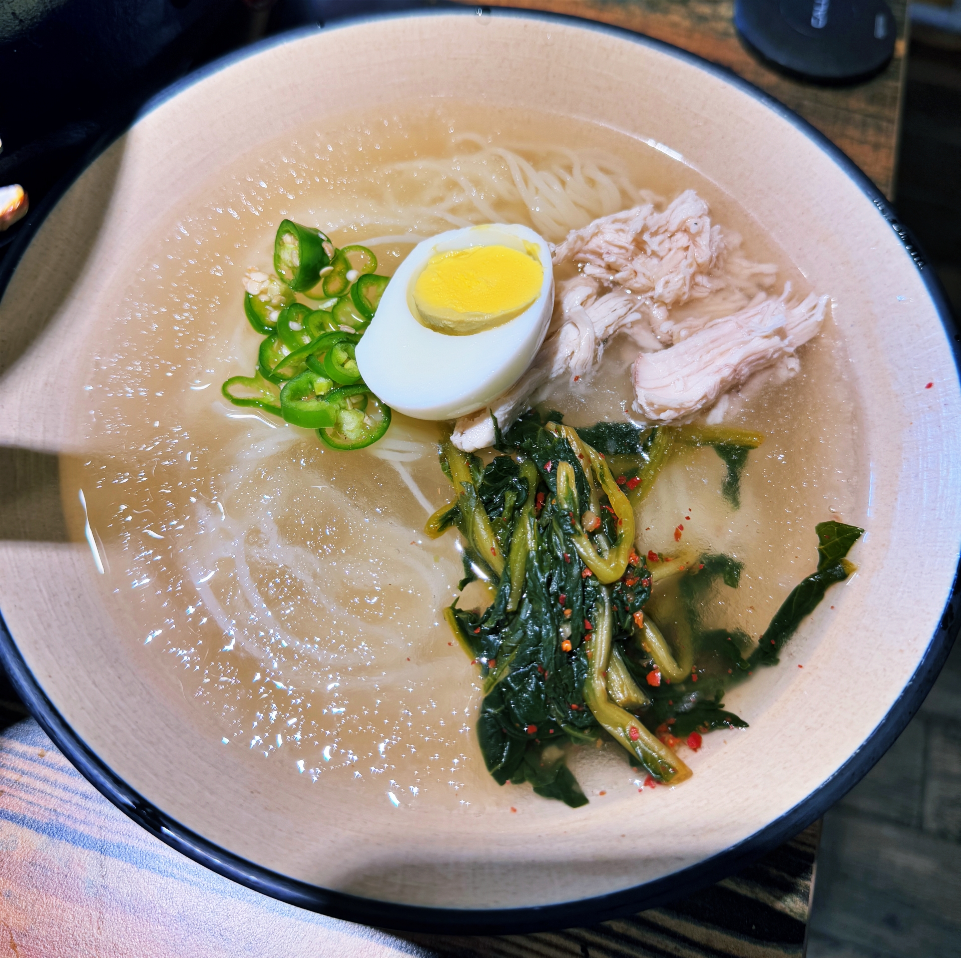 국수인데 닭고기살과 계란, 열무김치, 청양고추 등이 들어가 있다. 시원한 국물 맛이 여름철 별미.