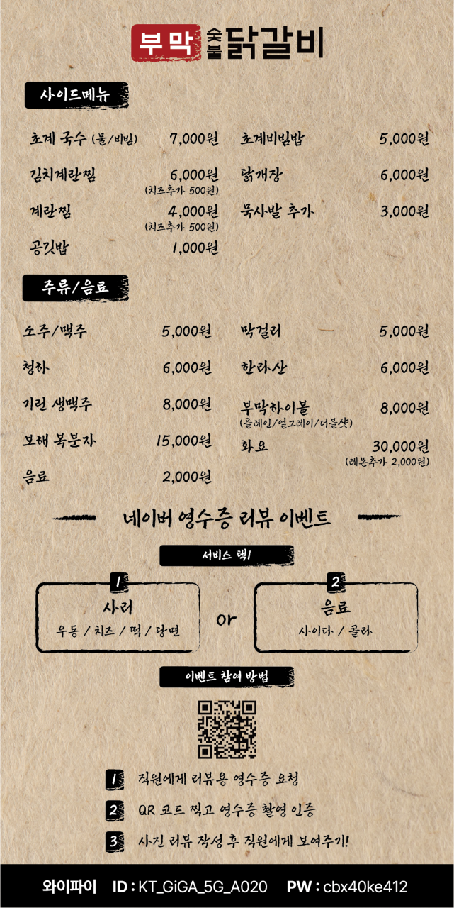 닭갈비(1인분 12,900원), 허벅갈비 (소금 11,900원, 간장양념 12,900원), 목살(11,900원), 무릎연골(11,900원), 매우 무뼈닭발(15,000원) 등이 있으며 사이드 메뉴로는 초계국수(7,000원), 초계비빔밥 (5,000원), 계란찜 (4,000원), 닭개장 (6,000원) 등이 있다.