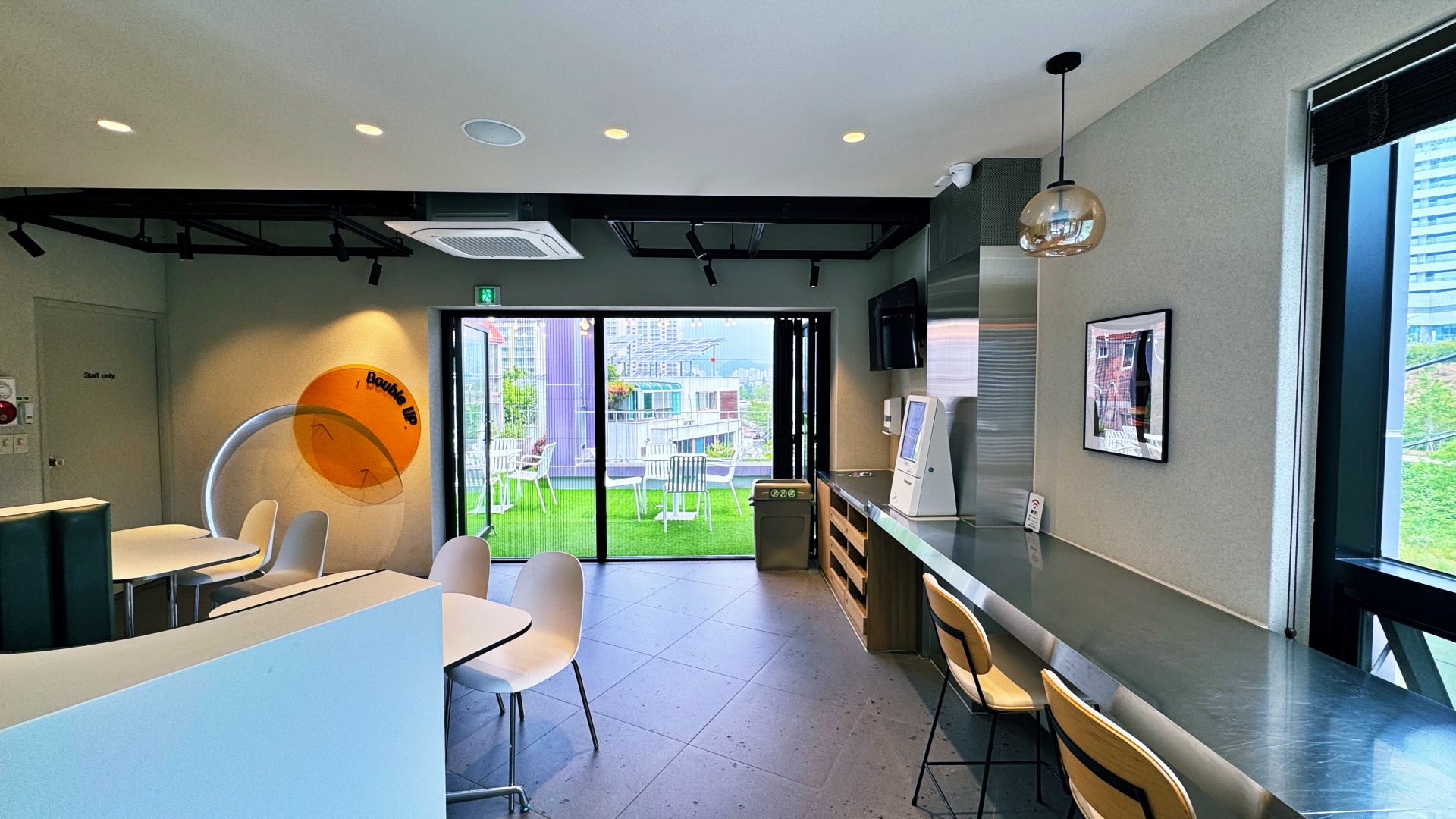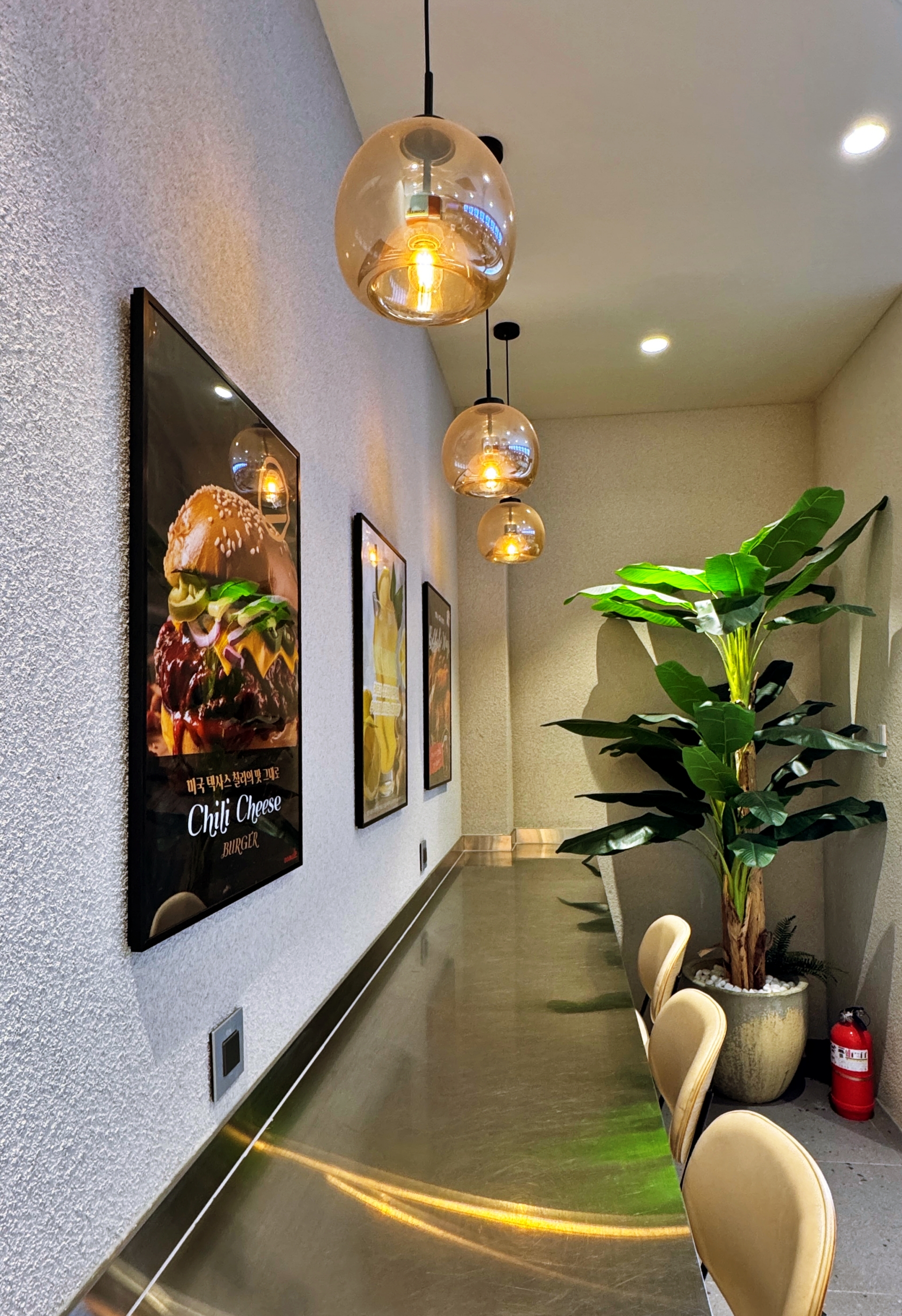 1층에는 주문하는 코너와 간단히 앉아 먹을 수 있는 일자형 테이블 좌석이 놓여 있다. 벽면은 세렵되게 인테리어가 되어 있으며 특히 눈에 뛰는 것은 '햄버거'를 소재로 한 팝아트 그림.