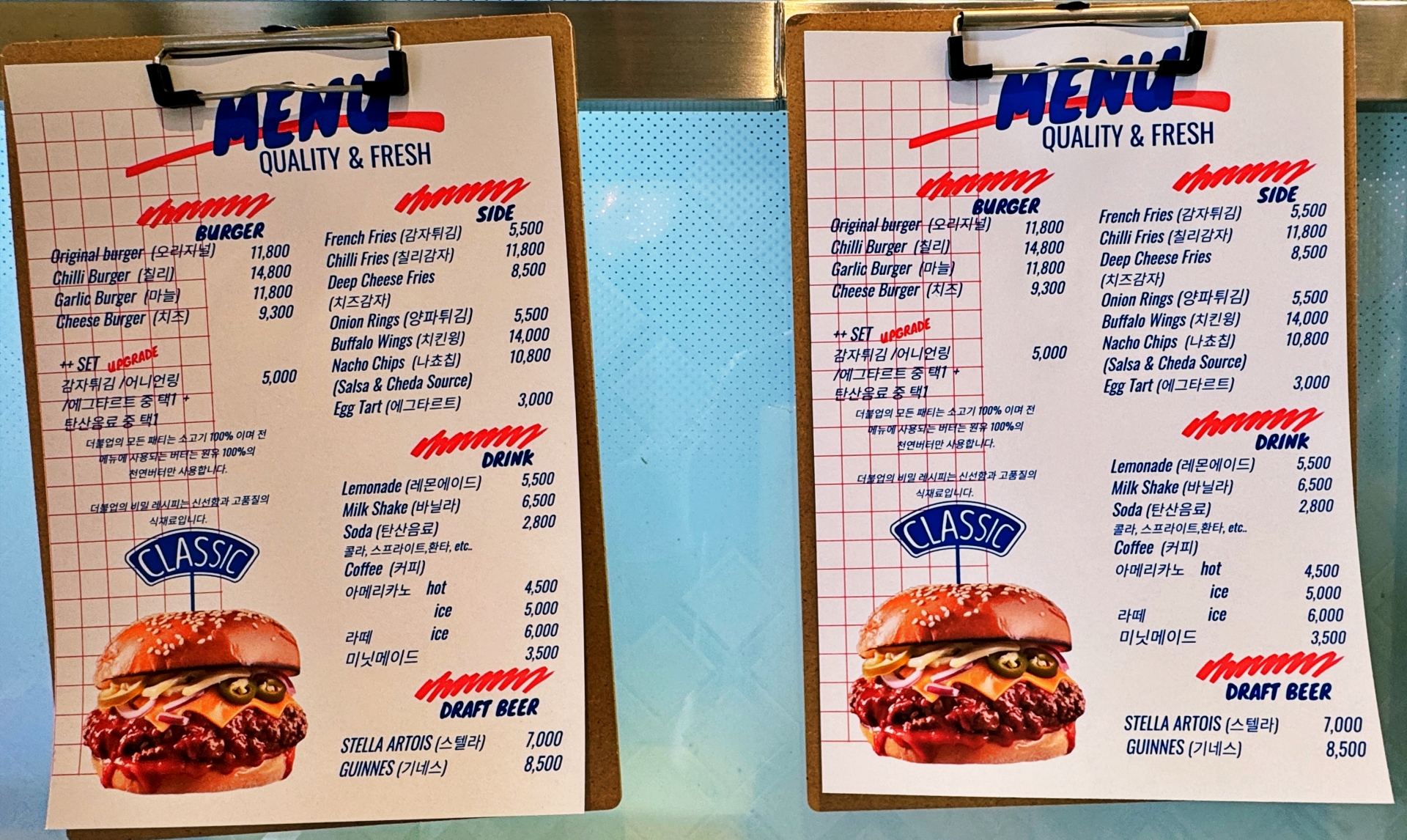메인 메뉴는 오리지널 버거 (11,800원), 칠리 버거(Chilli Burger) (14,800원), 갈릭 버거(Garlic Burger)(11,800원), 치즈 버거(Cheese Burger) (9,300원) 등 수제햄버거. 세트 추가 (+5,000원)시 버거 상품에 탄산음료와 사이드메뉴 (감자튀김 or 에그타르트) 를 선택하실 수 있다. 그외 사이드 메뉴로 칠리 감자(Chilli Fries) (11,800원), 치즈감자(Cheese Fries) (8,500원), 감자튀김(French Fries) (5,000원), 어니언링(Onion Rings) (5,500원), 치킨윙(Buffalo Wings) (14,000원), 나쵸칩(Nacho Chips) (10,800원) 등이 있으며 음료로는 탄산음료 (2,800원), 아메리카노(테라로사) 4,500원, 아이스 아메리카노 (테라로사) 5,000원 등이 있다.