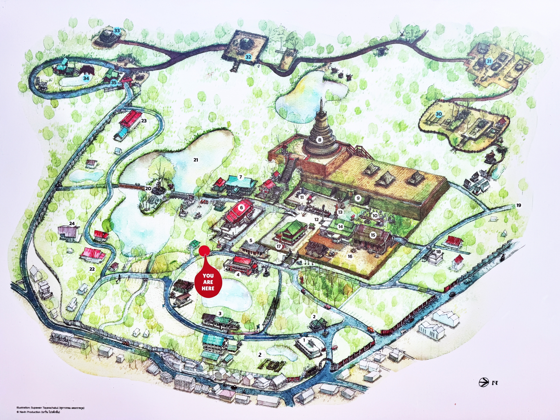 아래는 왓 우몽(동굴사원) 전체 지도이다. 상당히 넓은 면적에 동굴사원, 불탑, 그리고 숲과 호수 등이 있으며 불교 교육 센터와 명상 사찰등이 위치해 있다.