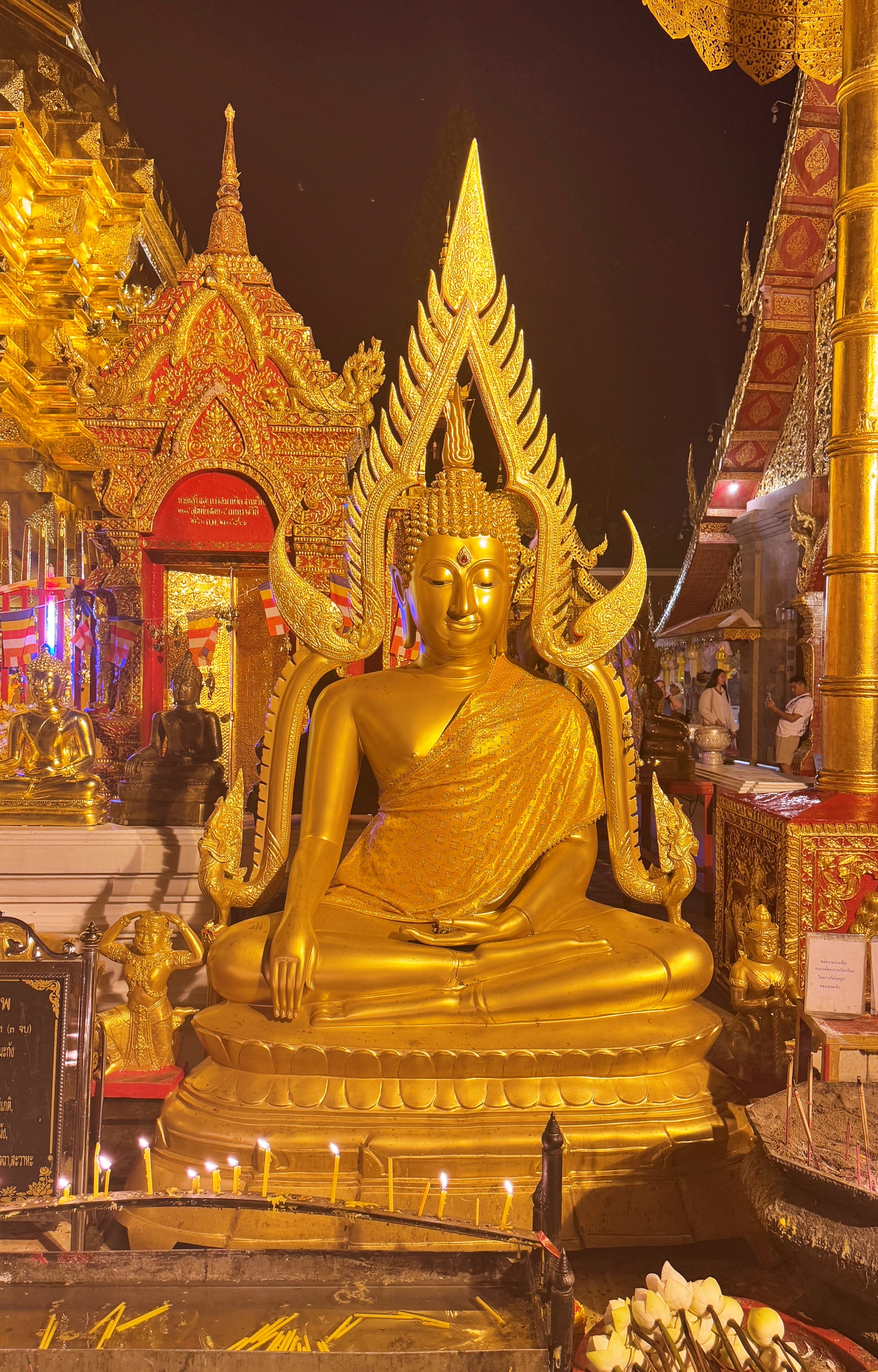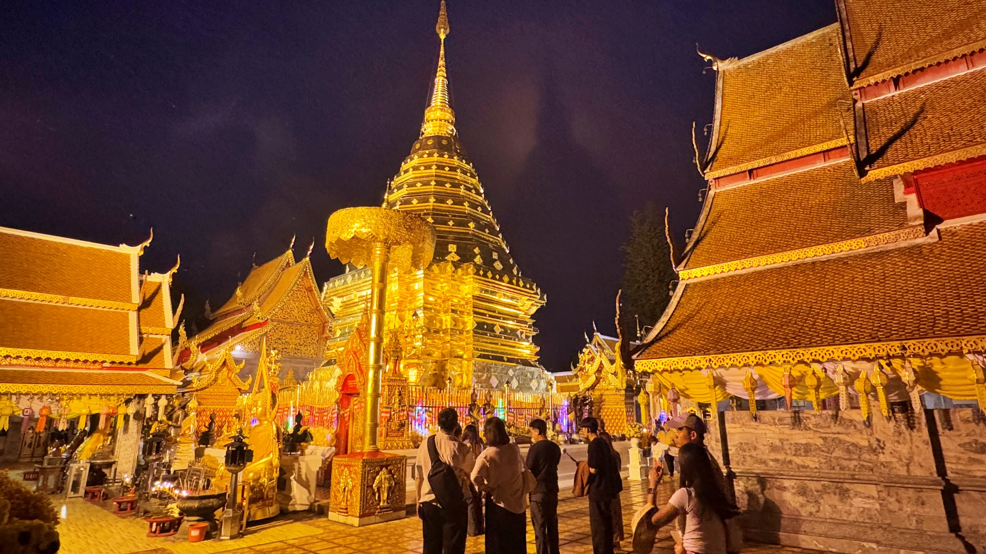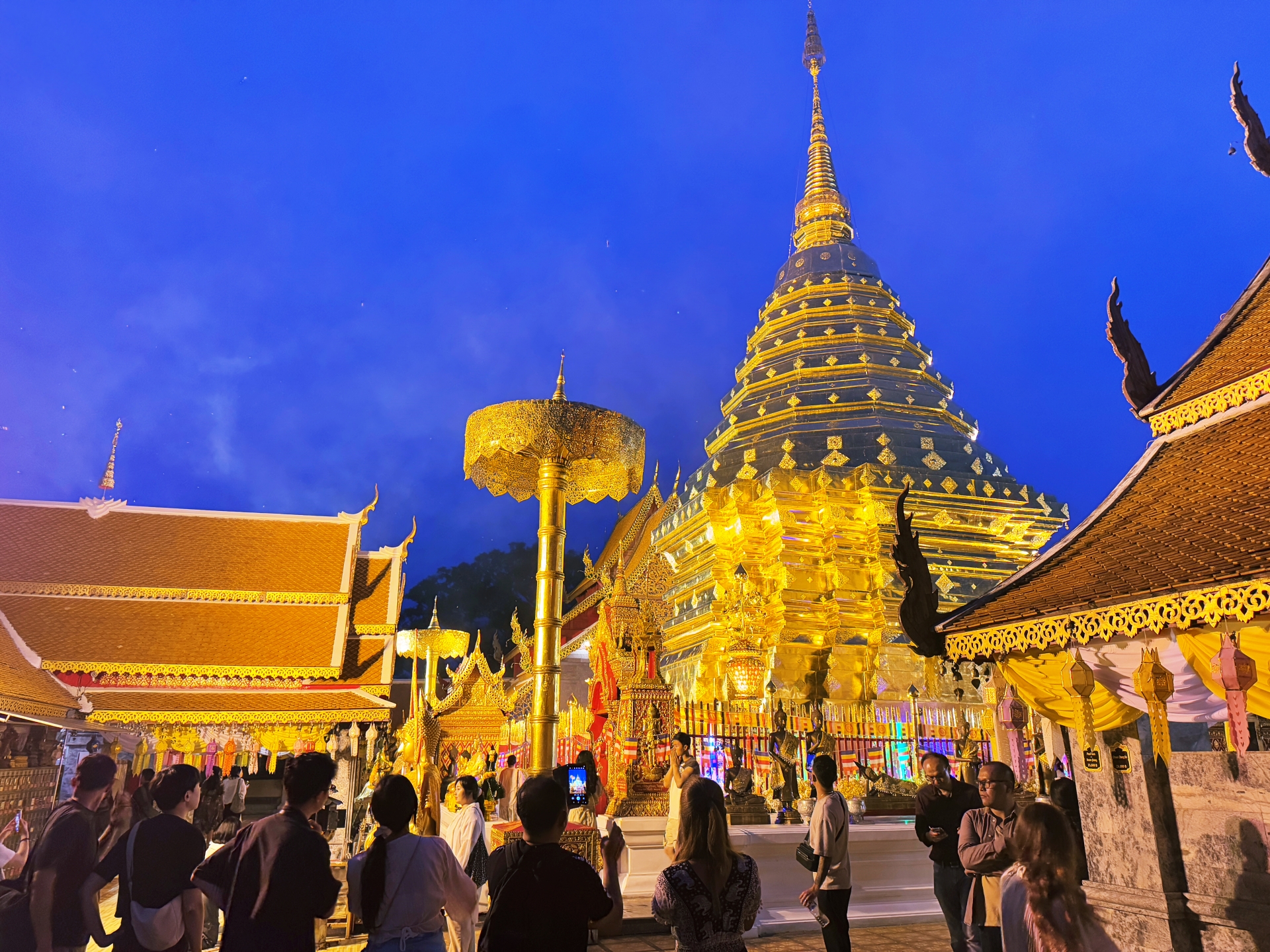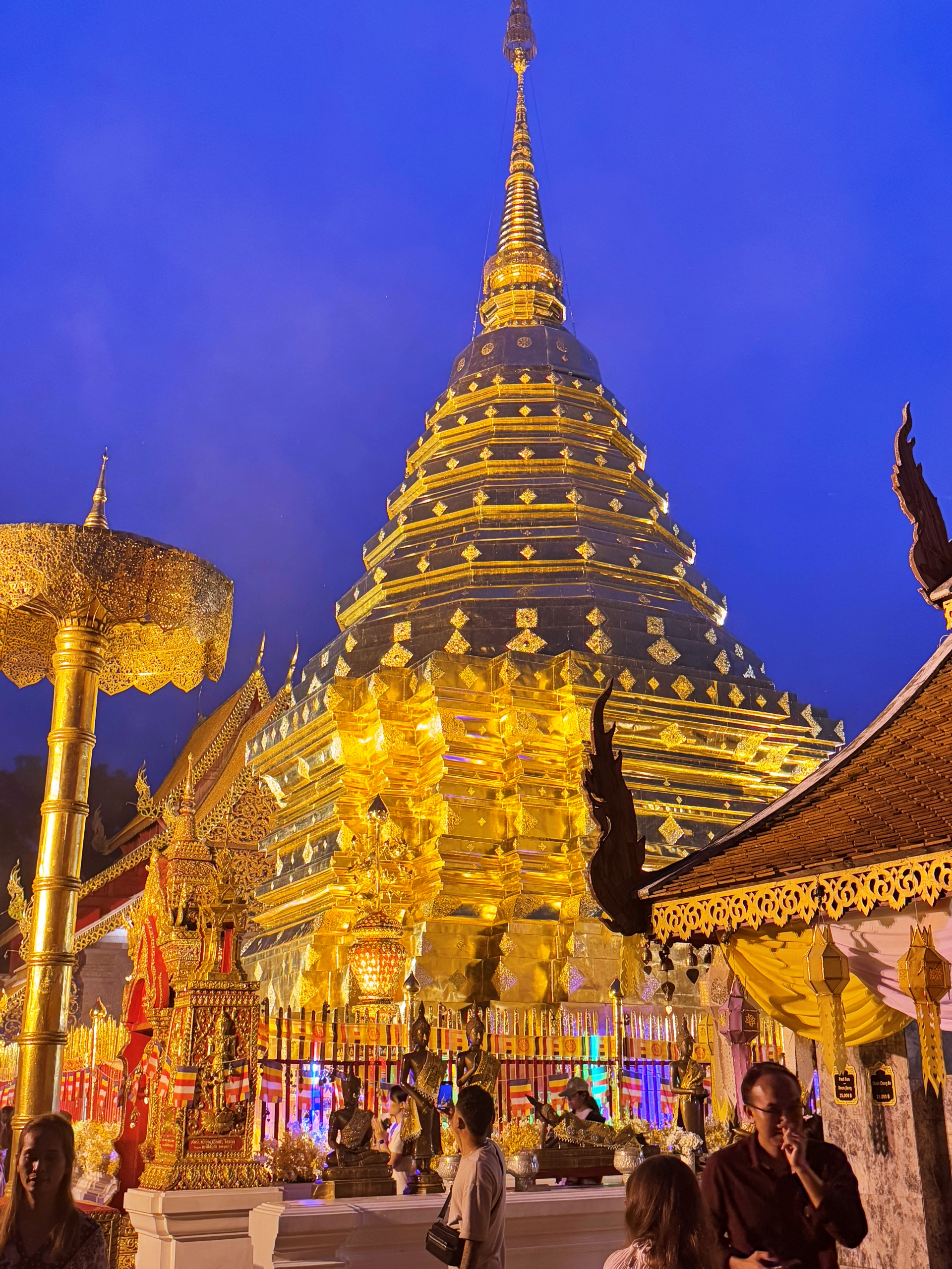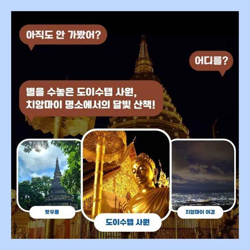 '왓 프라탓 도이수텝'은 낮과 밤이 다른 반전매력을 느낄 수 있다. 햇빛을 받아 은은히 반짝였던 황금 사원은 밤이 되어 조명이 켜지자 사뭇 다른 분위기를 자아낸다. 낮에는 주변의 풍경들과 함께 어우러져 편안하고 일상적인 분위기였다면, 밤이 되어 깜깜한 와중에 탑을 비롯한 주요 건축물들에만 불이 켜지면서 단독으로 스포트라이트를 받은 것 마냥 부각되어 더욱 화려해진다.