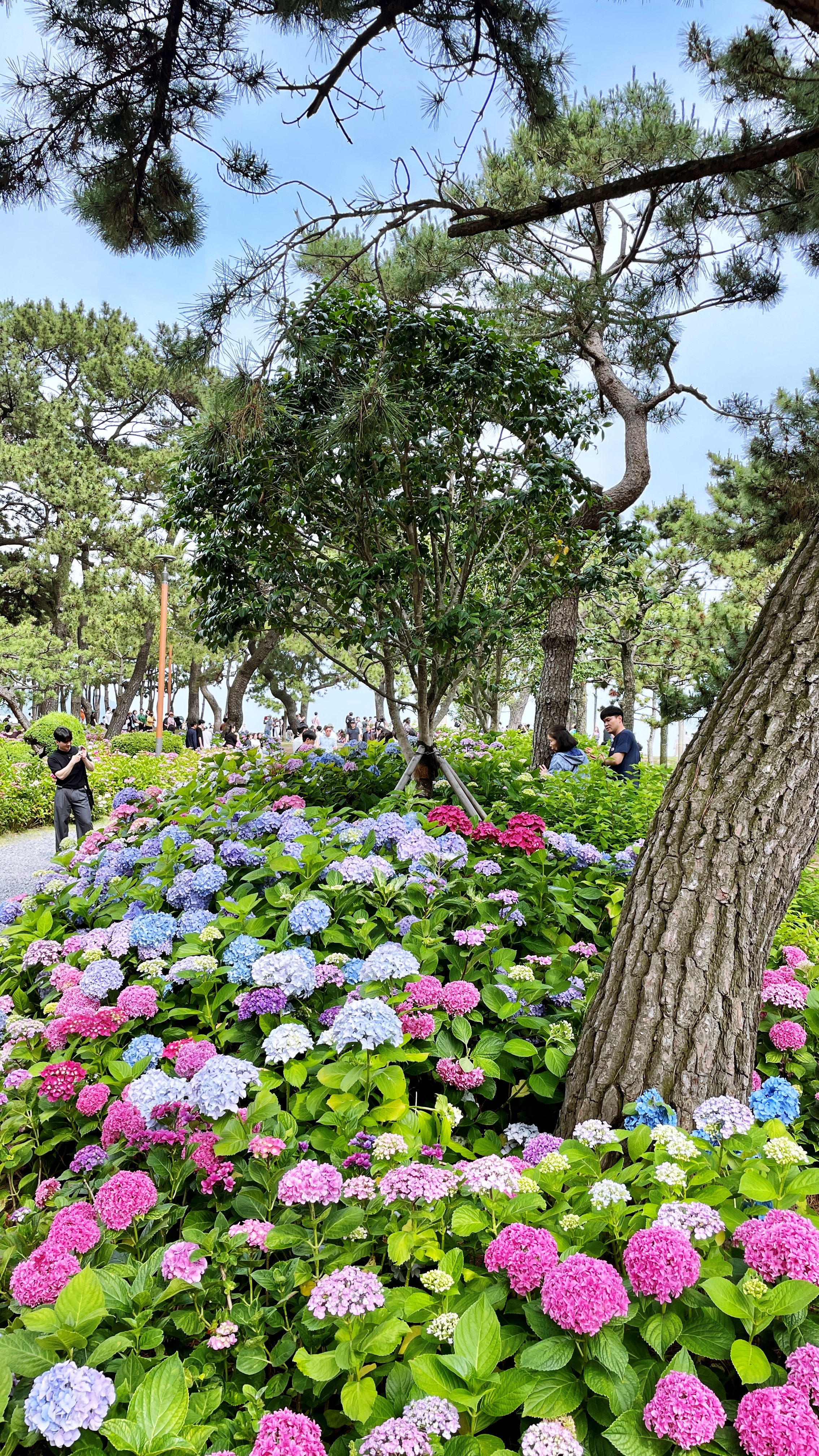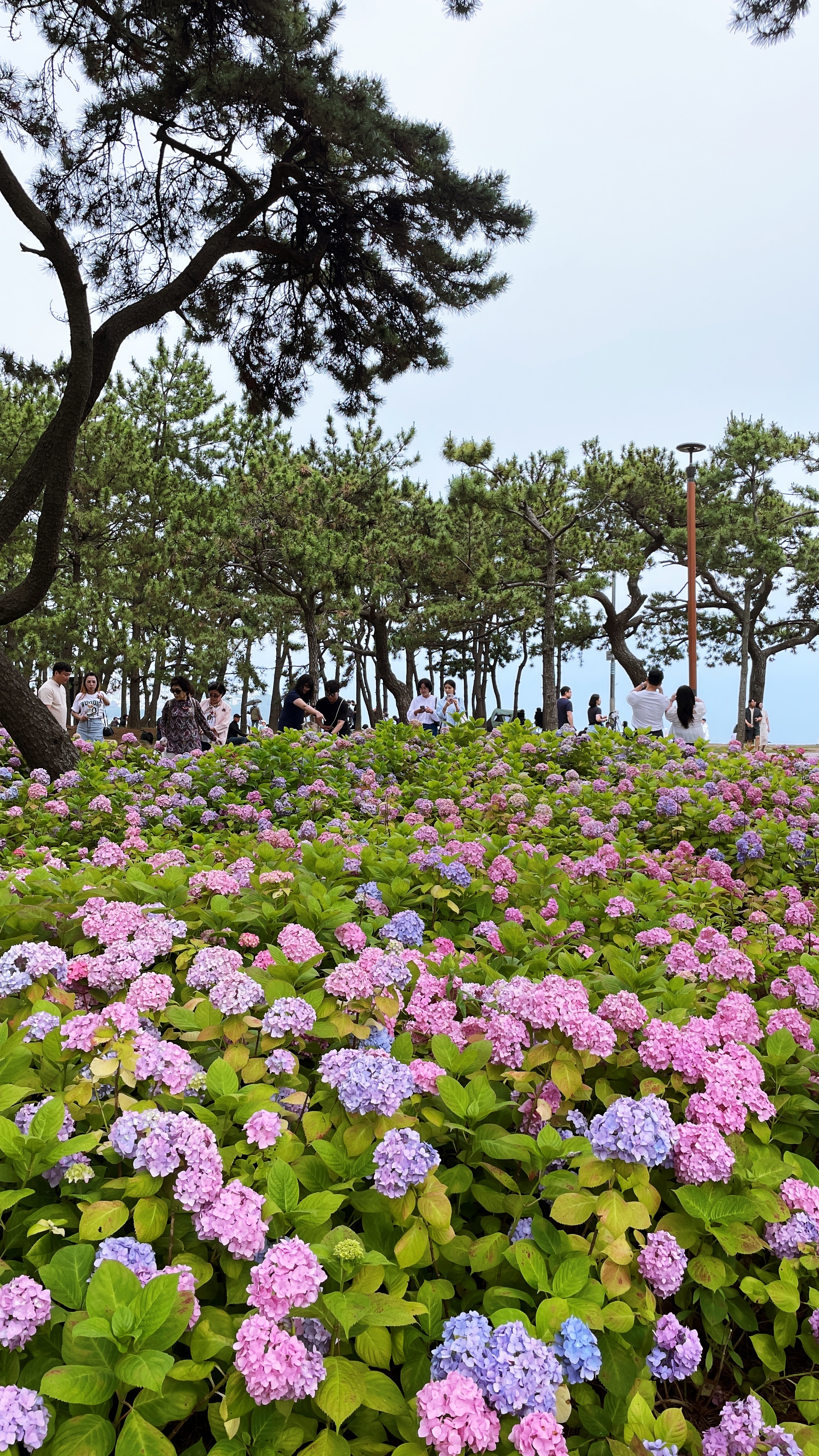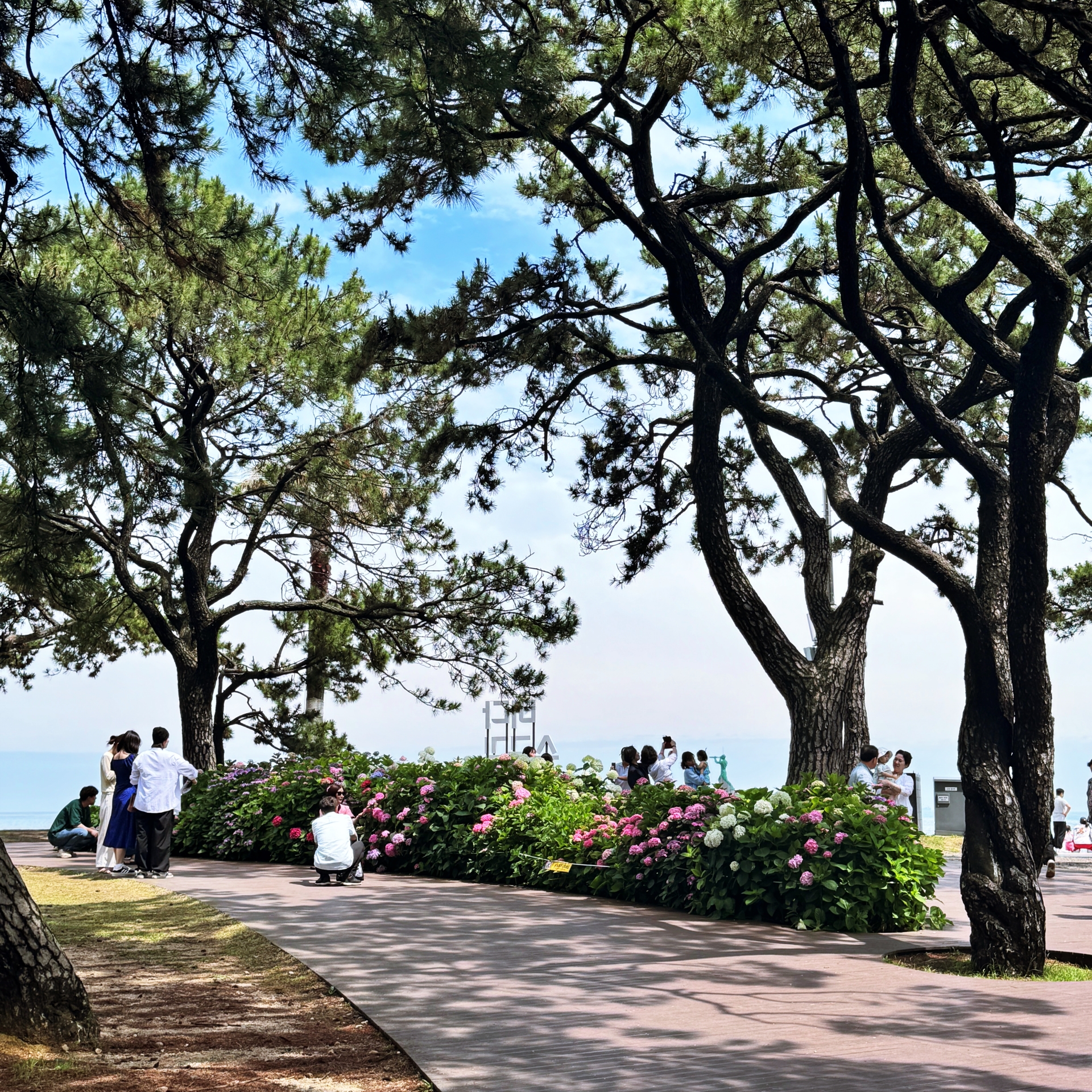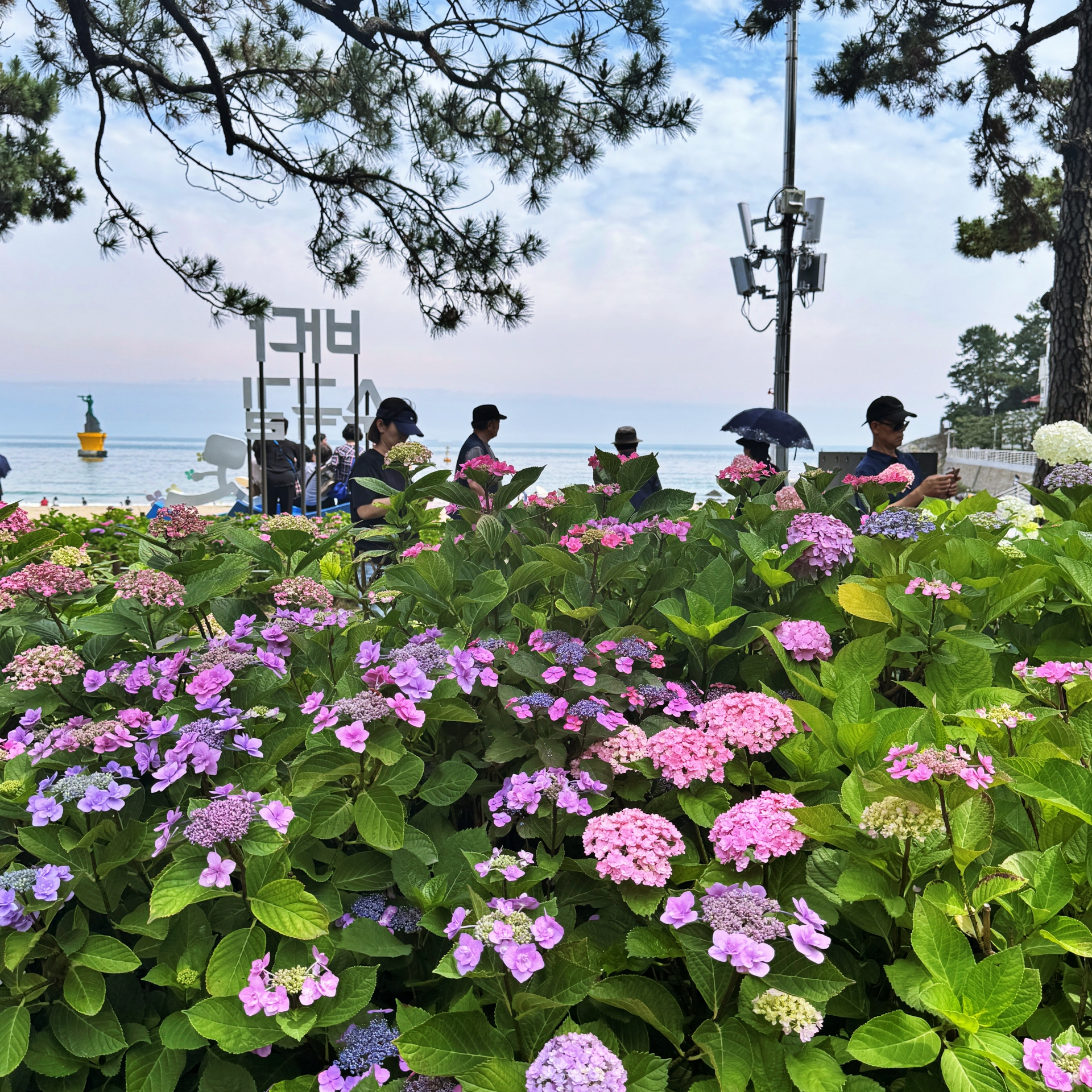 수국단지 뒤로 바다가 보이고, 머리 위 소나무들이 그늘을 만들어 주는 이곳은 이미 많은 사람이 찾는 힐링명소가 됐다. 다양한 색깔과 종류의 수국 꽃길은 걷다보면 부산의 대표적 수국명소인 태종대 태종사 못지 않다.