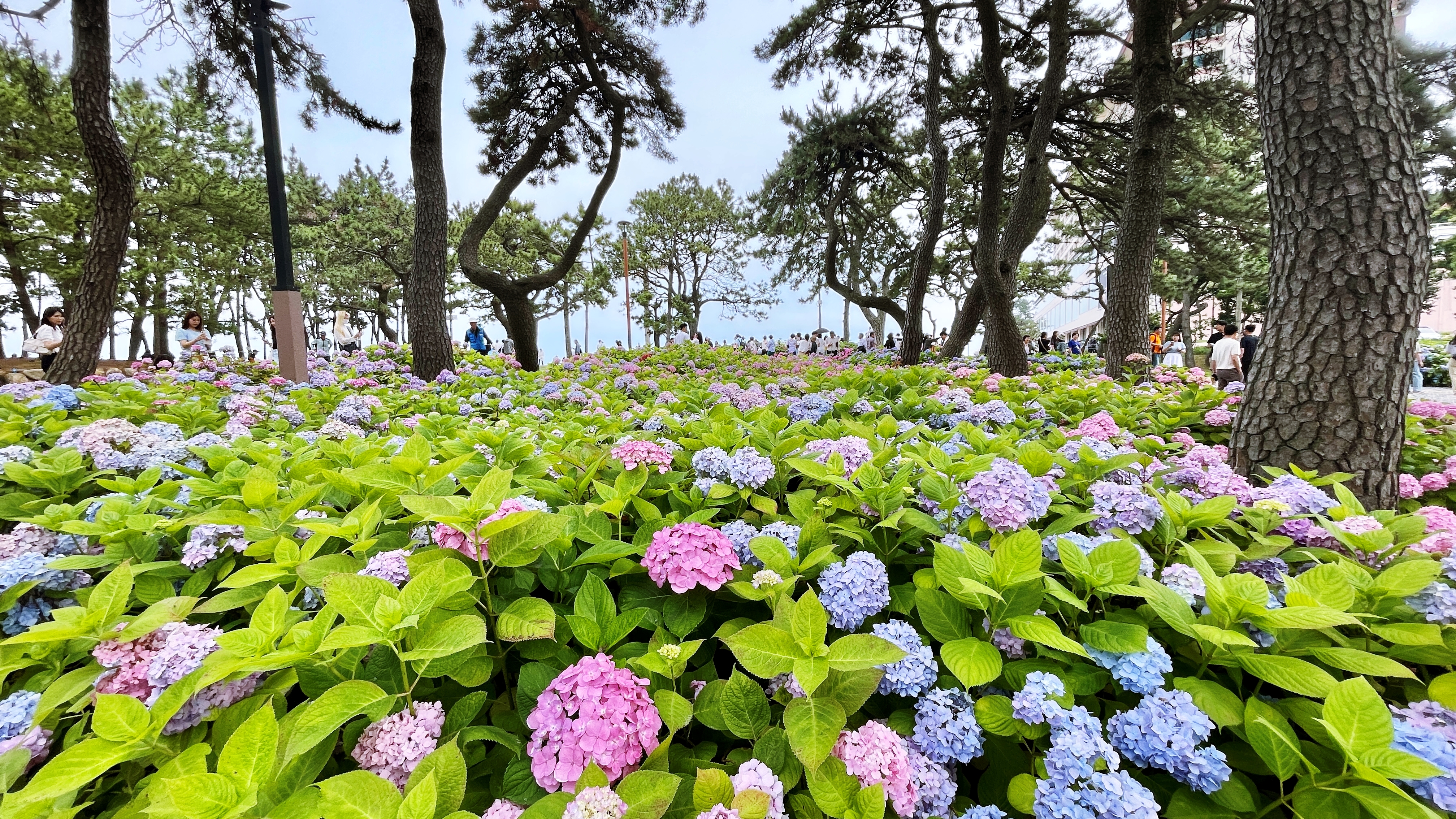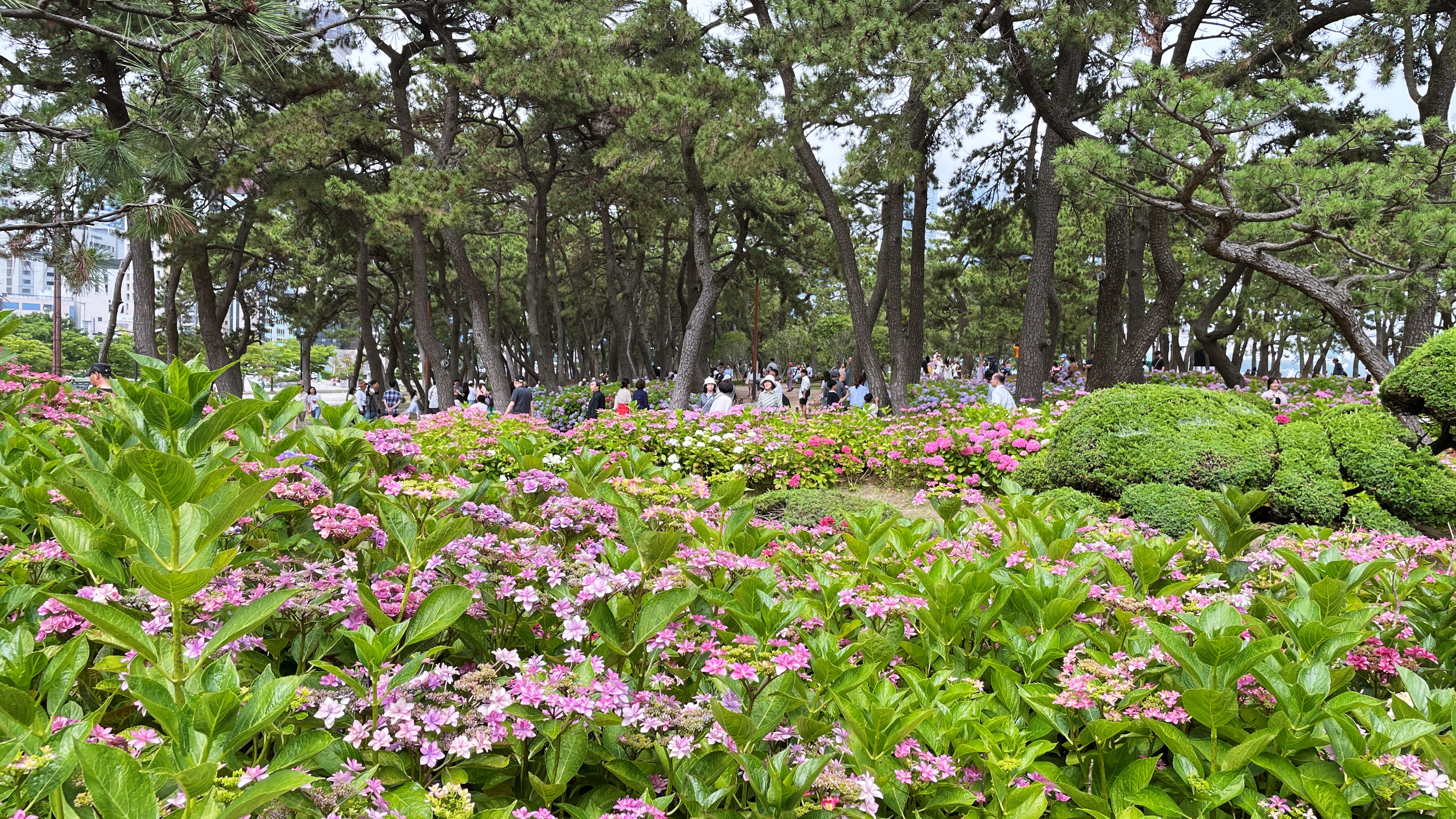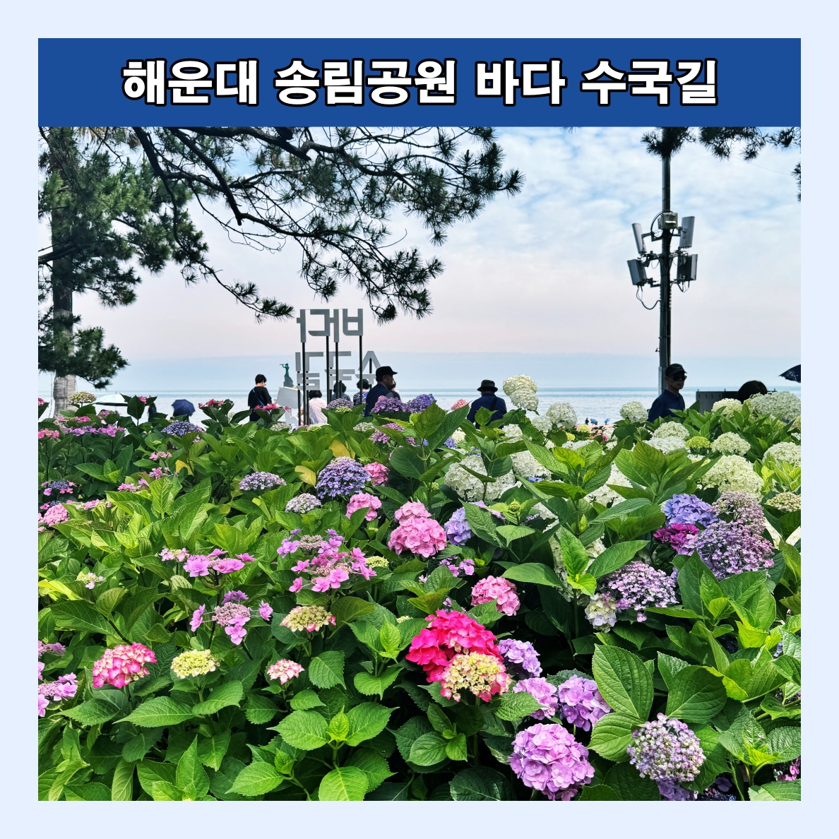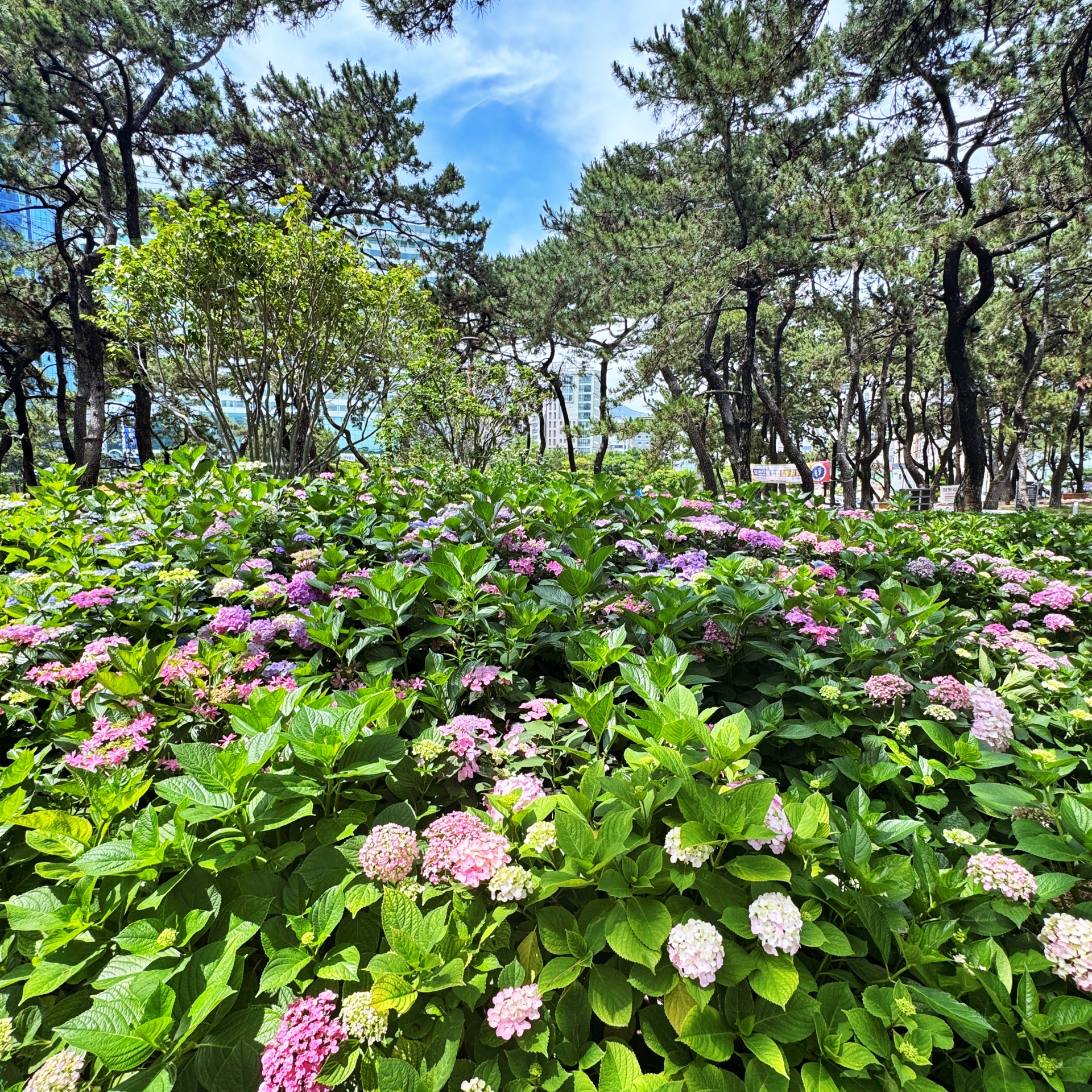 해운대 해수욕장이 뒷편으로 울창한 소나무 숲으로 이루어진 송림공원이 있다. 하지만 해운대 해수욕장 찾는 관광객들은 대부분 해변쪽 산책로를 따라 이동하다 보니 해운대 송림공원은 거의 스쳐 지나가는 경우가 많다. 하지만 해운대 송림공원은 울창한 소나무 숲길과 함께 6월-7월이면 아름다운 수국들이 만개해 수국꽃밭으로 변신한다. 마치 소나무와 수국이 서로 공생하고 있듯이 피어나는데 정말 예쁘다. 숲길 좌우로 수국들이 필어나 수국 꽃길이 된다. 보라, 분홍, 파랑, 하양 다채로운 빛깔의 수국 중 가장 눈에 띈 것은 장미수국, 엔들레스 썸머 그리고 하얀 나비가 내려앉은 듯한 미국 수국.