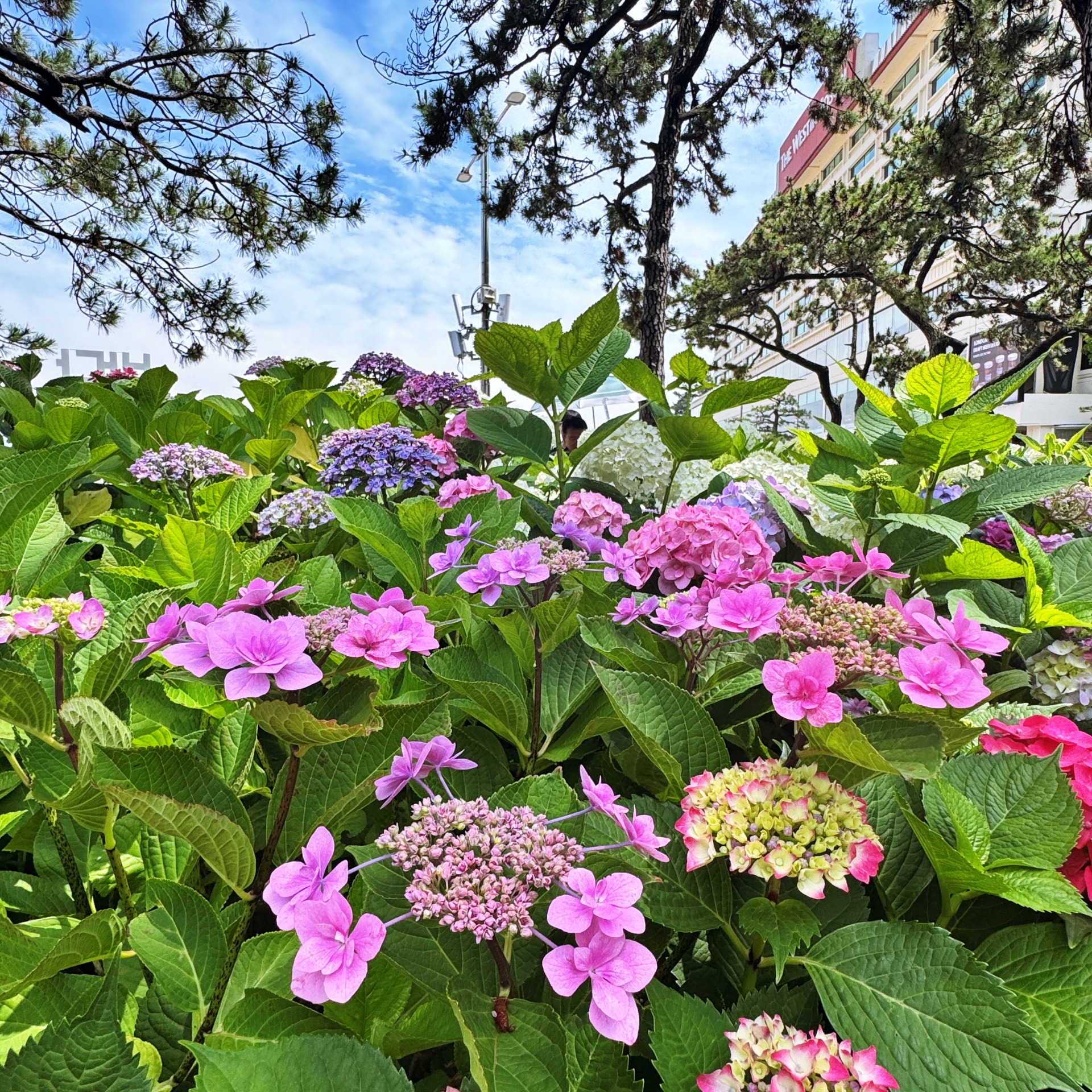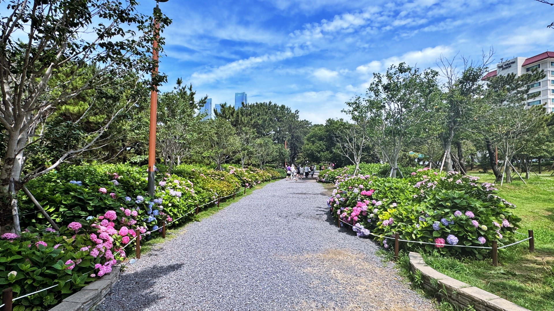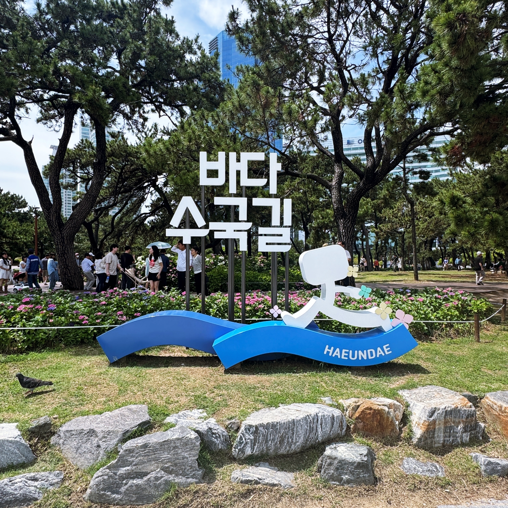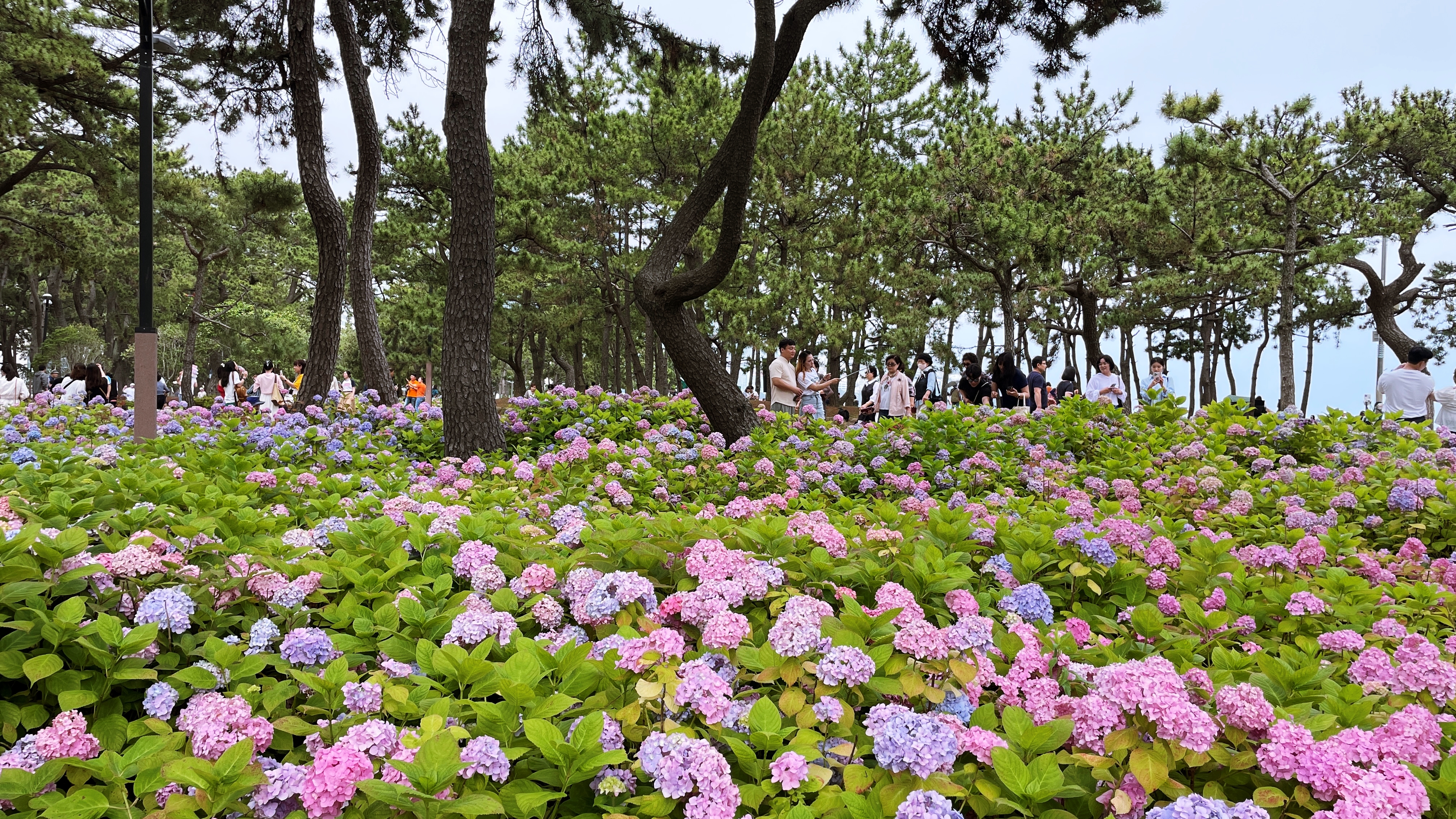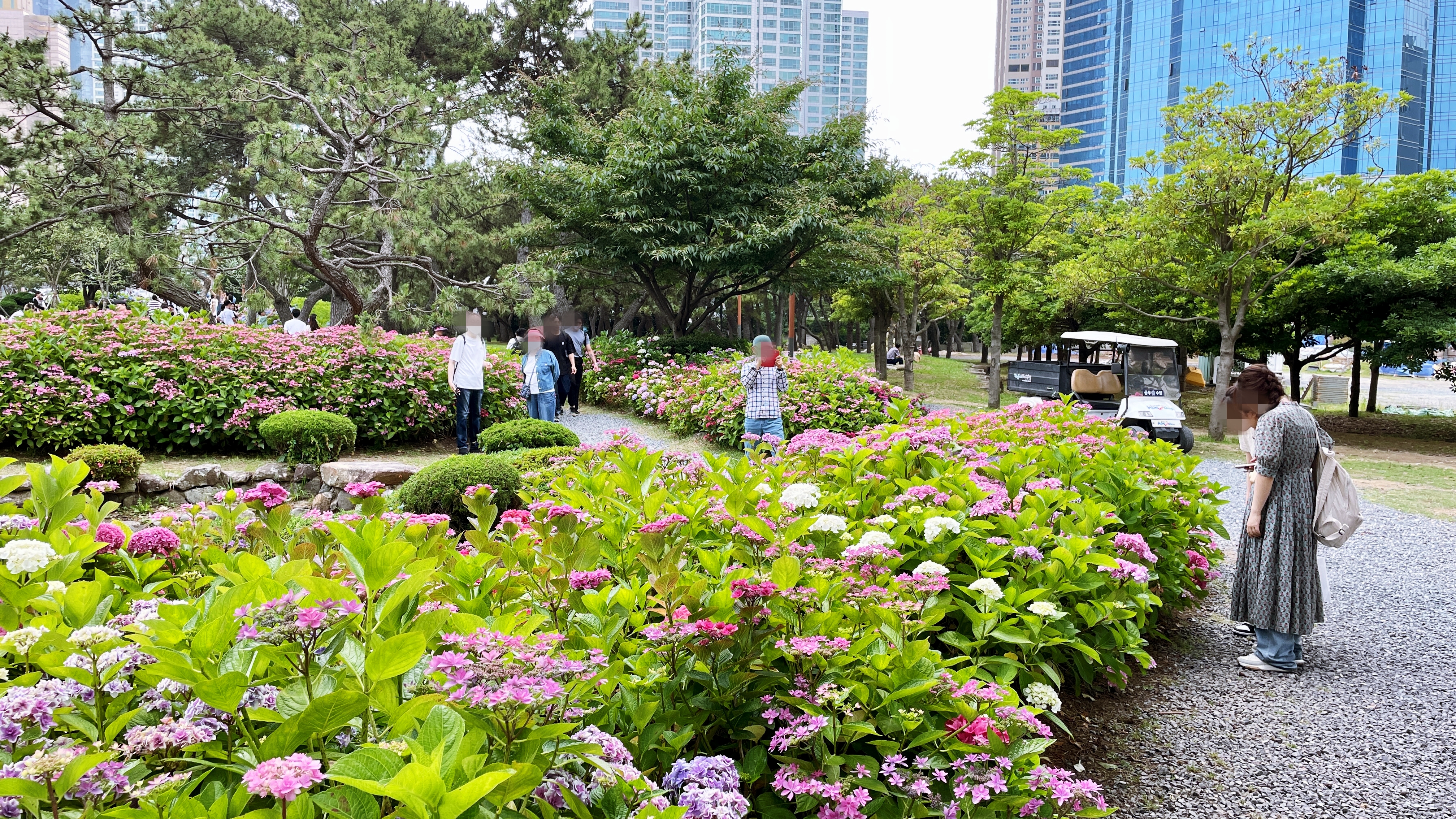 해운대 해수욕장이 뒷편으로 울창한 소나무 숲으로 이루어진 송림공원이 있다. 하지만 해운대 해수욕장 찾는 관광객들은 대부분 해변쪽 산책로를 따라 이동하다 보니 해운대 송림공원은 거의 스쳐 지나가는 경우가 많다. 하지만 해운대 송림공원은 울창한 소나무 숲길과 함께 6월-7월이면 아름다운 수국들이 만개해 수국꽃밭으로 변신한다. 마치 소나무와 수국이 서로 공생하고 있듯이 피어나는데 정말 예쁘다. 숲길 좌우로 수국들이 필어나 수국 꽃길이 된다. 보라, 분홍, 파랑, 하양 다채로운 빛깔의 수국 중 가장 눈에 띈 것은 장미수국, 엔들레스 썸머 그리고 하얀 나비가 내려앉은 듯한 미국 수국.