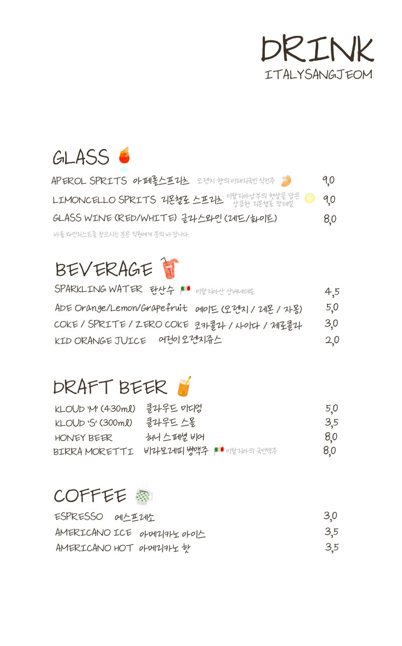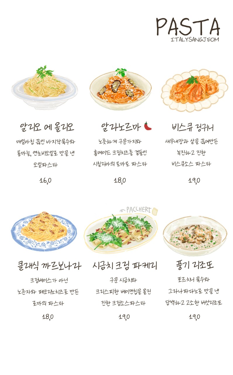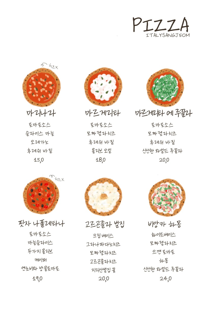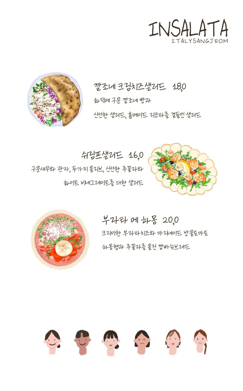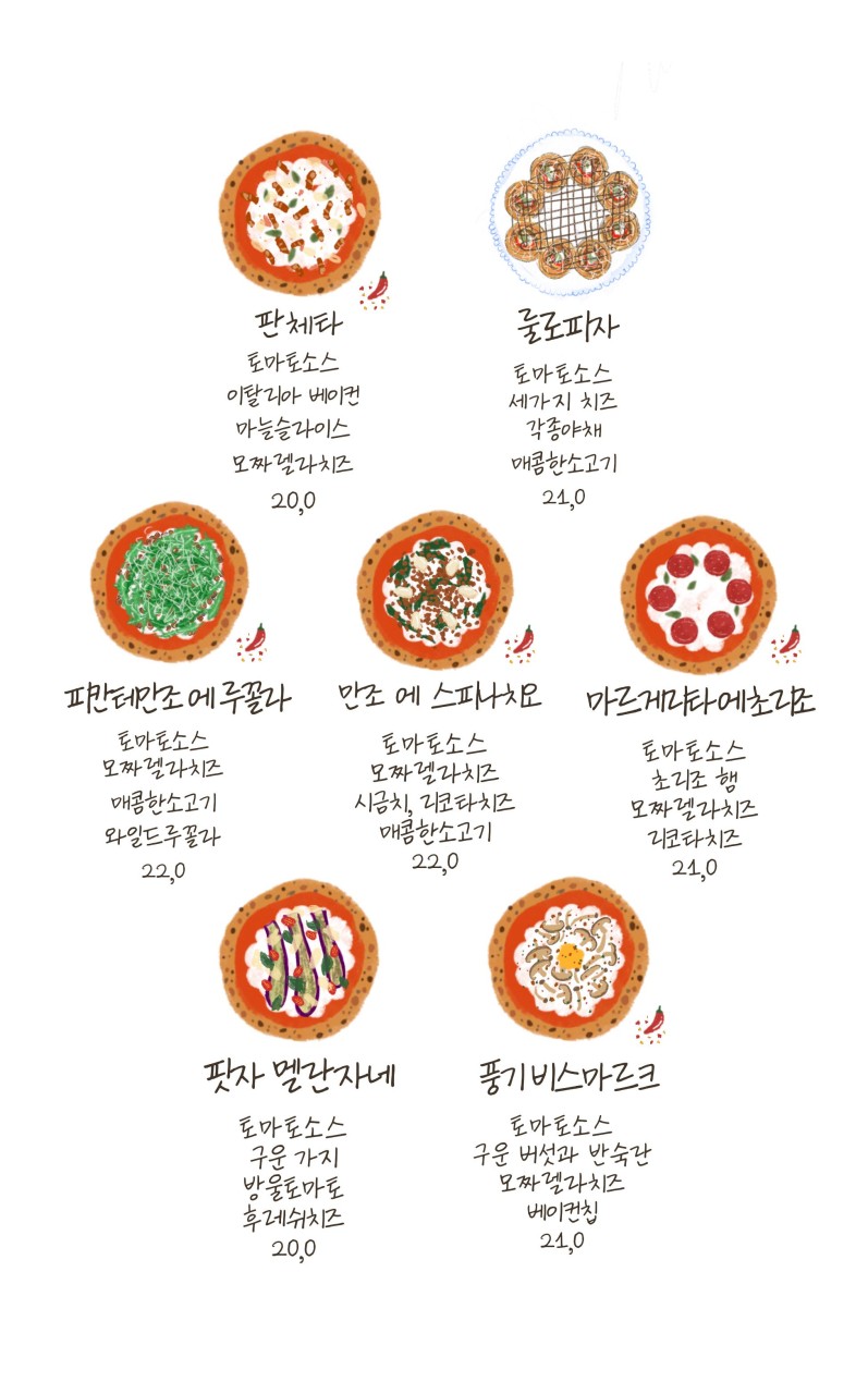 메뉴는 인살라타(이탈리아어로 샐러드를 의미), 피자, 파스타 그리고 음료가 있다. 가격은 약간 비싼 편이기도 하지만 그만큼 음식들이 정성 가득 맛있다. 이태리 현지의 맛을 느낄 수 있다