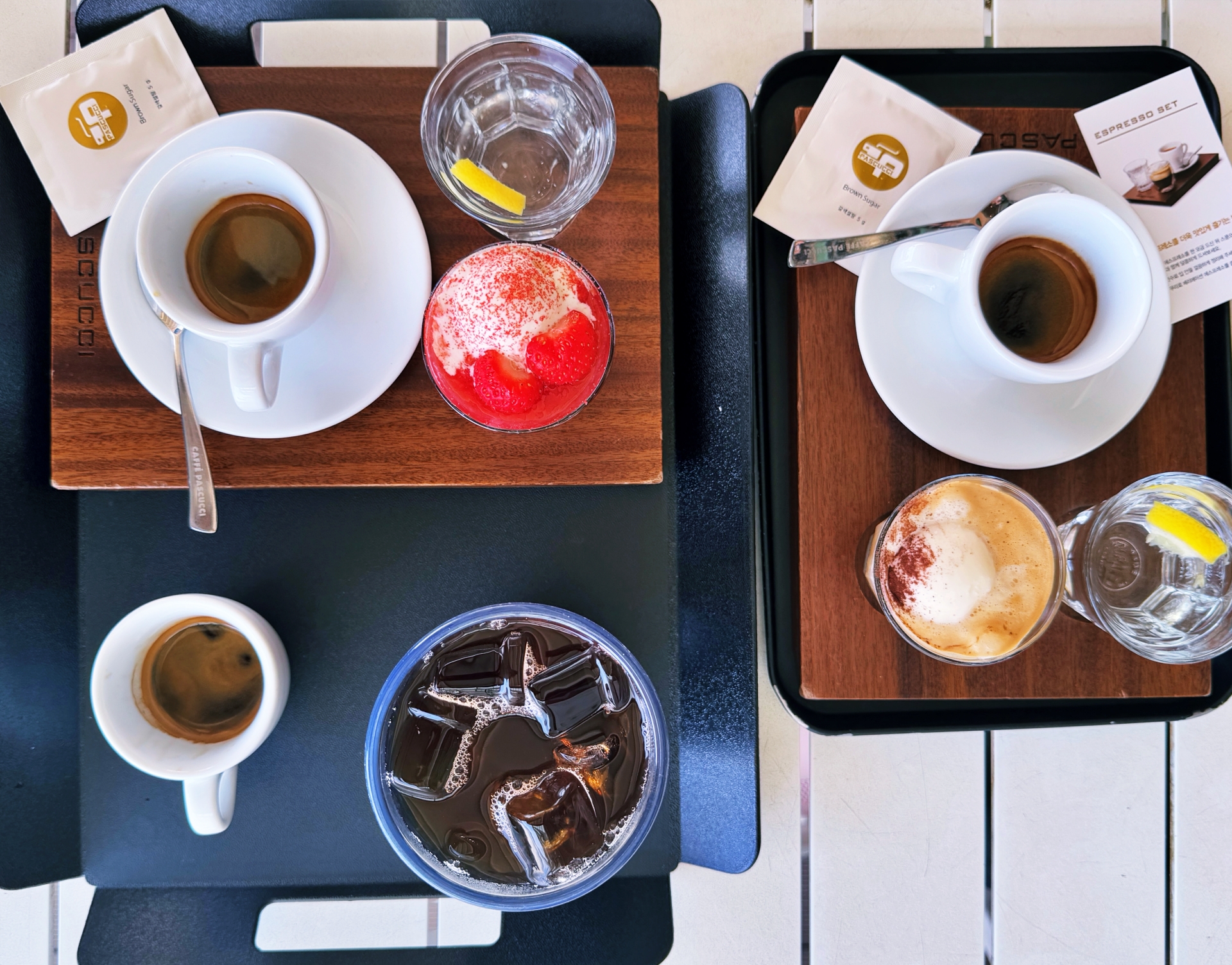 우리는 에소플 딸기 아포가토 세트, 에소플 아포가또 세트, 그리고 아이스 아메리카노를 주문해 먹었다. 에스프레소 세트를 더욱 맛있게 즐기는 방법은 먼저 에스프레소를 한 모금 드신 뒤 스푼으로 저어 설탕과 함께 달콤하게 먹는다 → 레몬수로 입안을 깔끔하게 정리해 준다 → 마무리로 베리에이션 에스프레소를 즐기시면 된다.