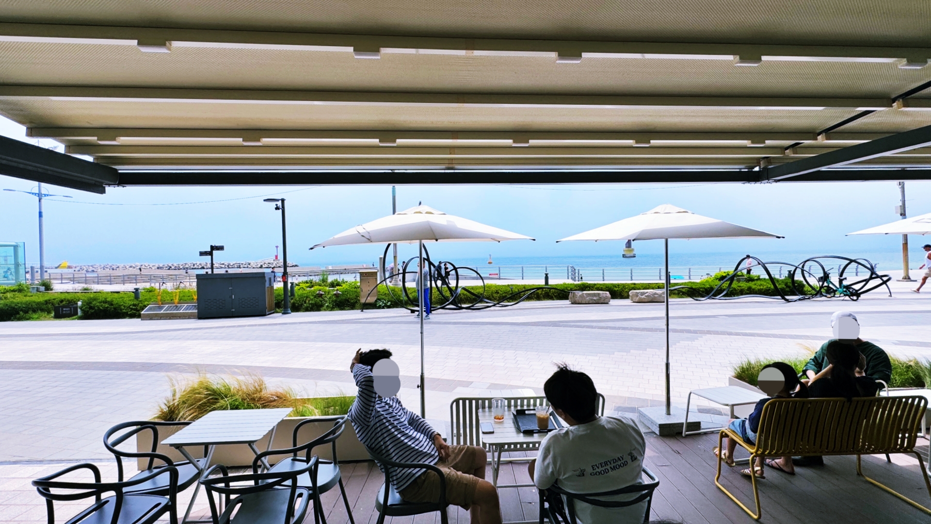 '파스쿠찌 에스프레소바 해운대엘시티점'의 매력은 해운대 비치 뷰. 해운대 비치 뷰를 잘 즐길 수 있도록 야외 테라스에도 테이블들이 배치되어 있는데 대부분의 손님들이 이 야외 테이블을 선호. 차양막이 있어 햇빛을 가려줄 뿐만 아니라 에이컨은 없어도 시원한 바닷바람이 솔솔 불어와 덥지도 않다. 야외 테이블에 앉아 에스프레소 커피 한잔을 하면서 해운대 해수욕장의 아름다운 해변뷰를 감상하다보면 시간가는 줄 모른다.