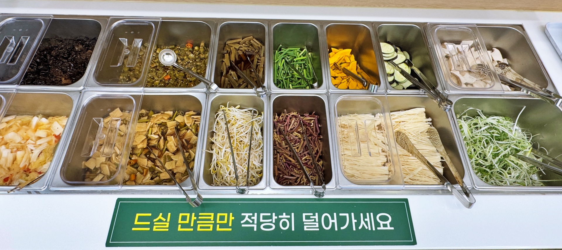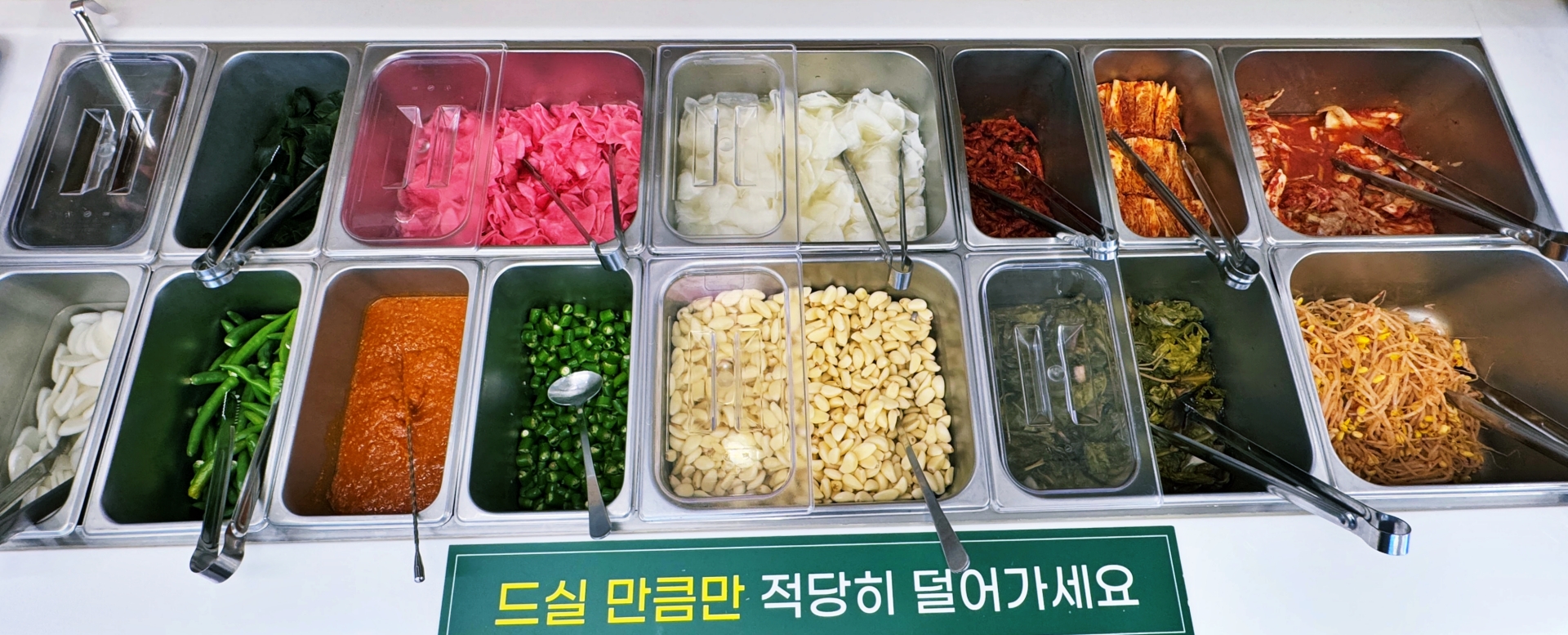 이 집에 높은 점수를 주는 이유중 가장 큰 것은 셀프바. 1인당 2,000원만 추가하면 정말 다양한 쌈야채, 쌈재료, 구이재료, 밑반찬들을 무한정 갖다 먹을 수 있어 너무 만족스럽다. 고기와 함께 구워 먹을 수 있는 목이버섯, 송이버섯, 팽이버섯, 숙주, 고사리, 가지, 호박, 김치, 콩나물, 떡 등은 물론 쌈무, 고추, 마늘, 파채, 마늘쫑, 각종 장아찌류 등 고기와 함께 먹을 수 있는 밑반찬들과 상추, 깻잎, 청겨자, 쌈배추, 배추, 적근대, 다시마, 뉴그린 등 쌈야채 등이 준비되어 있다. 정말 종류가 다양하다. 거기다 무한 리필.