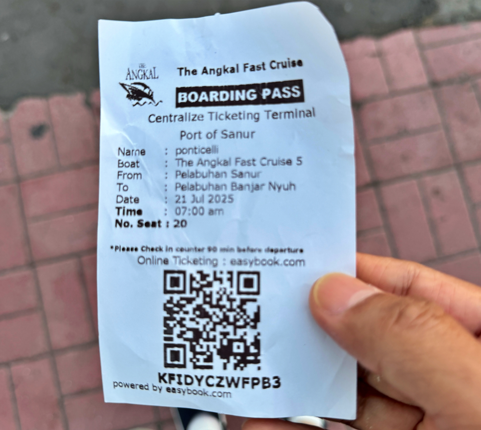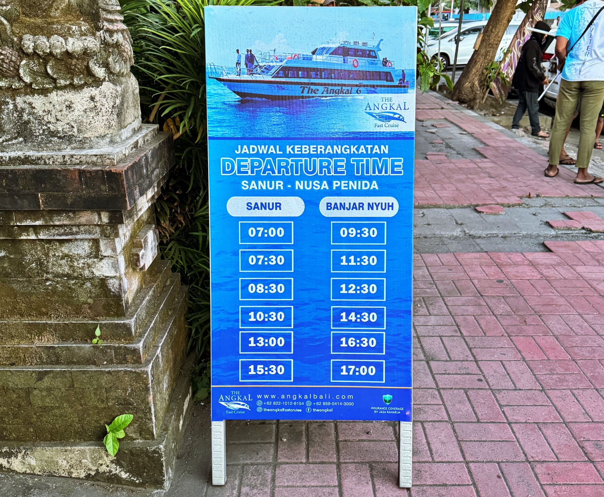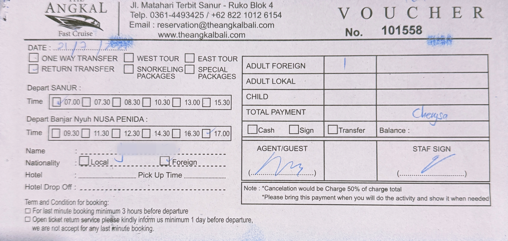 본인은 여행사를 통해 투어상품을 예약했는데 발리 사누르 ↔ 누사페니다 패스트 보트(고속 페리)는 Angkal Fast Boat를 이용했다. 여행사를 통해 Angkal Fast Boat 카운터에서 바로 실물 티켓으로 교환했다. 참고로 왕복 티켓을 끊은 경우 올 때 실물 티켓으로 교환할 수 있는 바우처를 같이 준다(분실하지 않도록 꼭 보관)
