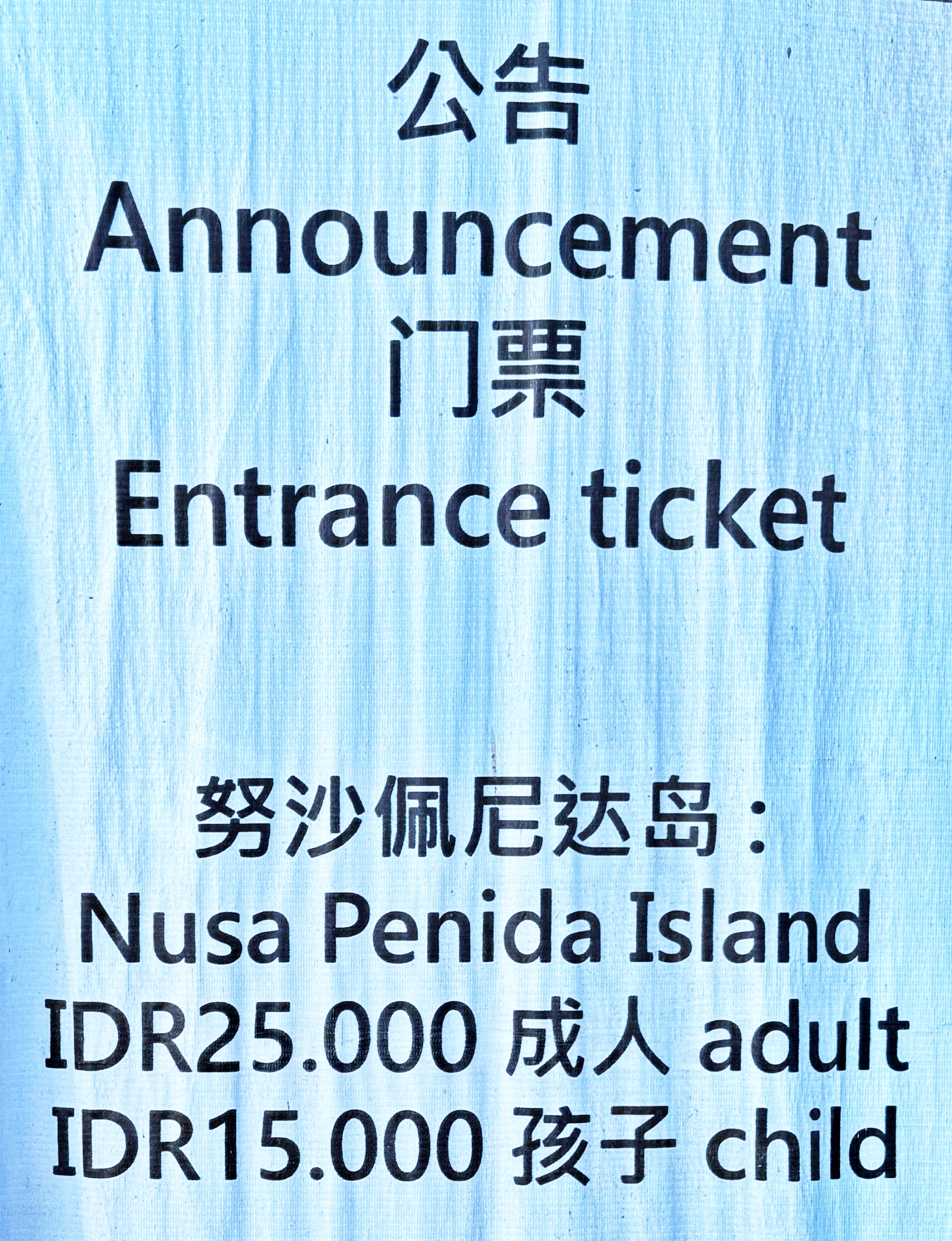 선착상에 내려 누사 페니다 관광을 시작하려면 먼저 누사 페니다 섬 입장료(입도세) 25,000루피아를 내야 한다. (누사페니다 입장료를 내었다고 해도 관광지에 따라 별도로 입장료 및 주차비를 내야 한다)