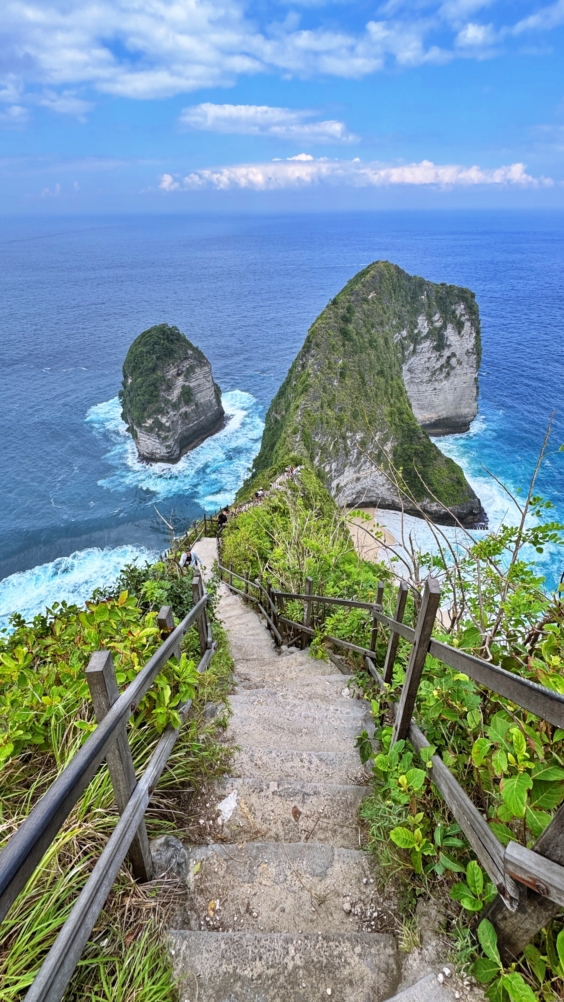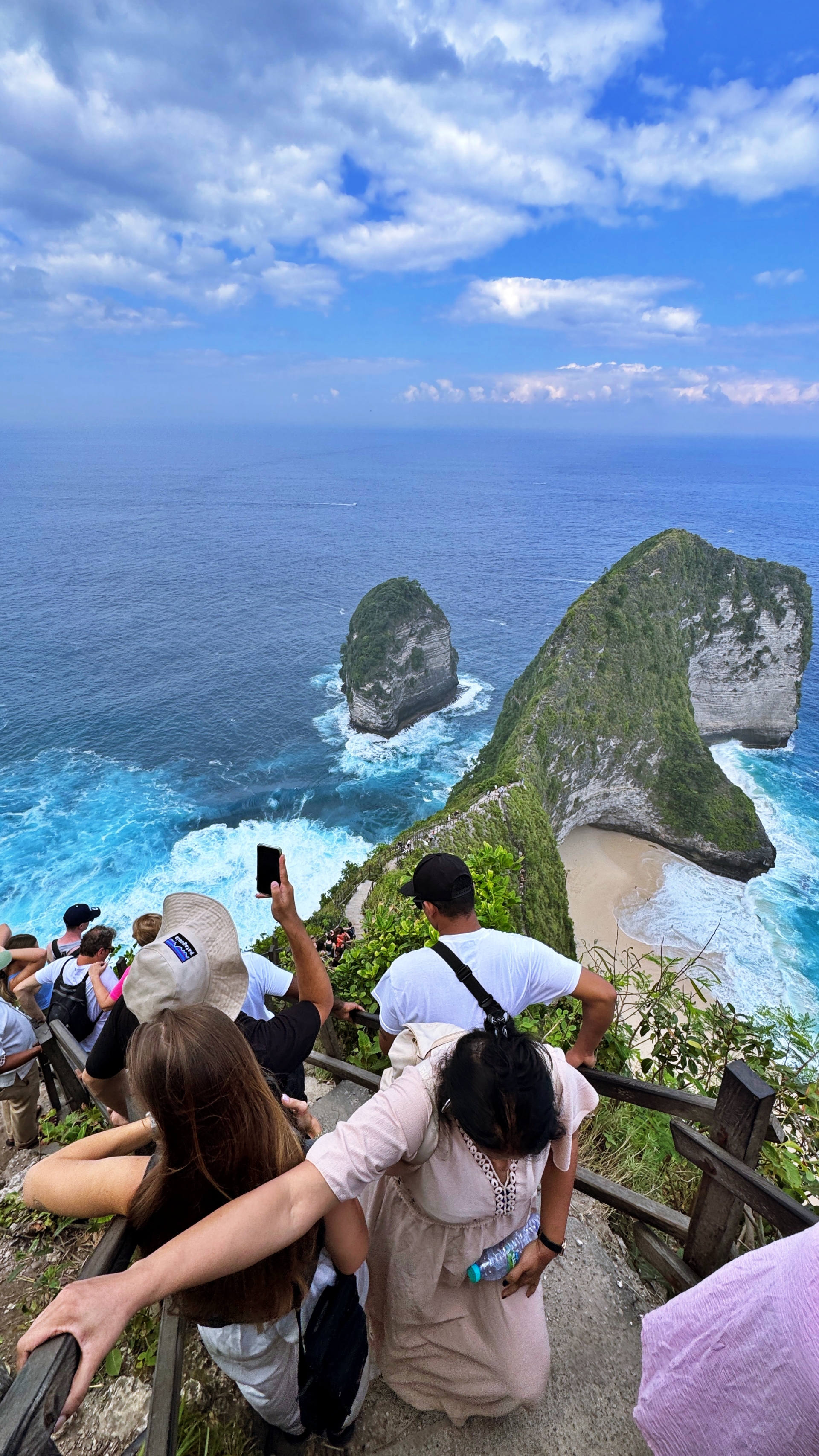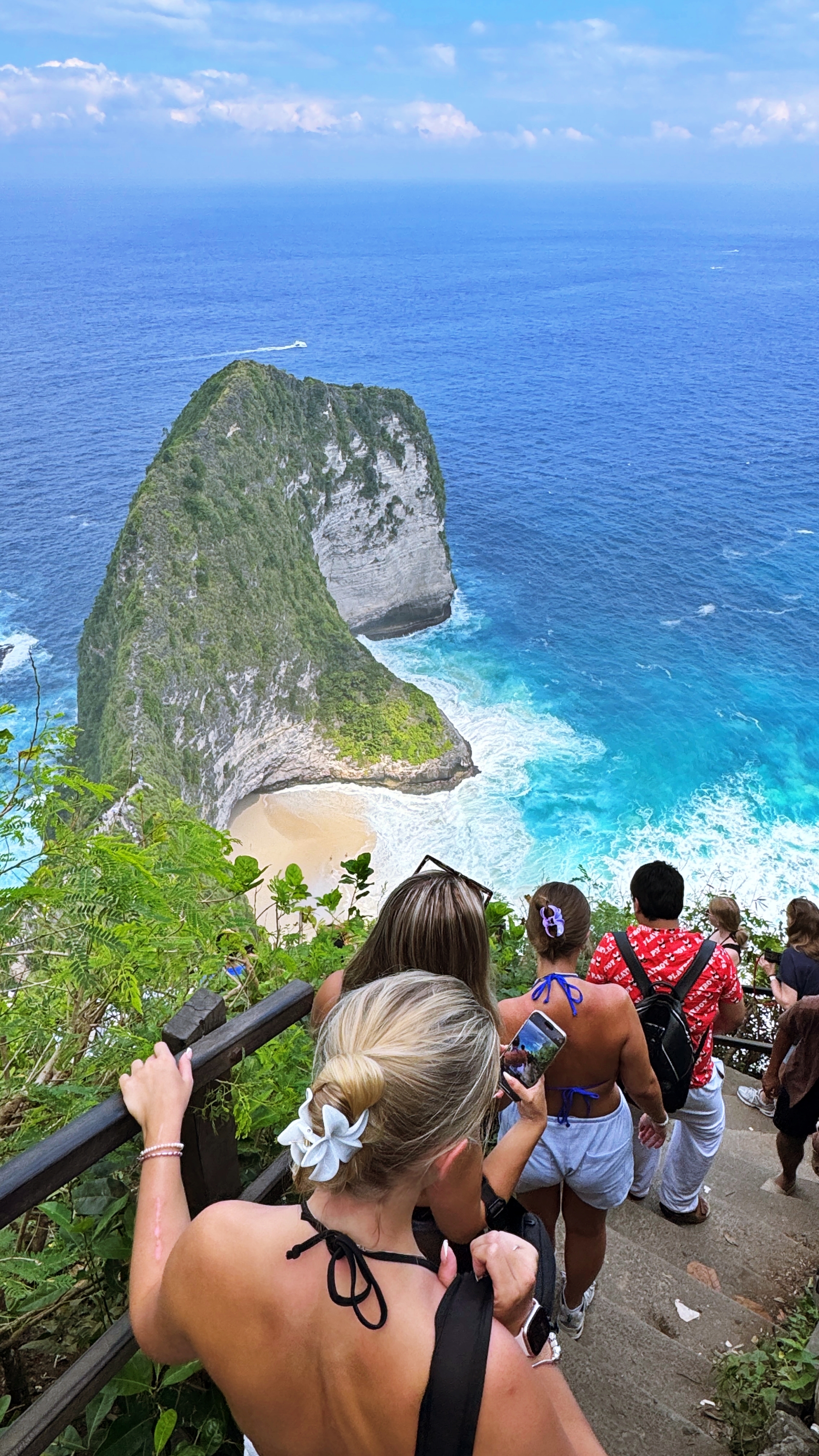 켈링킹 비치(Kelingking Beach)는 에메랄드 빛 푸른 바다와 하얀 모래 해변, 그리고 150미터 높이에 칼날같은 절벽이 어우러져 장관을 이룹니다. 켈링킹 비치에 가려면 꽤 험난한 경사가 심한 계단을 내려가야 하기 때문에 체력적으로 조금 힘들 수 있을 뿐만 아니라 계단이 다소 위험할 수 있으니 조심해야 합니다. 그래서 대부분 비치까지 내려가지 않고 절벽 꼭대기 위에서 인증샷을 많이 찍습니다. 절벽 꼭대기에서 바라보는 풍경도도 매우 인상적이며, 인스타그램과 다른 소셜 미디어에서 자주 볼 수 있습니다.