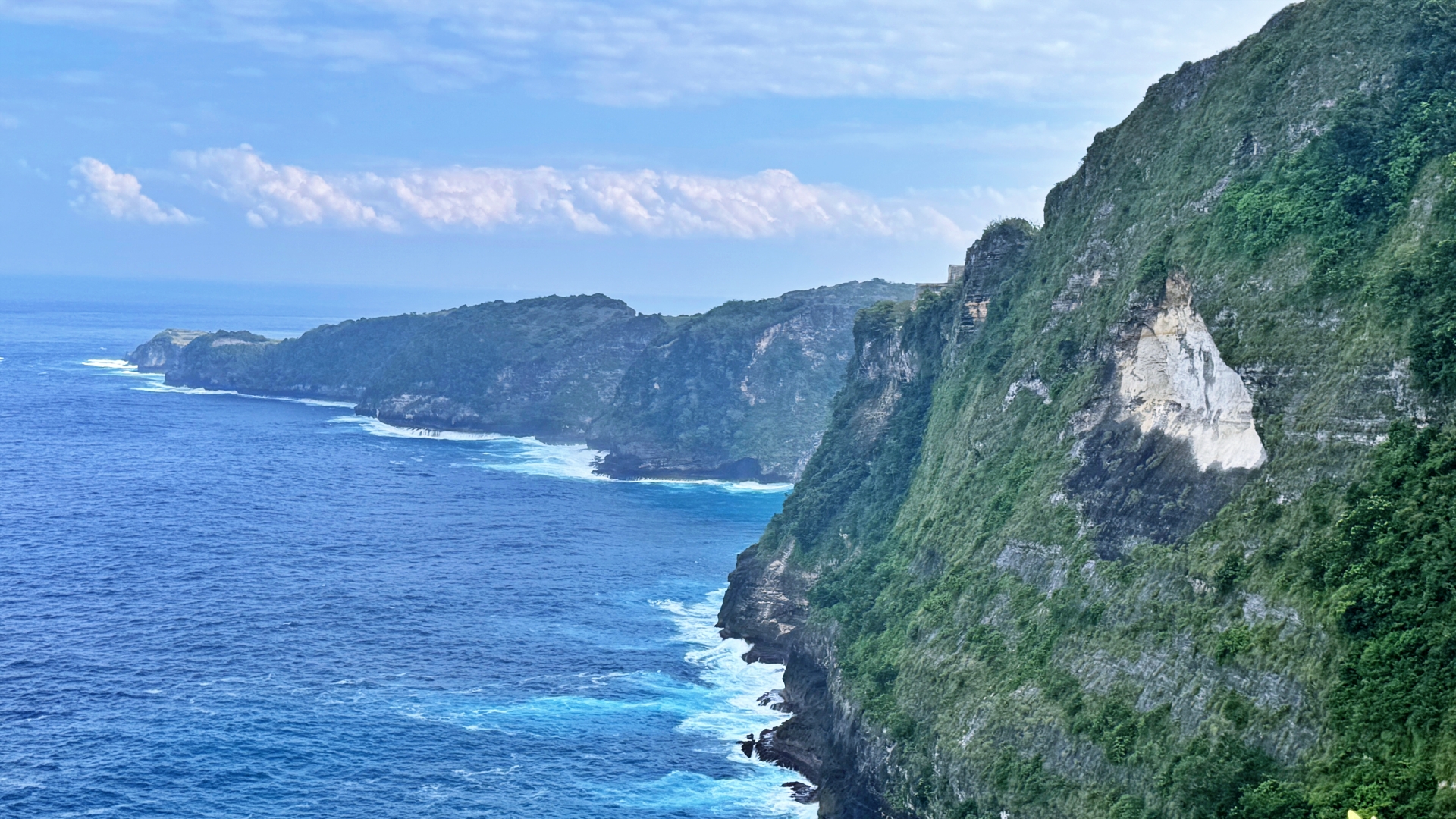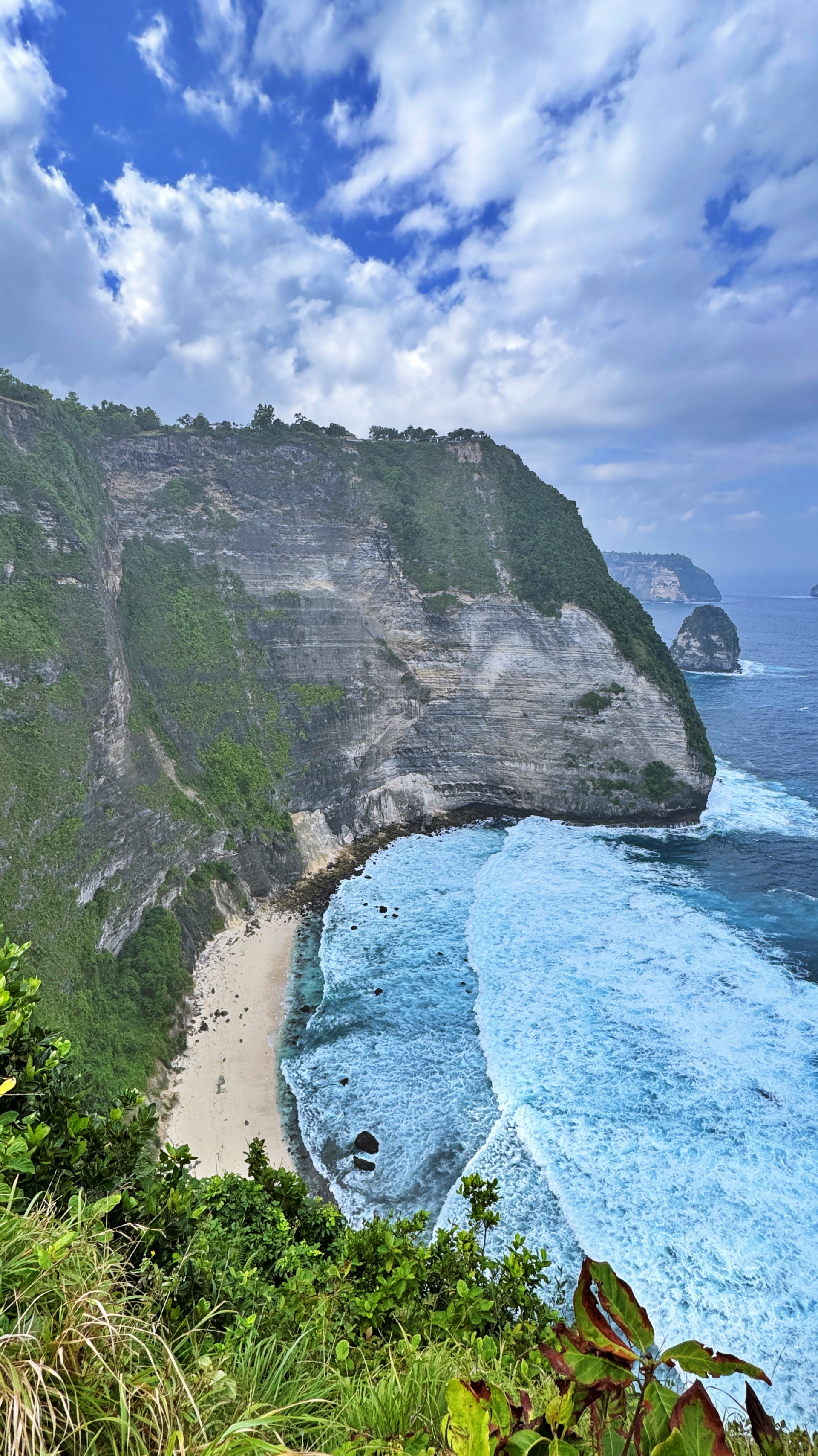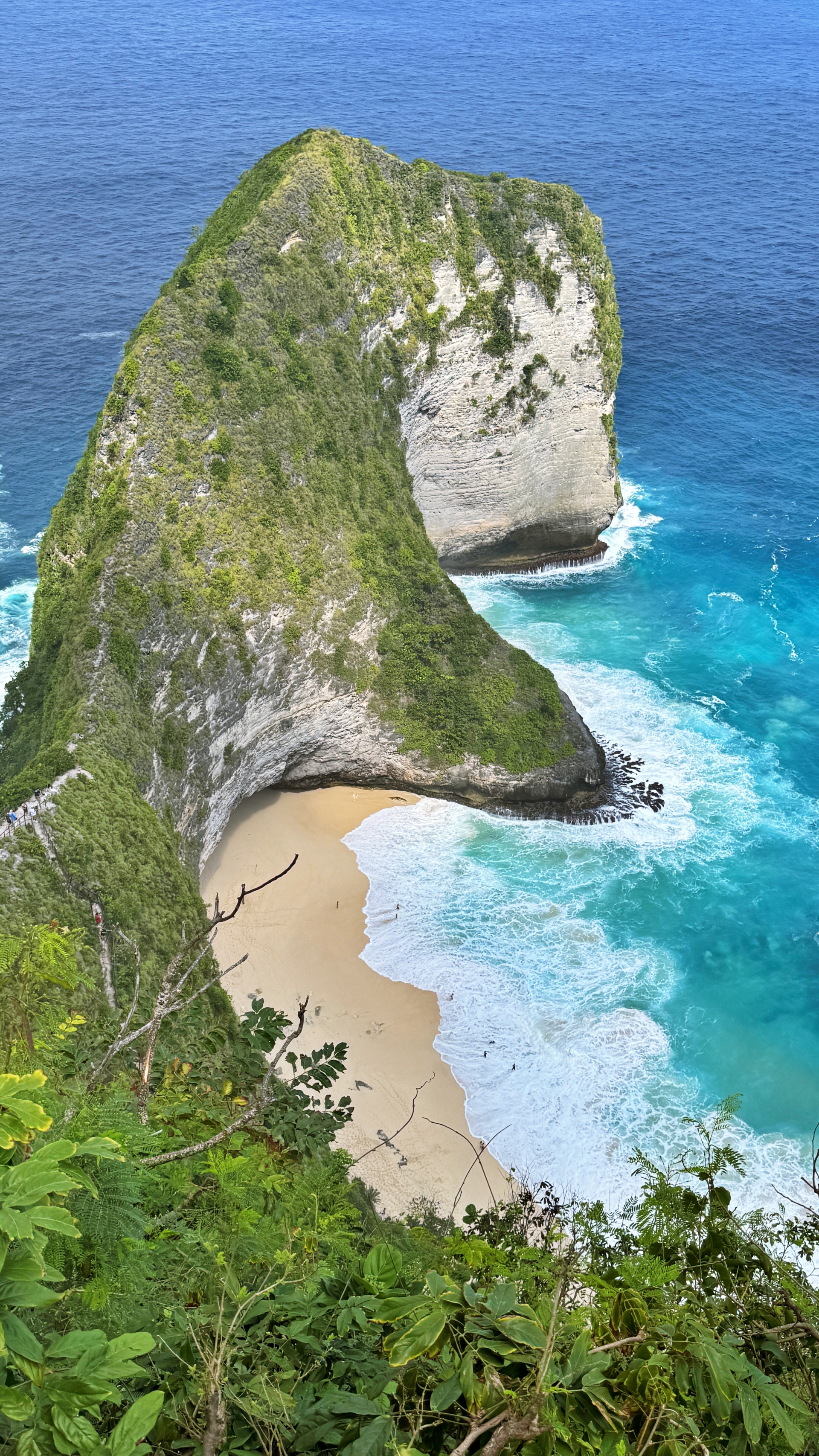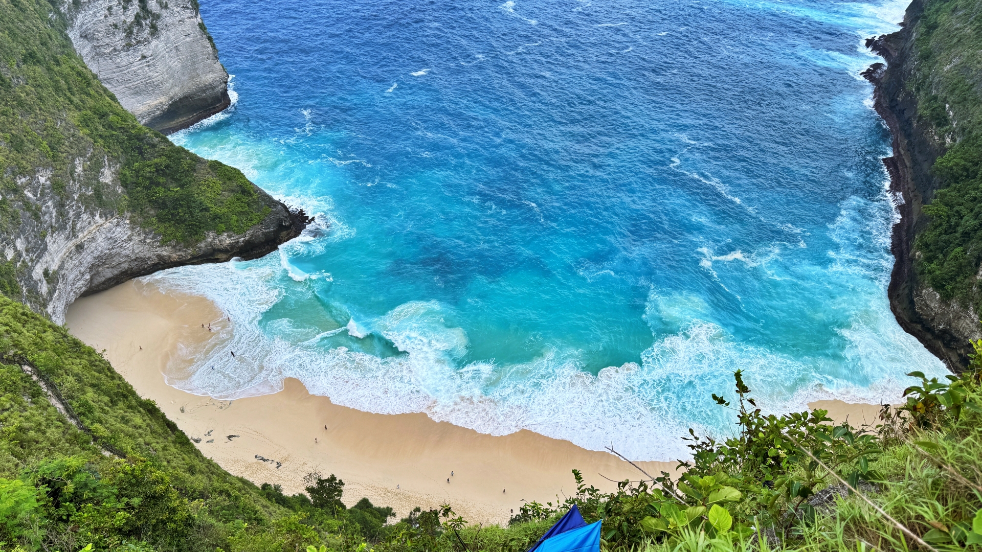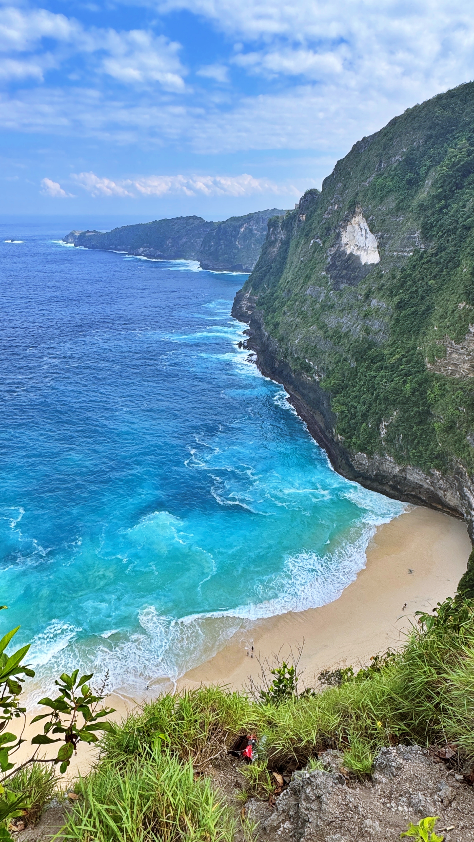 켈링킹 비치(Kelingking Beach)는 에메랄드 빛 푸른 바다와 하얀 모래 해변, 그리고 150미터 높이에 칼날같은 절벽이 어우러져 장관을 이룬다.