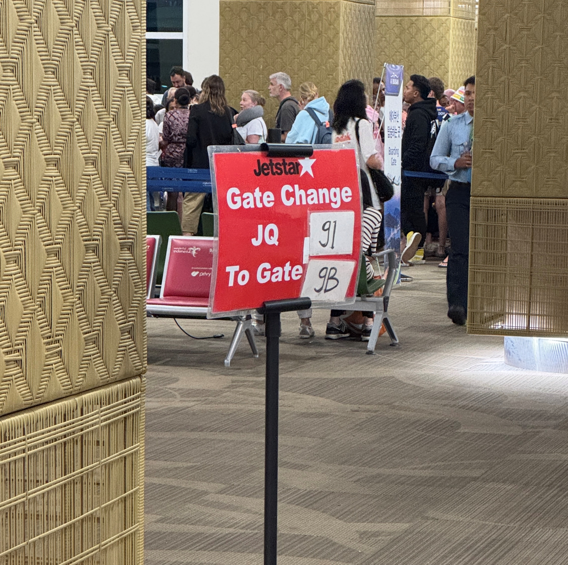 그런데 발리 덴파사르 공항에서 비행기에 탑승할 때 주의할 점이 있다. 탑승권에 표기된 게이트 번호만 믿고 있다가는 낭패를 볼 수 있다는 것. 저가항공사의 경우 탑승구가 자주 바뀐다는 것. 아래는 제트항공사 게이트 변경 안내. 에어부산도 마찬가지 바로 탑승 바로 직전에 탑승구가 바뀌어 승객들이 혼란스러웠다.