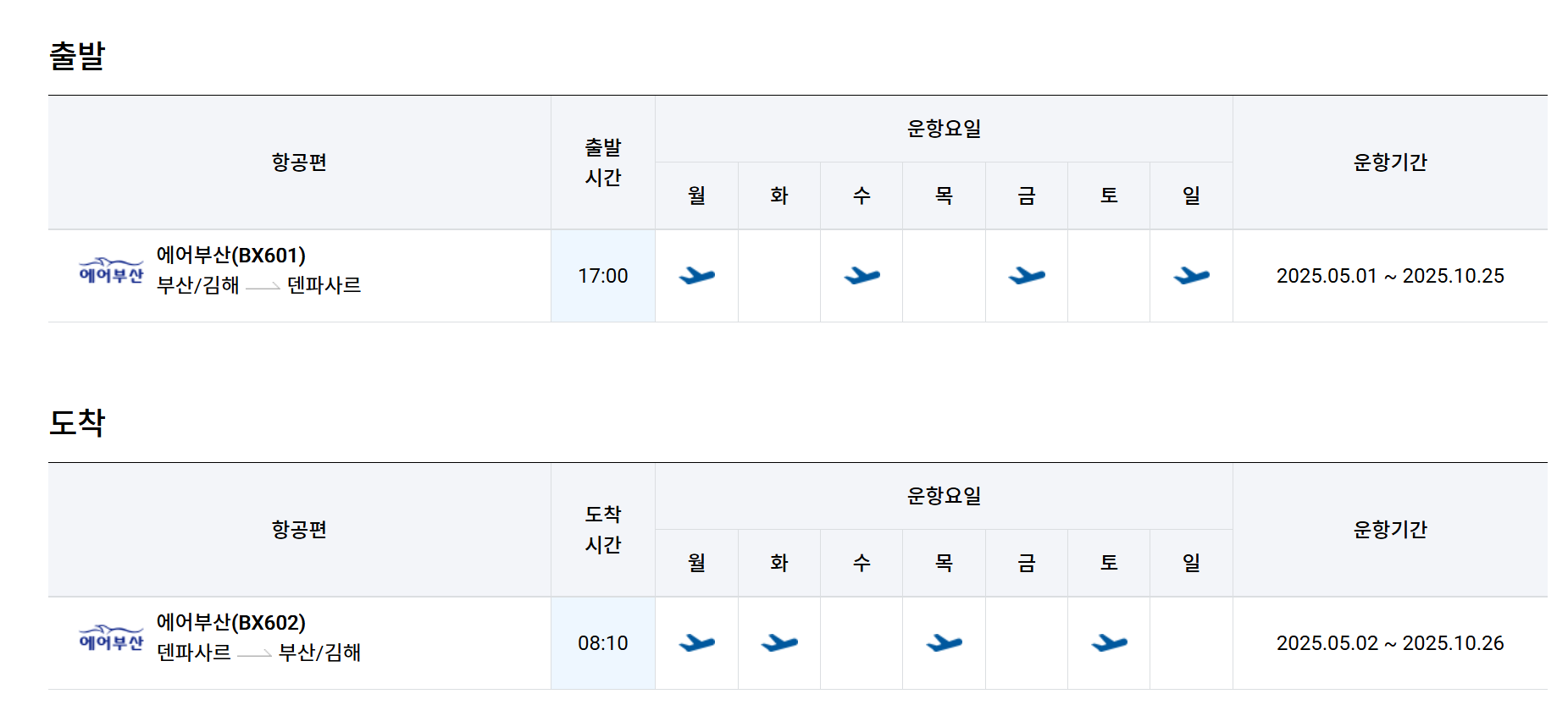현재 에어부산은 부산/김해 ↔ 발리/덴파사르을 주 4편 운행하고 있다. 부산/김해 → 발리/덴파사르 비행기편은 월/수/금/일 17:00에 있고 발리/덴파사르 → 부산/김해 비행기편은 화/목/토/월 00:05에 있다.