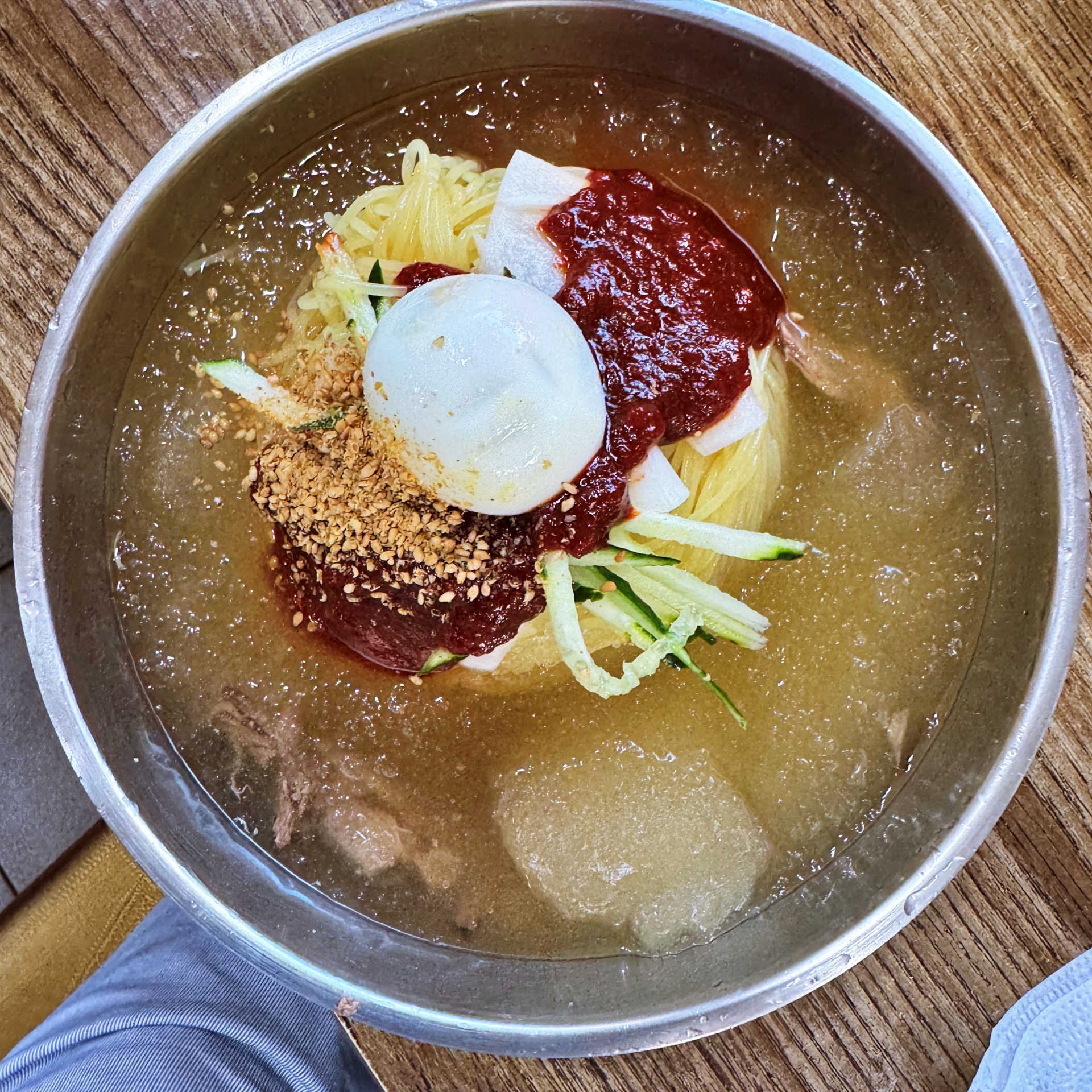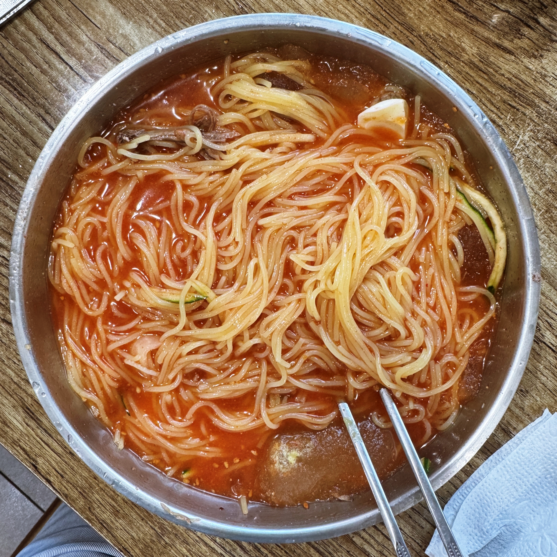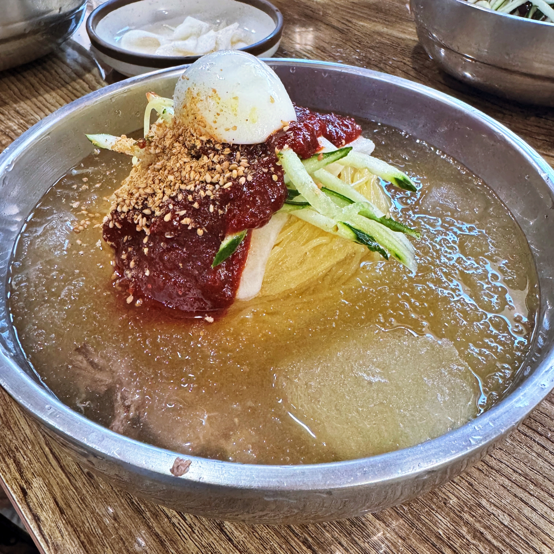 우리는 가족끼리 가서 물밀면 대 2개, 물밀면 소 1개, 비빔밀면 소 1개를 주문해 먹었다.