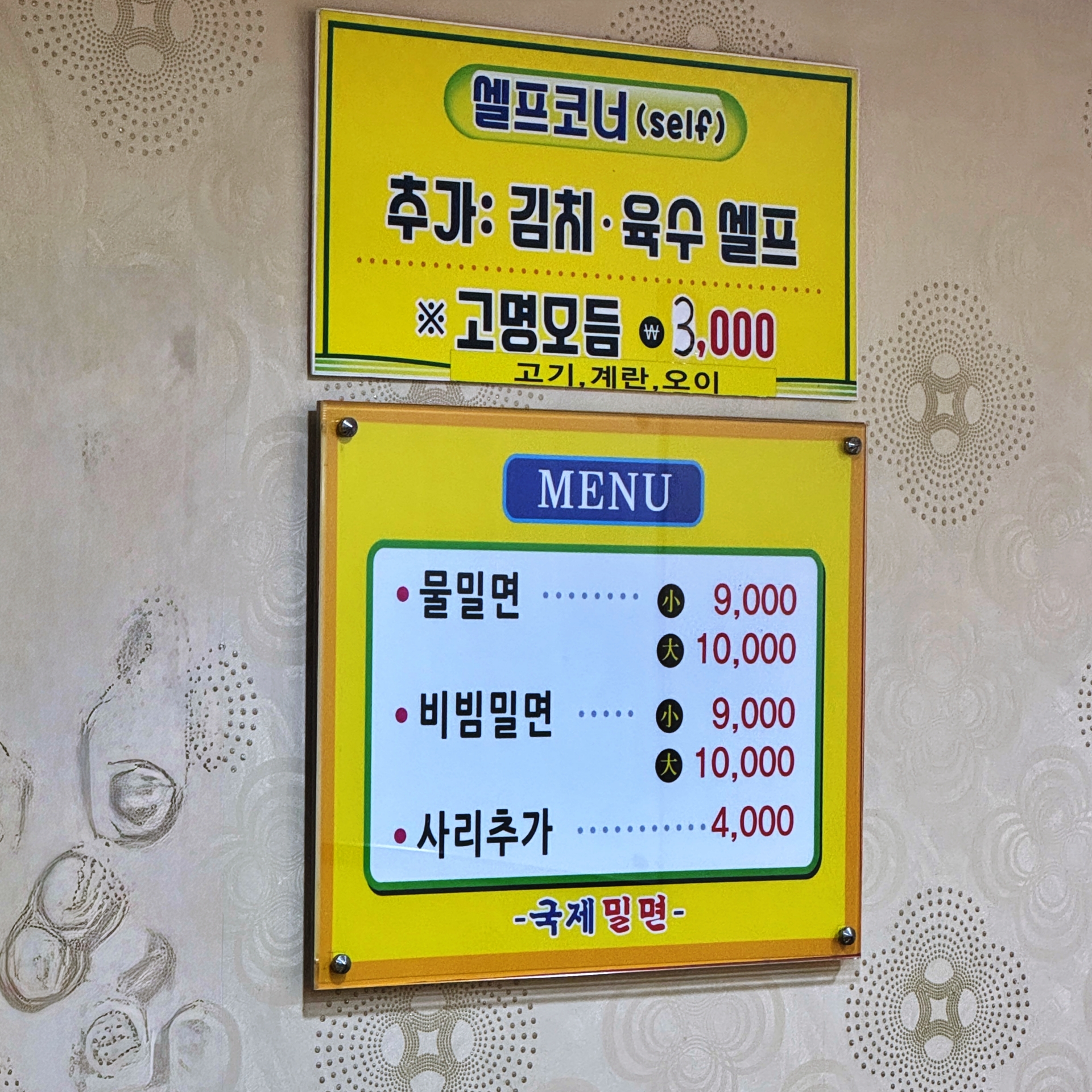 메뉴는 밀면 한가지. 만두나 수육 같은 사이드 메뉴 없이 오직 밀면으로만 승부하는 곳이다. 밀면은 물밀면과 비빔밀면 2종류가 있다. 가격은 물밀면/비빔밀면 소(보통) 9,000원 대(꼽배기) 10,000원이다. 부산지역 밀면집 일반적인 가격과 비슷하다. 예전보다 가격이 많이 올랐지만 그래도 냉면에 비해선 아주 저렴하다.