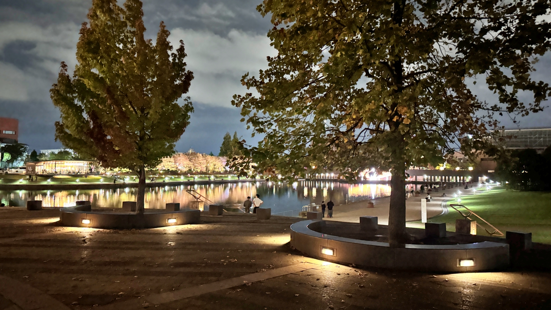 후간 운하의 옛 보트 계류장을 둘러싸고 있는 이 수변 공원은 도야마역에서 도보로 약 9분 거리에 있다. 넓고 푸른 잔디밭과 잘 조성된 호수 주변 산책로 덕분에 이 공원은 도심 속에서 산책과 휴식을 즐길 수 있는 곳으로 널리 사랑받고 있다.
