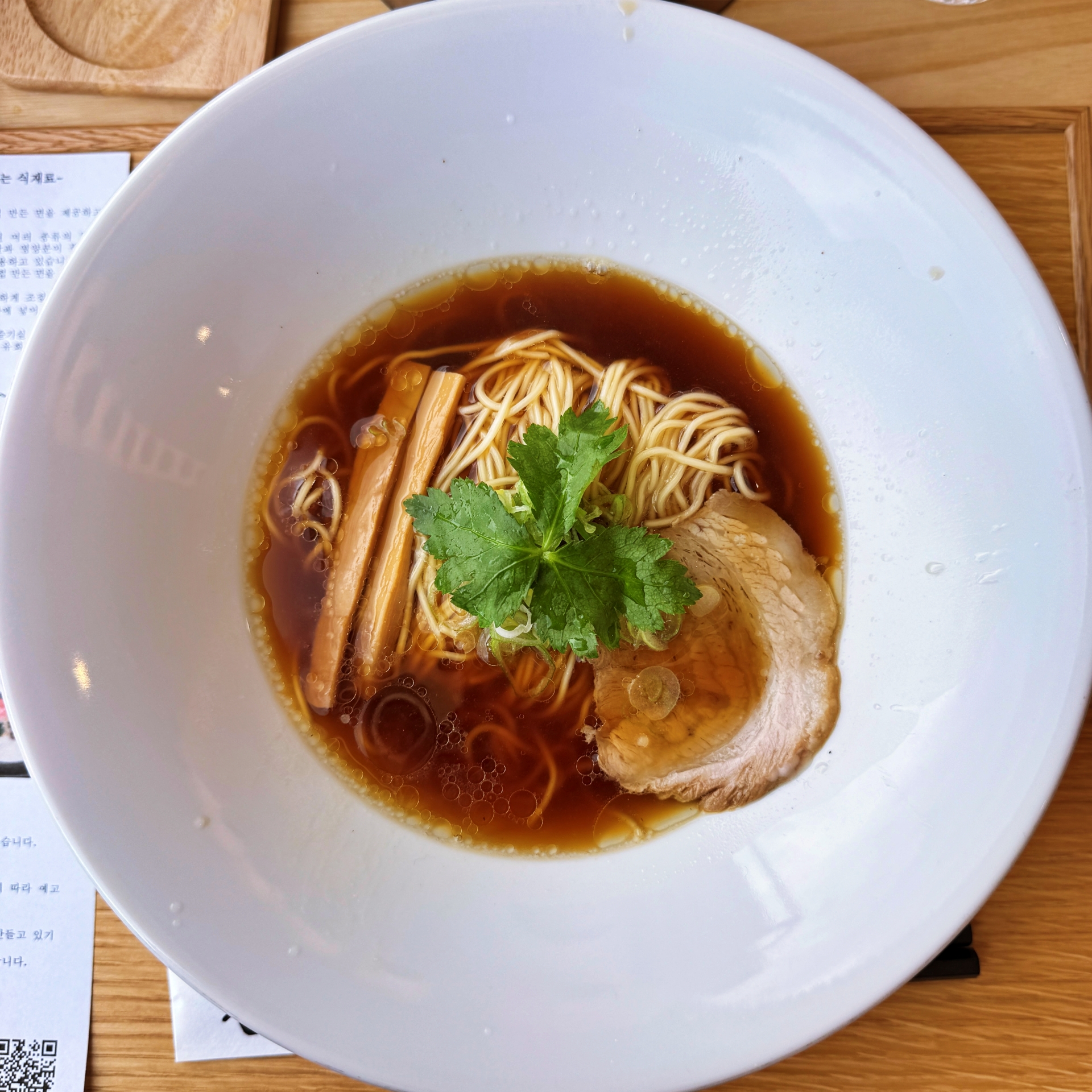 우리는 다카야마 라멘을 2개 시켰다. 정말 깔끔하게 플레이팅 되어 나온다. 일본 라멘은 쇼유 라멘 (간장 기반), 미소 라멘 (된장 기반), 시오 라멘 (소금 기반), 톤코츠 라멘 (돼지 뼈 국물 기반) 여러 종류가 있는데 다카야마 라멘은 쇼유라멘 같으면서도 많이 다르다. 일단 다른 일본 라멘에 비해 덜 짠 편이다. 훨씬 더 부담없이 먹을 수 있다. 그러면서도 깔끔 담백한 맛이다. 면도 뭔가 다른 일본 라멘에 비해 식감이 다르다. 아무튼 정말 맛있게 멋었다. 무조건 추천. 아쉬운 점은 양이 적다는 것.