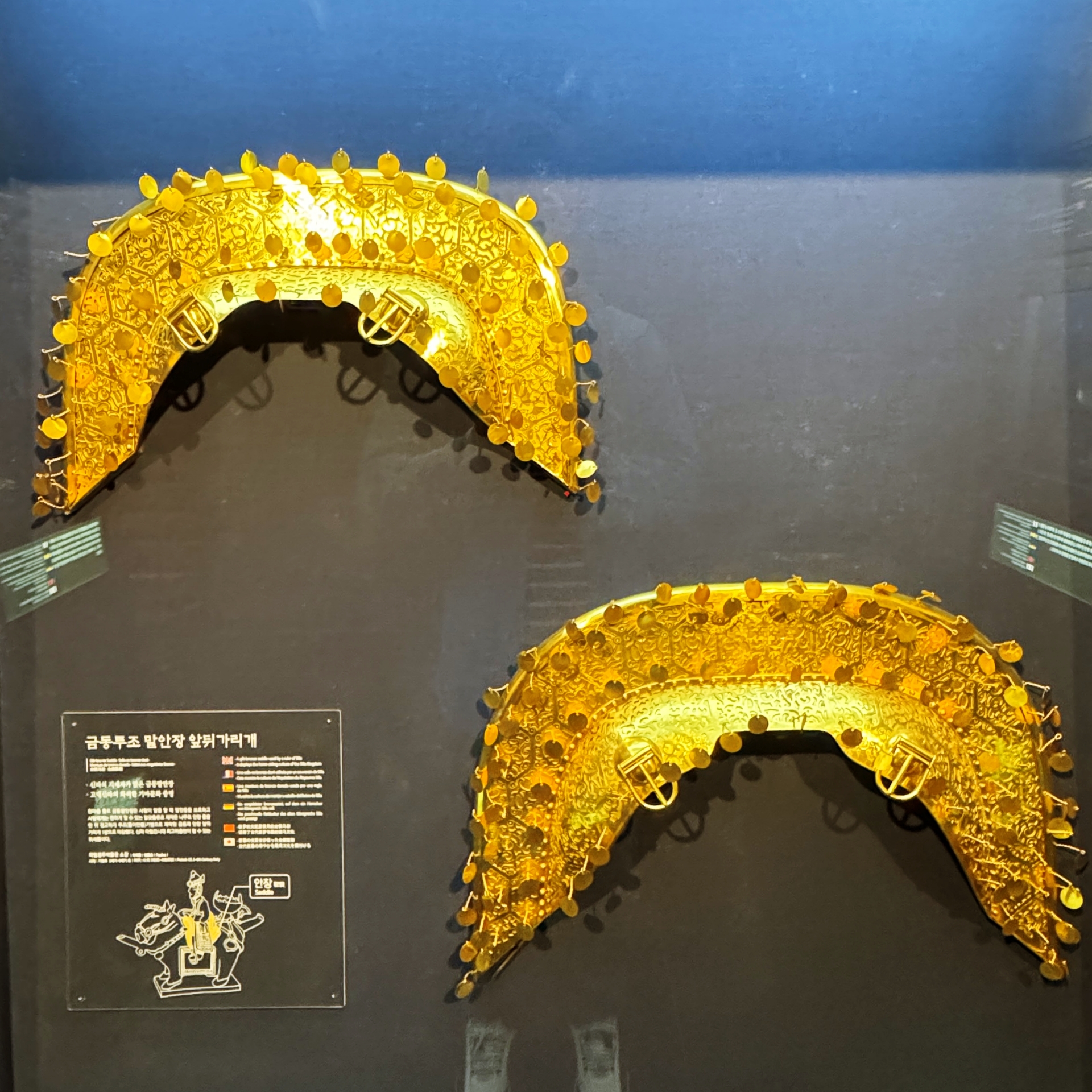 금관 옆으로 금 장신구들이 전시되어 있는데, 새가 날개를 활짝 핀 모양의 화려한 금장식은 신라 사람들이 쓰는 모자에 꽂는 것으로 추측되며, 금 허리띠에는 물고기와 곡옥, 철기를 만들 때 사용하는 숫돌과 집게 모양을 한 많은 장식들이 달려 있다.