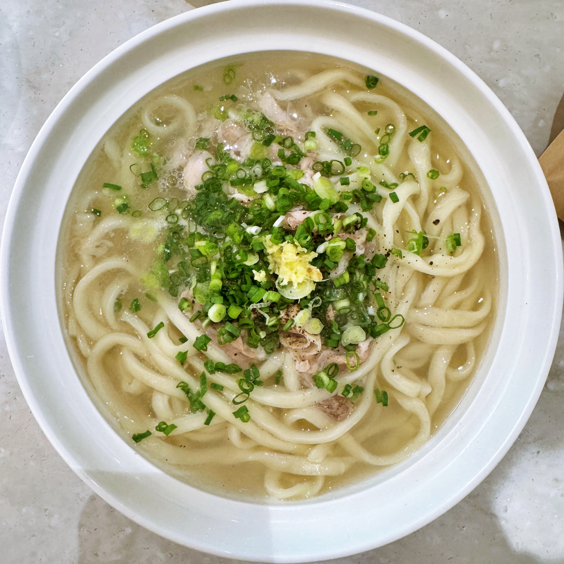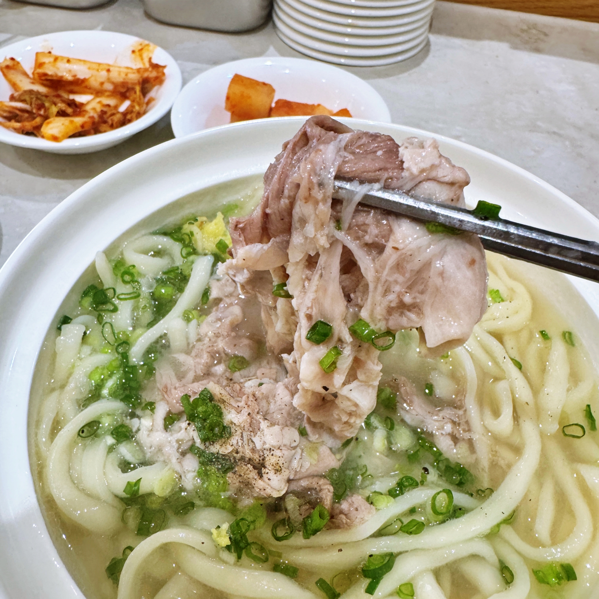 맑은 곰탕 국물에 쫄깃한 생면을 넣어서 색다른 칼국수. 명경지수라는 표현에 걸맞은 투명한 국물에 곱게 말아낸 칼국수 생면이 묘하게 쌀국수의 느낌도 나면서 술술 넘어가는 맛이다. 돼지 쌀국수와 비슷한 듯싶다가도 면이 칼국수면이라 새로운 경험을 위한 메뉴로도 좋고, 하나의 맛있는 국수로도 흠잡을 것 없이 완성도가 높다.