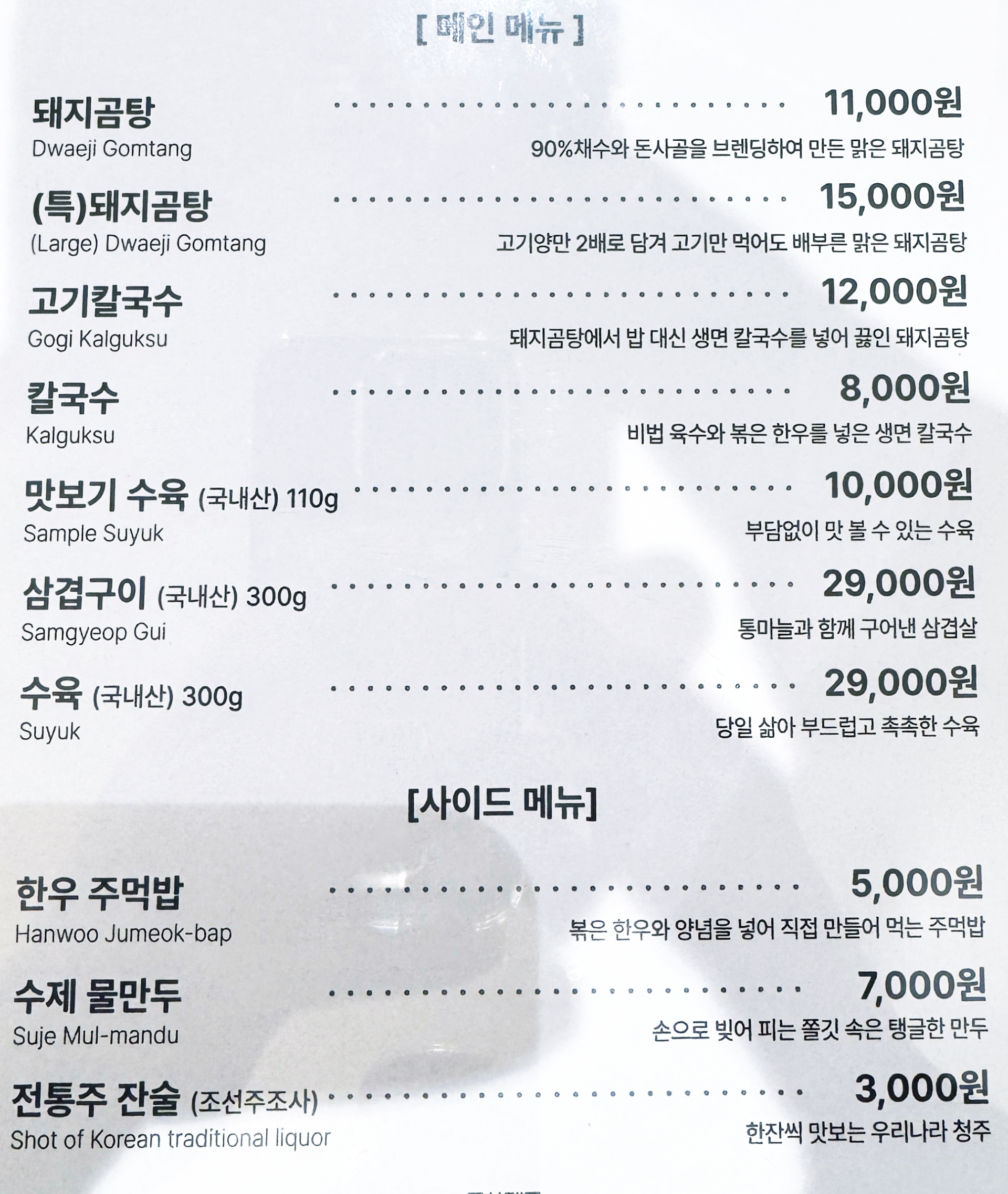 우리는 돼지곰탕 (11,000원)2개, 고기칼국수 (12,000원)2개 그리고 수제물만두 (7,000원)을 주문해 먹었다.