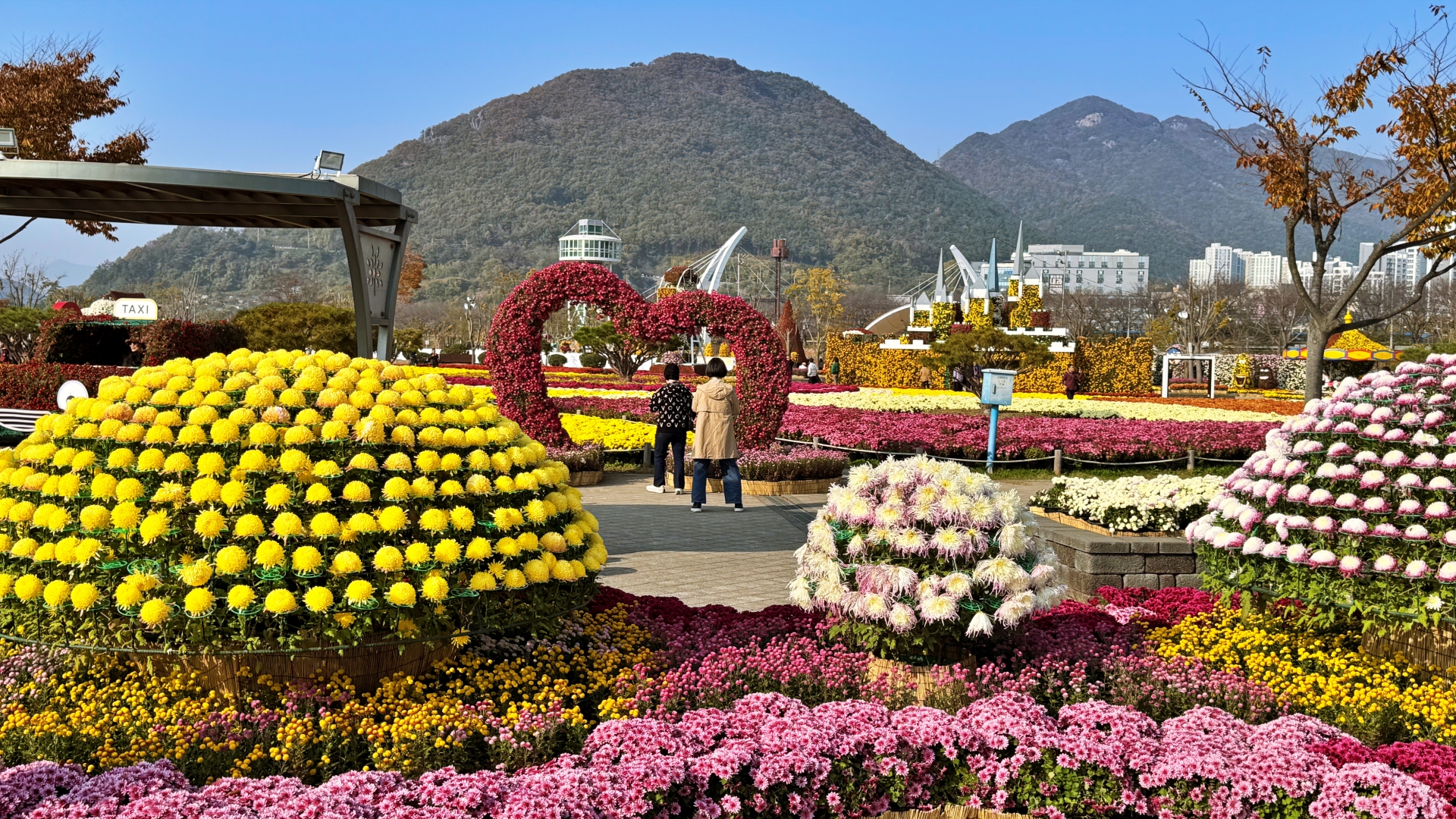 가을의 시작과 함께 황산공원 중부광장은 황화 코스모스로 물들었으며, 청명한 하늘 아래 활짝 핀 꽃들은 사진 촬영 명소로 인기를 끌고 있다.