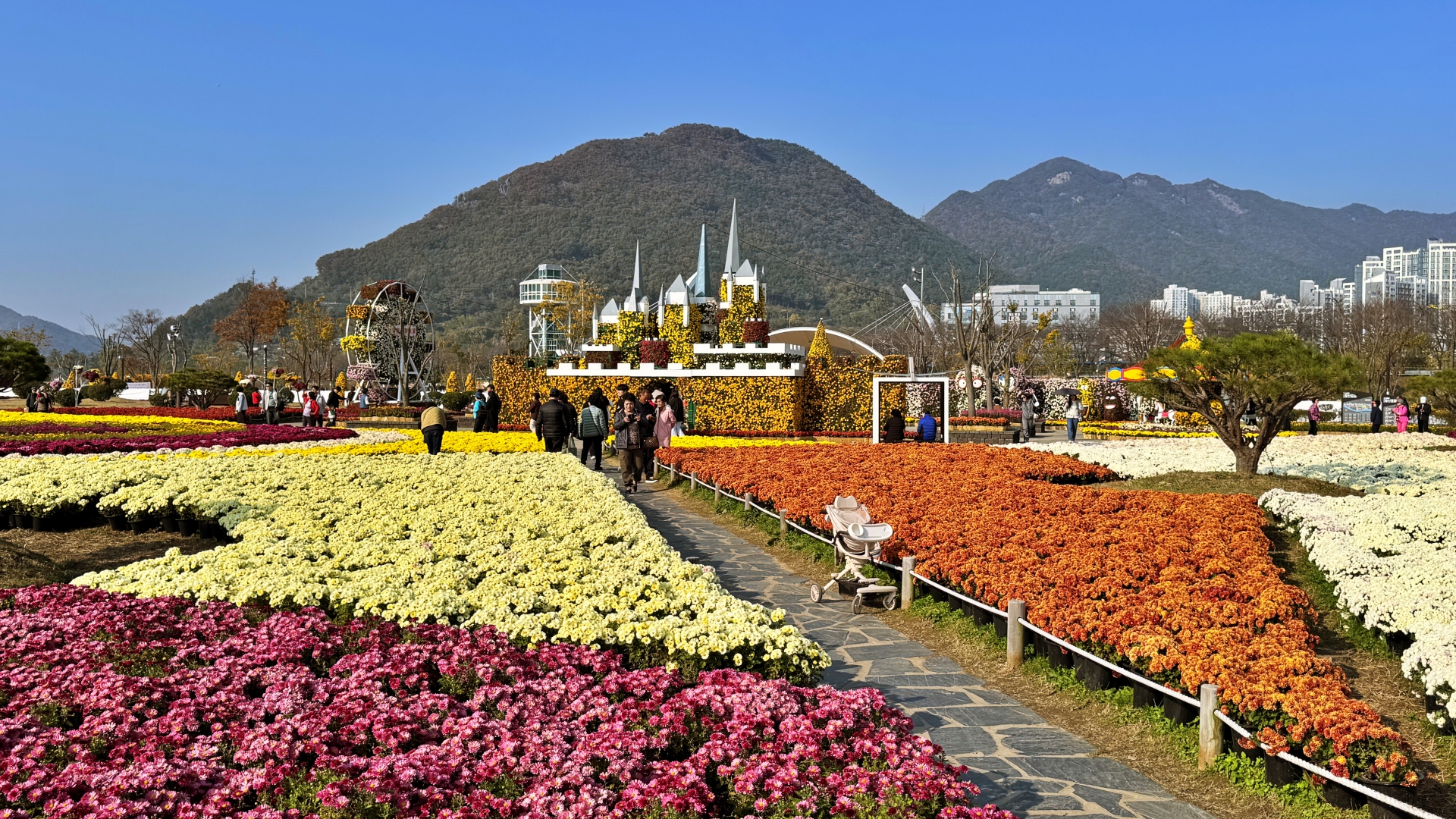 중부광장 일대에는 알록달록한 백일홍이 만개해 있으며 공원 주변으로는 은빛 갈대 물결을 만날 수도 있다.