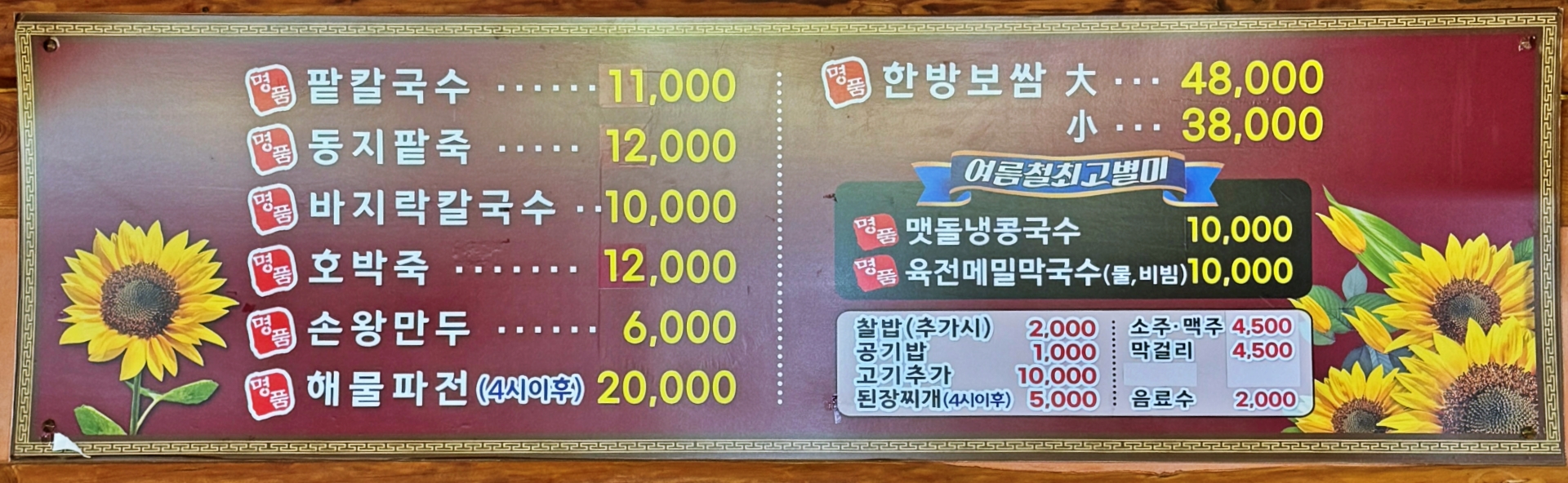 메뉴는 한방보쌈(소 38,000원, 대 48,000원), 팥칼국수(11,000원), 동지팥죽(12,000원), 바지락칼국수(10,000원), 호박죽(12,000원) 등이다. 이외에도 점심특선 보쌈+보리밥(13,000원)이 있는데 가장 인기 있는 메뉴이다. 점심 특선은 11-14시만 주문 가능하다.