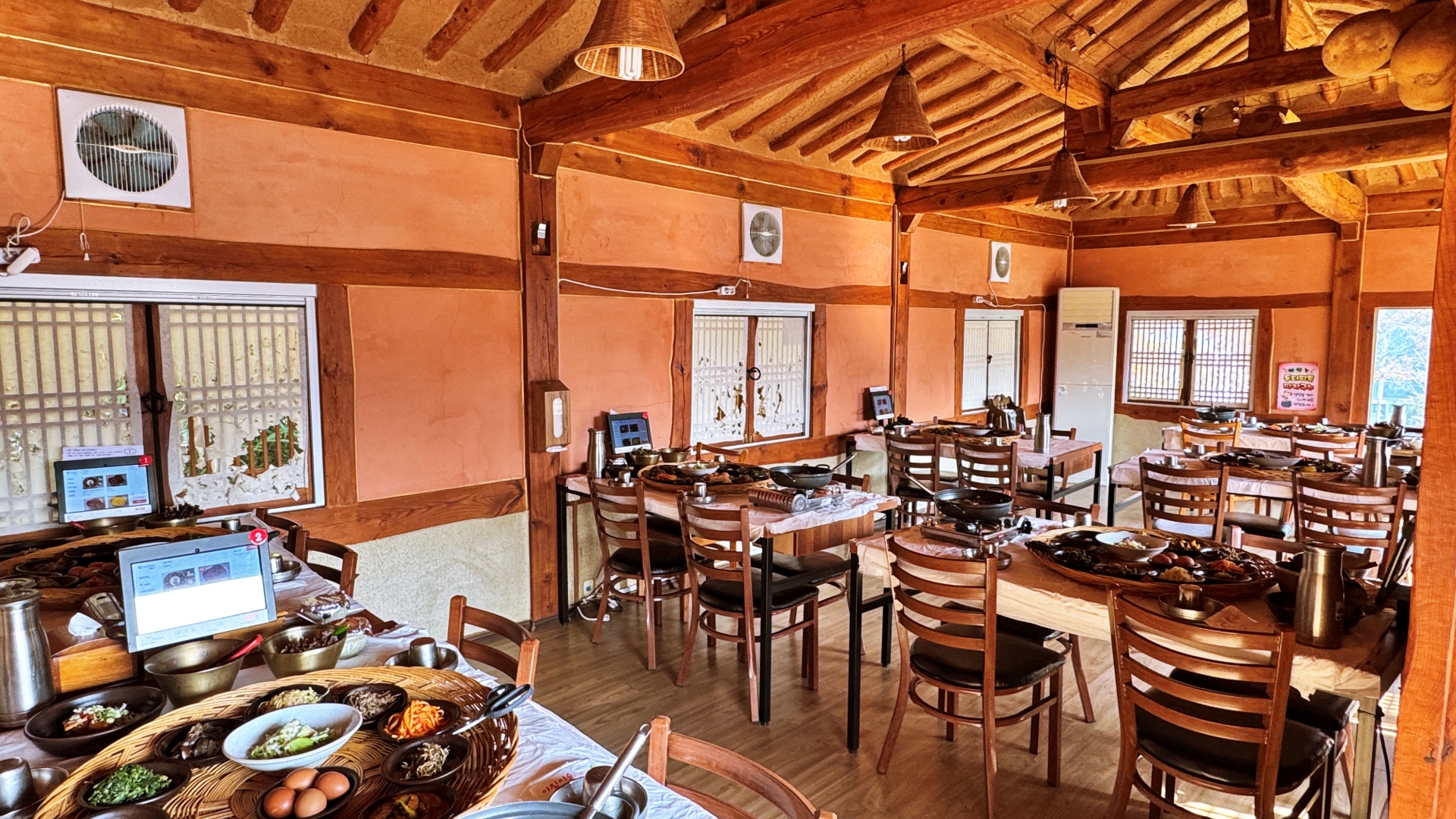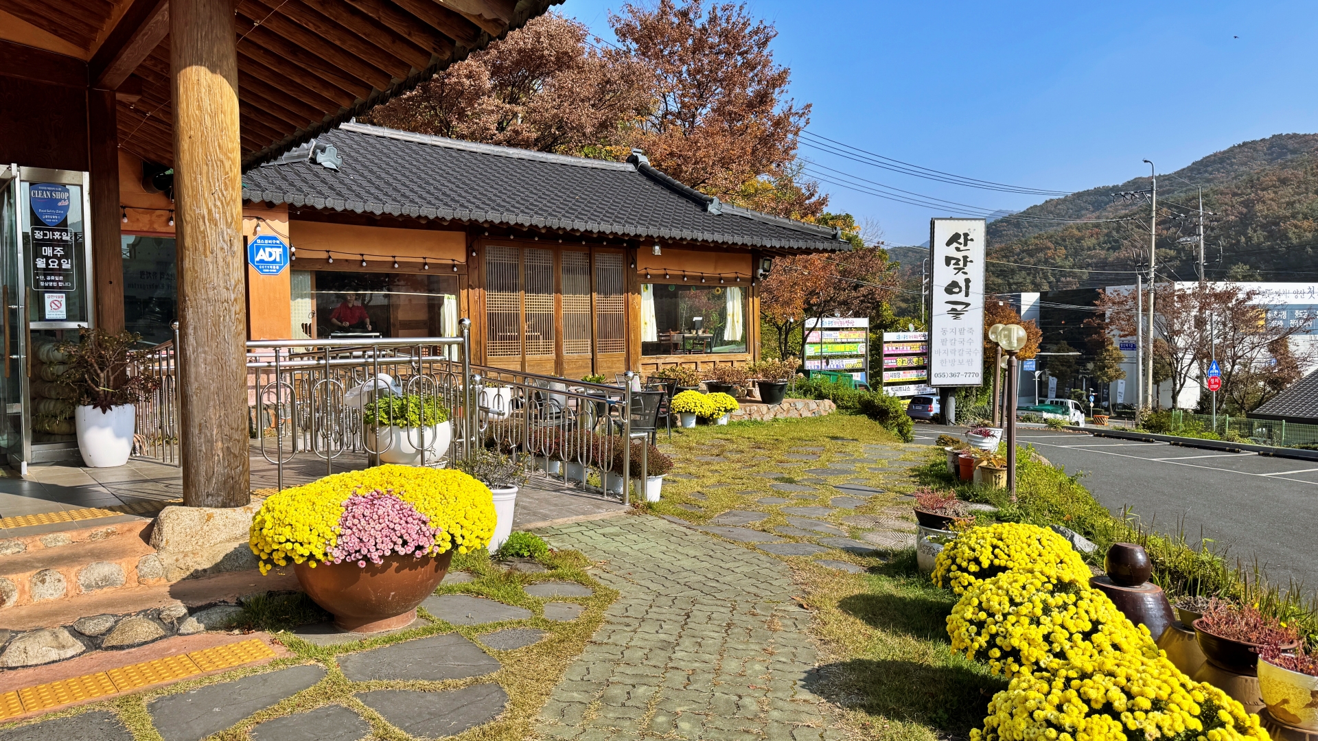 '산맞이골'은 한식 전문점답게 외관이 멋스러운 한옥이다. 아늑한 분위기의 실내는 입식, 좌식 테이블, 개별 룸으로 이루어져 가족 모임에 적합하다.