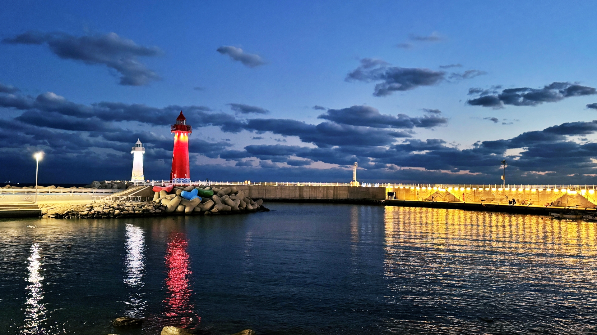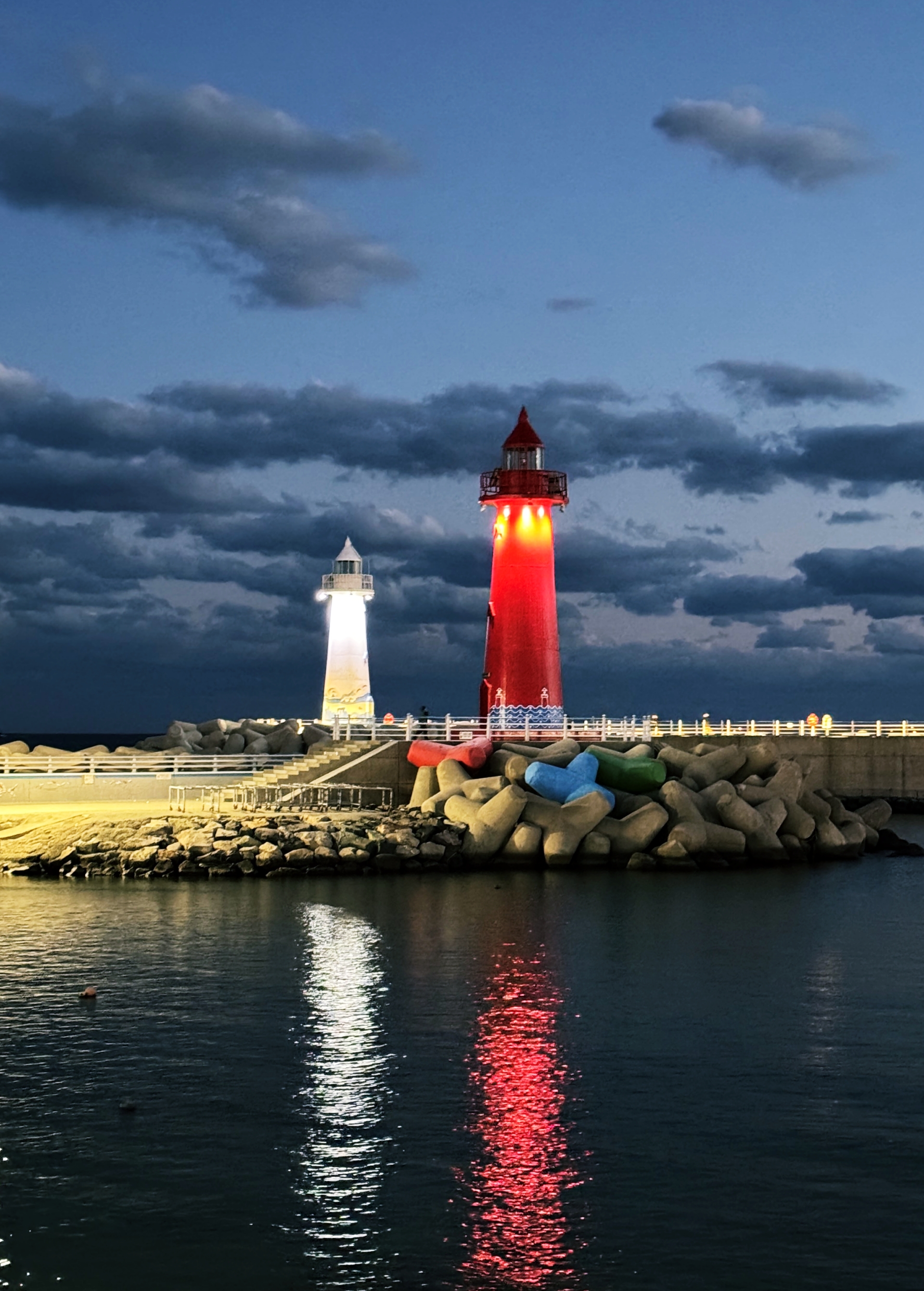 청사포 등대는 쌍둥이 등대다. 뭍에서 보면 오른쪽이 흰 등대고 왼쪽이 붉은 등대다. 명칭은 청사포어항 남·북 방파제등대. 등대가 두 군데인 만큼 방파제도 두 군데다.