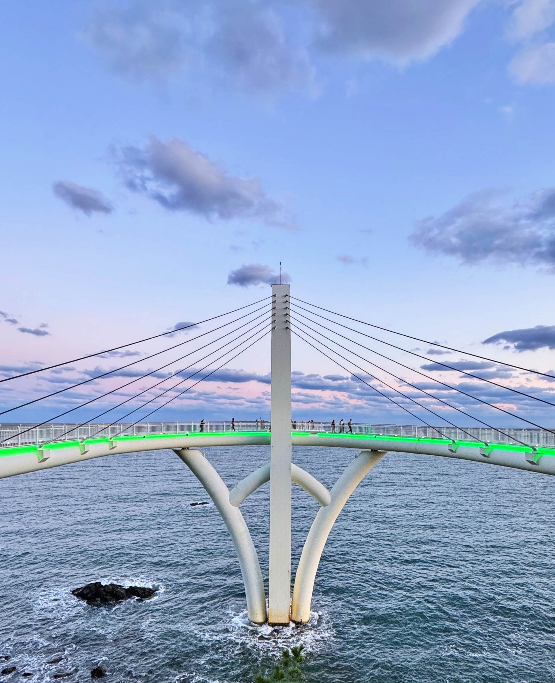 해와 달이 함께 만나며 풍광을 누린다는 이름을 가진 해월전망대는 해수면으로부터 22m 높이에 134m 길이로 바다를 향해 원형으로 이루어져 있으며, 초승달 모양의 주탑과 아래가 내려다 보이는 직경 15m의 원형 광장이 설치되어 있는데 마치 바다 위에 떠 있는 무대 같다.